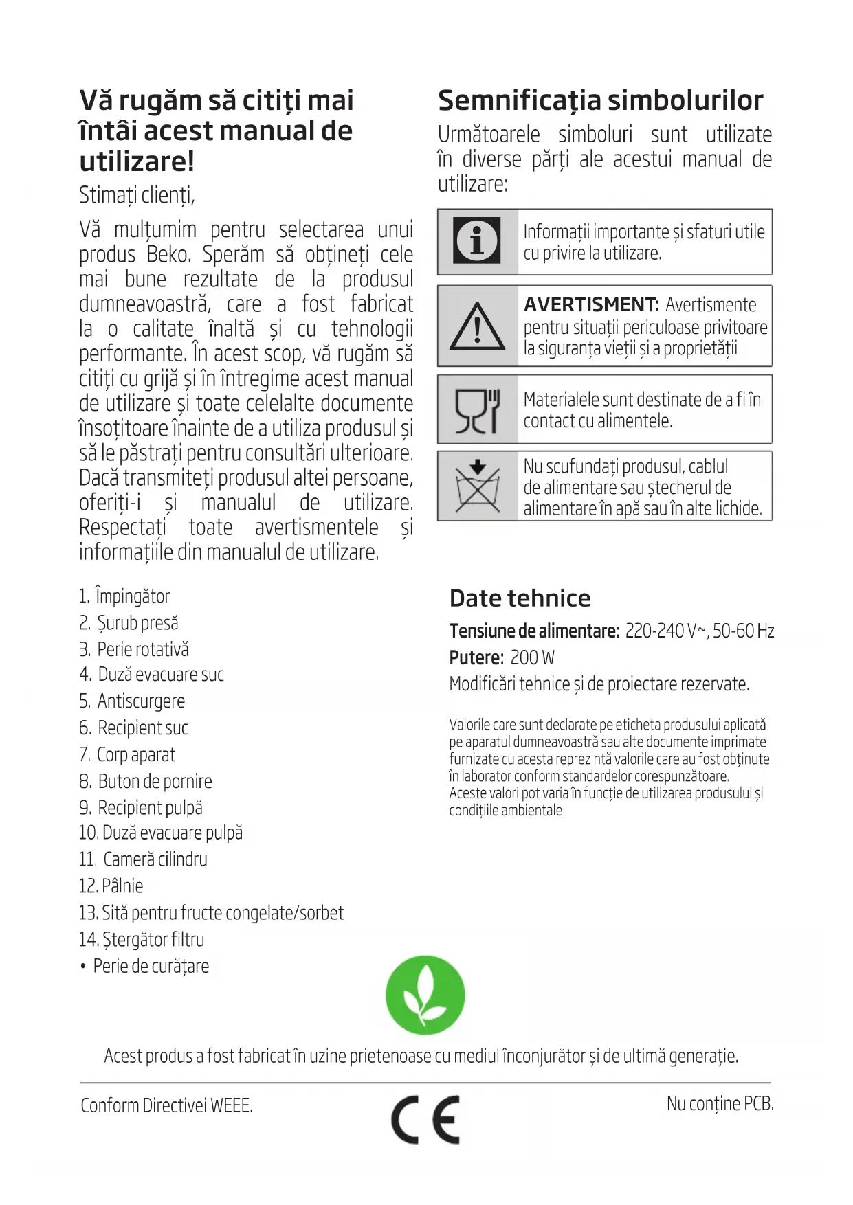 - Pentru a evita pericolul datorat unei resetări neintenționate a limitării de temperatură, acest aparat trebuie să nu fie alimentat printr-un dispozitiv extern de comutare, cum ar fi un comutator temporizat, și să nu fie conectat la un circuit care este în mod frecvent pornit și oprit de către furnizorul de energie.55 / RO Storcător / Manual de utilizare AVERTISMENT: Aparatul nu funcționează dacă brațul de blocare nu este închis. AVERTISMENT: Sâmburii duri pot strica filtrul. AVERTISMENT: Înainte de a începe extragerea sucului, porniți aparatul în gol timp de 10 secunde, înainte a a-l alimenta. Când aparatul este blocat și nu funcționează, rotiți butonul de alimentare (8) în poziția (R) timp de 5 secunde. Apoi reveniți la (1) poziția. AVERTISMENT: Atunci când stoarceți legume fibroase (cum ar fi țelina și grâulverde), vă recomandăm să curățați camera tamburului și sita pentru fructe/ legume după stoarcerea unei cantități de 200 grame de alimente. În caz contrar, eficiența de stoarcere a produsului poate să scadă. AVERTISMENT: Semnul Max. de pe camera tamburului nu trebuie depășit. Dacă semnul Max. este depășit, sucul extras se va revărsa.2.1 Sită pentru fructe congelate/sorbet Înainte de începerea preparării: tăiați fructele pe care le veți folosi (kiwi, căpșuni, banane etc.) în bucăți mici și apoi le congelați În timpul preparării sorbetului din fructe congelate, ingredientele pe care le-ați procesat vor curge prin gura de evacuare pentru pulpă. AVERTISMENT: Fructele care sunt scoase din congelator trebuie ținute la temperatura camerei timp de 15 -20 minute. 2 Utlzarea56 / RO Storcător / Manual de utilizare3.1 Curăţarea și întreţinerea AVERTISMENT: Nu utilizați niciodată solvenți pe bază de petrol, substanțe abrazive, obiecte metalice sau perii dure pentru a curăța produsul. AVERTISMENT: Nu introduceți niciodată produsul sau cablul de alimentare în apă sau alt lichid. Este mai ușor să curățați aparatul imediat după utilizarea acestuia. AVERTISMENT: Nu spălați componentele în mașina de spălat vase.3.2 Depozitare1. Dacă nu intenționați să folosiți aparatul pentru mai mult timp, atunci depozitați-l cu grijă.2. Scoateți aparatul din priză înainte să îl ridicați.3. Depozitați aparatul într-un loc rece și uscat.4. Nu țineți aparatul la îndemâna copiilor.3.3 Manipulare și transport1. În timpul manipulării și transportului păstrați aparatul în ambalajul său original. Ambalajul protejează aparatul împotriva deteriorărilor fizice.2. Nu amplasați greutăți pe aparat sau pe ambalaj.3. Aparatul poate fi deteriorat.4. Dacă scăpați aparatul pe jos, acesta poate deveni nefuncțional sau poate să se defecteze definitiv.Consultați ultima pagină a manualului de utilizare pentru secțiunea inițială, secțiunea generală și secțiunea de curățare. 3 Informaţ 3.4 Conform Directivei WEEE şi de eliminare a produselor rezidualeAcest produs a fost fabricat cu componente şi materiale de înaltă calitate care pot fi reutilizate şi sunt potrivite pentru reciclare.Aşadar, nu eliminaţi produsul împreună cu gunoiul menajer la sfârşitul duratei de viață a acestuia. Duceţi-l la un centru de colectare pentru reciclarea echipamentelor electrice şi electronice. Acesta este indicat de către simbolul de pe produs, în instrucţiunile pentru utilizare şi pe ambalaje.Vă rugăm să contactaţi autoritatea locală pentru a afla unde este cel mai apropiat punct de colectare.Ajutaţi în protejarea mediului prin reciclarea produselor utilizate.3.5 Informaţii despre ambalare Ambalajul utilizat pentru produs este fabricat din materiale reciclabile. Asigurați-vă că materialele de ambalare sunt eliminate conform reglementărilor locale aplicabile pentru a include materialele în procesul de reciclare pentru protecția mediului înconjurător.3.6 Conformitatea cu Directiva RoHSProdusul pe care l-ați achiziționat este conform cu Directiva RoHS UE (2011/65/UE). Nu conține materiale periculoase și interzise specificate în această Directivă.CERTIFICAT DE GARANŢIE Tensiune de alimentare/frecvenţă: 230V/50Hz Model / Serie: TIP: Electrocasnice mici de bucătărie - 3 ani Cuptor cu microunde - 3 ani Fier de călcat - 2 ani Staţie de călcat - 2 ani Aspirator - 2 ani Importator: ARCTIC S.A., Găeşti, Dâmboviţa, str. 13 Decembrie nr. 210, email: oce@arctic.ro Durata medie de utilizare a produselor BEKO este de 5 ani! Perioada de garanţie legală de conformitate este de 2 ani de la intrarea produsului în posesia consumatorului. Perioada de garanţie comercială este de 3 ani de la intrarea produsului în posesia consumatorului , include și perioada de garanţie legală de conformitate și se acordă pentru următoarele categorii: Electrocasnice mici de bucătărie și Cuptoare cu microunde.