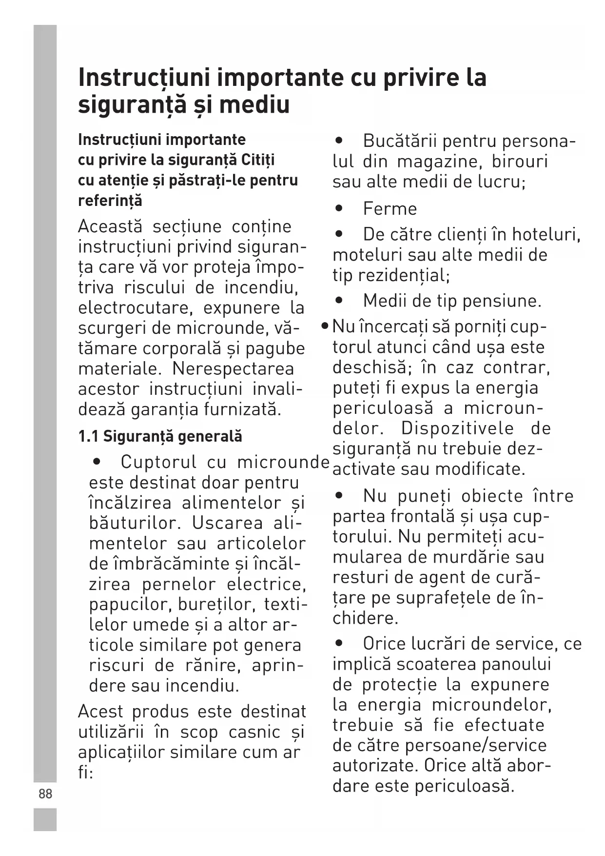 (på grunn av en hindring foran døren, lav spenning el.l.) Koble den fra. Koble til igjen etter 10 sekunder.88 Instrucțiuni importante cu privire la siguranță și mediu Instrucțiuni importante cu privire la siguranță Citiți cu atenție și păstrați-le pentru referință Această secțiune conține instrucțiuni privind siguran- ța care vă vor proteja împo- triva riscului de incendiu, electrocutare, expunere la scurgeri de microunde, vă- tămare corporală și pagube materiale. Nerespectarea acestor instrucțiuni invali- dează garanția furnizată.