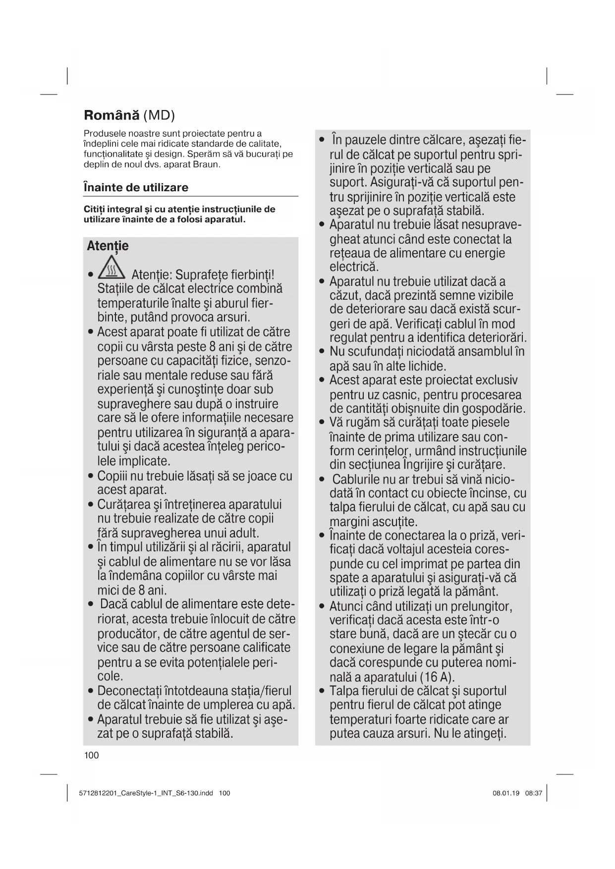 Atenţie: Deoarece acest fier de călcat deţine o putere ridicată, asigu- raţi-vă că sursa de curent pe care o aveţi la dispoziţie este corespun- zătoare. Contactaţi furnizorul local de energie electrică pentru a vă asigura că impedanţa curentului electric nu este mai mare de 0.372 Ohm. 5712812201_CareStyle-1_INT_S6-130.indd 1015712812201_CareStyle-1_INT_S6-130.indd 101 08.01.19 08:3708.01.19 08:37102