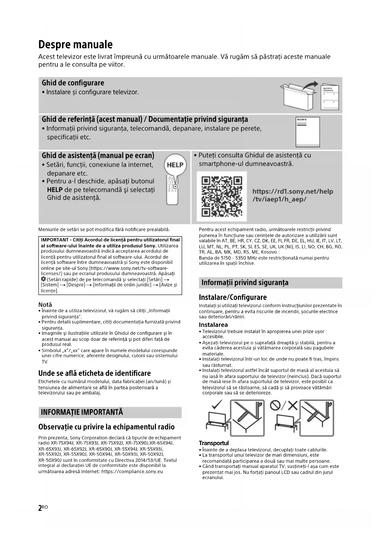 Observaţie cu privire la echipamentul radio Prin prezenta, Sony Corporation declară că tipurile de echipament radio XR-75X94J, XR-75X93J, XR-75X92J, XR-75X90J,XR-65X94J, XR-65X93J, XR-65X92J, XR-65X90J, XR-55X94J, XR-55X93J, XR-55X92J, XR-55X90J, XR-50X94J, XR-50X93J, XR-50X92J, XR-50X90J sunt în conformitate cu Directiva 2014/53/UE. Textul integral al declarației UE de conformitate este disponibil la următoarea adresă internet: https://compliance.sony.euPentru acest echipament radio, următoarele restricţii privind punerea în funcţiune sau cerinţele de autorizare a utilizării sunt valabile în AT, BE, HR, CY, CZ, DK, EE, FI, FR, DE, EL, HU, IE, IT, LV, LT, LU, MT, NL, PL, PT, SK, SI, ES, SE, UK, UK (NI), IS, LI, NO, CH, BG, RO, TR, AL, BA, MK, MD, RS, ME, Kosovo :Banda de 5150 - 5350 MHz este restricţionată numai pentru utilizarea în spaţii închise. Informaţii privind siguranţa Instalare/Configurare Instalaţi și utilizaţi televizorul conform instrucţiunilor prezentate în continuare, pentru a evita riscurile de incendii, șocurile electrice sau deteriorări/răniri. Instalarea
