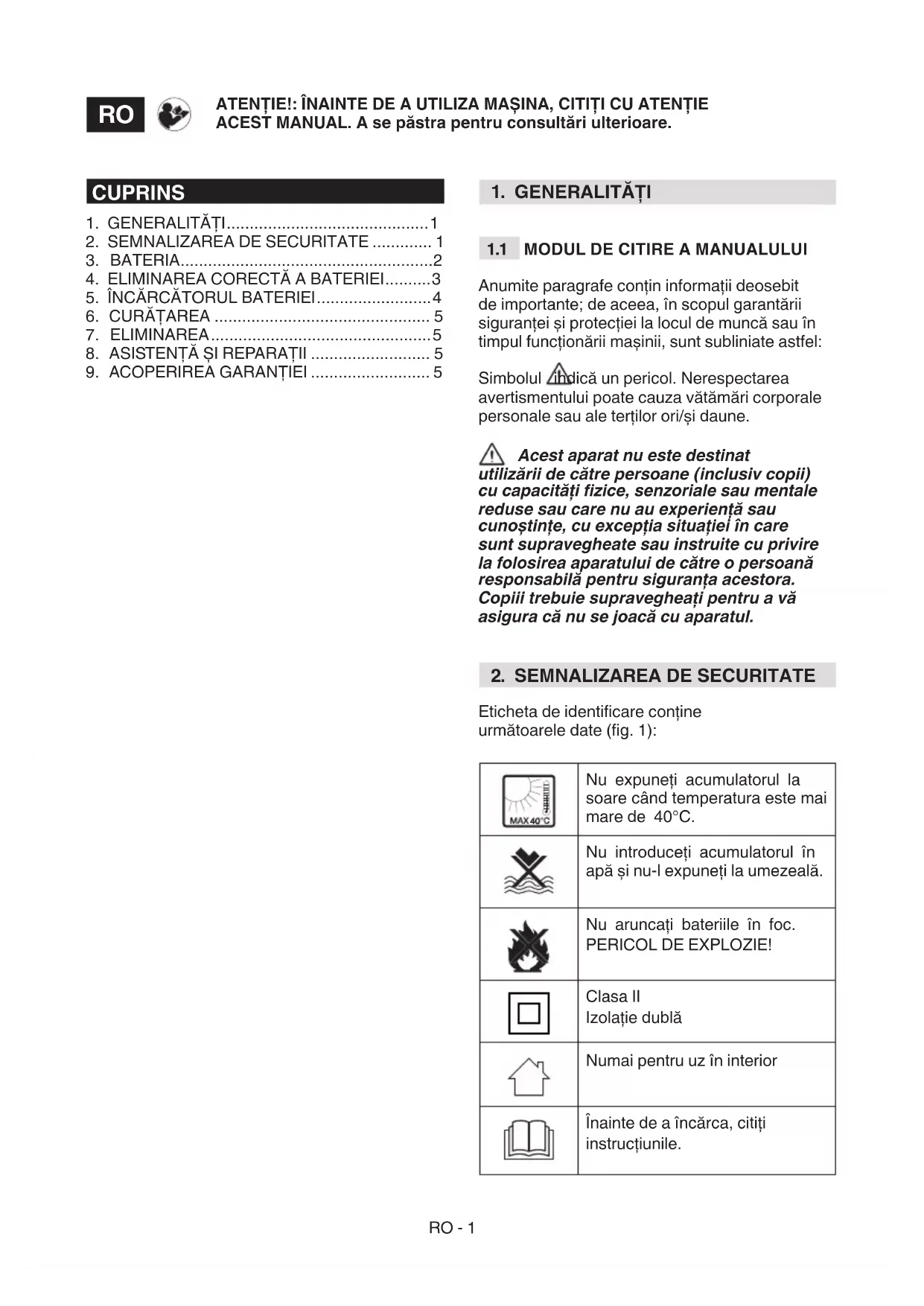 Nu expuneți acumulatorul la soare când temperatura este mai mare de 40°C. Nu introduceți acumulatorul în apă și nu-l expuneți la umezeală. Nu aruncați bateriile în foc. PERICOL DE EXPLOZIE! Clasa II Izolație dublă Numai pentru uz în interior Înainte de a încărca, citiți instrucțiunile. ATENŢIE!: ÎNAINTE DE A UTILIZA MAȘINA, CITIŢI CU ATENŢIE ACEST MANUAL. A se păstra pentru consultări ulterioare.