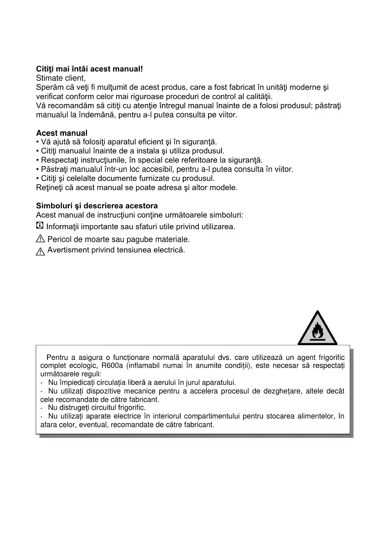 - Citiţi şi celelalte documente furnizate cu produsul. Reţineţi că acest manual se poate adresa şi altor modele. Simboluri şi descrierea acestora Acest manual de instrucţiuni conţine următoarele simboluri: Informaţii importante sau sfaturi utile privind utilizarea. Pericol de moarte sau pagube materiale. Avertisment privind tensiunea electrică. Pentru a asigura o funcționare normală aparatului dvs. care utilizează un agent frigorific complet ecologic, R600a (inflamabil numai în anumite condiții), este necesar să respectați următoarele reguli: Nu împiedicați circulația liberă a aerului în jurul aparatului. Nu utilizați dispozitive mecanice pentru a accelera procesul de dezghețare, altele decât cele recomandate de către fabricant. Nu distrugeți circuitul frigorific. Nu utilizați aparate electrice în interiorul compartimentului pentru stocarea alimentelor, în afara celor, eventual, recomandate de către fabricant.CUPRINS 2 RO 1 Frigiderul 3 2 Avertismente importante privind siguranţa 4 Destinaţia produsului........................ 4 Informaţii generale privind siguranţa........................................... 4 Pentru produsele cu water dispenser……………………………... 6 Siguranţa copiilor.............................. 6 Informaţii privind reciclarea deşeurilor …………………………… 6 Avertisment HCA………………..…… 7 Modalităţi de reducere a consumului de energie...................... 7 3 Instalarea 8 Instrucţiuni pentru transportul ulterior al frigiderului..................................... 8 Înainte de a utiliza frigiderul.............. 8 Conexiunea electrică........................ 8 Îndepărtarea ambalajului................... 9 Depozitarea la deşeuri a frigiderului vechi............................... 9 Amplasarea şi instalarea.................... 9 Înlocuirea becului interior.................. 9 Ajustarea picioarelor ……………….. 9 4 Pregãtirea 10 5 Utlizarea frigiderului 11 Reglarea temperaturilor …............... 11 Sistem de rãcire dublu……………… 11 Reversibilitatea uşilor....................... 12 Congelarea produselor proaspete … 13 Recomandări pentru conservarea alimentelor congelate .. 14 Dezghețarea ………………………… 14 Plasarea produselor alimentare …… 14 Informații pentru congelare ……….. 15 Recomandări pentru compartimentul de alimente proaspete ……………. 15 6 Întreţinere şi curăţare 16 Protejarea suprafeţelor din plastic… 16 7 Soluţii recomandate pentru probleme 17Frigiderul
