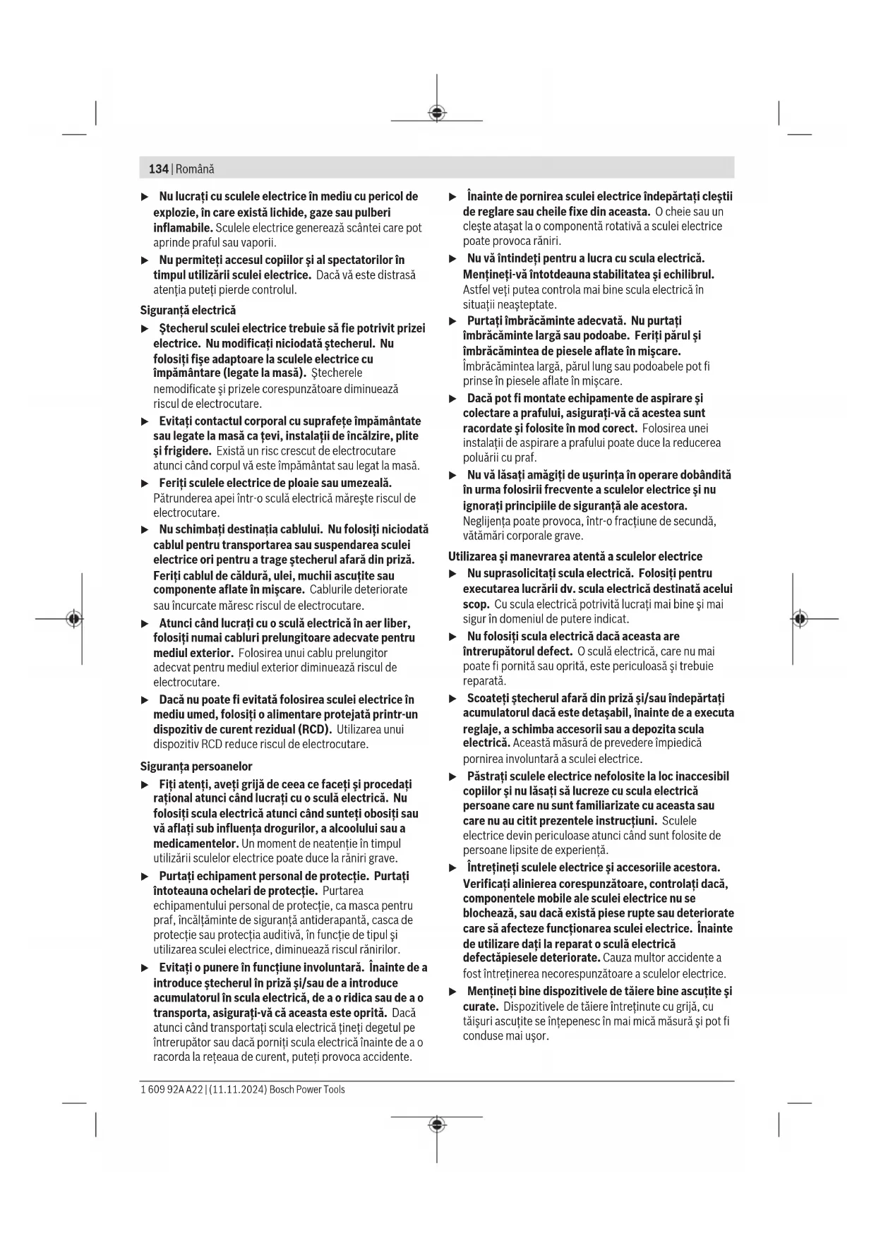 Аккумуляторлар/батареялар: Литий-иондық: Тасымалдау бөліміндегі нұсқауларды орындаңыз (қараңыз „Тасымалдау“, Бет133). Română Instrucţiuni de siguranţă Instrucţiuni generale de siguranţă pentru scule electrice AVERTIS- MENT Citiţi toate avertizările, instrucţiunile, ilustraţiile şi specificaţiile puse la dispoziţie împreună cu această sculă electrică. Nerespectarea instrucţiunilor menţionate mai jos poate duce la electrocutare, incendiu şi/sau vătămări corporale grave. Păstraţi toate indicaţiile de avertizare şi instrucţiunile în vederea utilizărilor viitoare. Termenul "sculă electrică" folosit în indicaţiile de avertizare se referă la sculele electrice alimentate de la reţea (cu cablu de alimentare) sau la sculele electrice cu acumulator (fără cablu de alimentare). Siguranţa la locul de muncă u Menţineţi‑vă sectorul de lucru curat şi bine iluminat. Dezordinea sau sectoarele de lucru neluminate pot duce la accidente. Bosch Power Tools 1 609 92A A22 | (11.11.2024)134 | Română u Nu lucraţi cu sculele electrice în mediu cu pericol de explozie, în care există lichide, gaze sau pulberi inflamabile. Sculele electrice generează scântei care pot aprinde praful sau vaporii. u Nu permiteţi accesul copiilor şi al spectatorilor în timpul utilizării sculei electrice. Dacă vă este distrasă atenţia puteţi pierde controlul. Siguranţă electrică u Ştecherul sculei electrice trebuie să fie potrivit prizei electrice. Nu modificaţi niciodată ştecherul. Nu folosiţi fişe adaptoare la sculele electrice cu împământare (legate la masă). Ştecherele nemodificate şi prizele corespunzătoare diminuează riscul de electrocutare. u Evitaţi contactul corporal cu suprafeţe împământate sau legate la masă ca ţevi, instalaţii de încălzire, plite şi frigidere. Există un risc crescut de electrocutare atunci când corpul vă este împământat sau legat la masă. u Feriţi sculele electrice de ploaie sau umezeală. Pătrunderea apei într‑o sculă electrică măreşte riscul de electrocutare. u Nu schimbaţi destinaţia cablului. Nu folosiţi niciodată cablul pentru transportarea sau suspendarea sculei electrice ori pentru a trage ştecherul afară din priză. Feriţi cablul de căldură, ulei, muchii ascuţite sau componente aflate în mişcare. Cablurile deteriorate sau încurcate măresc riscul de electrocutare. u Atunci când lucraţi cu o sculă electrică în aer liber, folosiţi numai cabluri prelungitoare adecvate pentru mediul exterior. Folosirea unui cablu prelungitor adecvat pentru mediul exterior diminuează riscul de electrocutare. u Dacă nu poate fi evitată folosirea sculei electrice în mediu umed, folosiţi o alimentare protejată printr-un dispozitiv de curent rezidual (RCD). Utilizarea unui dispozitiv RCD reduce riscul de electrocutare. Siguranţa persoanelor u Fiţi atenţi, aveţi grijă de ceea ce faceţi şi procedaţi raţional atunci când lucraţi cu o sculă electrică. Nu folosiţi scula electrică atunci când sunteţi obosiţi sau vă aflaţi sub influenţa drogurilor, a alcoolului sau a medicamentelor. Un moment de neatenţie în timpul utilizării sculelor electrice poate duce la răniri grave. u Purtaţi echipament personal de protecţie. Purtaţi întoteauna ochelari de protecţie. Purtarea echipamentului personal de protecţie, ca masca pentru praf, încălţăminte de siguranţă antiderapantă, casca de protecţie sau protecţia auditivă, în funcţie de tipul şi utilizarea sculei electrice, diminuează riscul rănirilor. u Evitaţi o punere în funcţiune involuntară. Înainte de a introduce ştecherul în priză şi/sau de a introduce acumulatorul în scula electrică, de a o ridica sau de a o transporta, asiguraţi‑vă că aceasta este oprită. Dacă atunci când transportaţi scula electrică ţineţi degetul pe întrerupător sau dacă porniţi scula electrică înainte de a o racorda la reţeaua de curent, puteţi provoca accidente. u Înainte de pornirea sculei electrice îndepărtaţi cleştii de reglare sau cheile fixe din aceasta. O cheie sau un cleşte ataşat la o componentă rotativă a sculei electrice poate provoca răniri. u Nu vă întindeţi pentru a lucra cu scula electrică. Menţineţi-vă întotdeauna stabilitatea şi echilibrul. Astfel veţi putea controla mai bine scula electrică în situaţii neaşteptate. u Purtaţi îmbrăcăminte adecvată. Nu purtaţi îmbrăcăminte largă sau podoabe. Feriţi părul şi îmbrăcămintea de piesele aflate în mişcare. Îmbrăcămintea largă, părul lung sau podoabele pot fi prinse în piesele aflate în mişcare. u Dacă pot fi montate echipamente de aspirare şi colectare a prafului, asiguraţi‑vă că acestea sunt racordate şi folosite în mod corect. Folosirea unei instalaţii de aspirare a prafului poate duce la reducerea poluării cu praf. u Nu vă lăsaţi amăgiţi de uşurinţa în operare dobândită în urma folosirii frecvente a sculelor electrice şi nu ignoraţi principiile de siguranţă ale acestora. Neglijenţa poate provoca, într-o fracţiune de secundă, vătămări corporale grave. Utilizarea şi manevrarea atentă a sculelor electrice u Nu suprasolicitaţi scula electrică. Folosiţi pentru executarea lucrării dv. scula electrică destinată acelui scop. Cu scula electrică potrivită lucraţi mai bine şi mai sigur în domeniul de putere indicat. u Nu folosiţi scula electrică dacă aceasta are întrerupătorul defect. O sculă electrică, care nu mai poate fi pornită sau oprită, este periculoasă şi trebuie reparată. u Scoateţi ştecherul afară din priză şi/sau îndepărtaţi acumulatorul dacă este detaşabil, înainte de a executa reglaje, a schimba accesorii sau a depozita scula electrică. Această măsură de prevedere împiedică pornirea involuntară a sculei electrice. u Păstraţi s