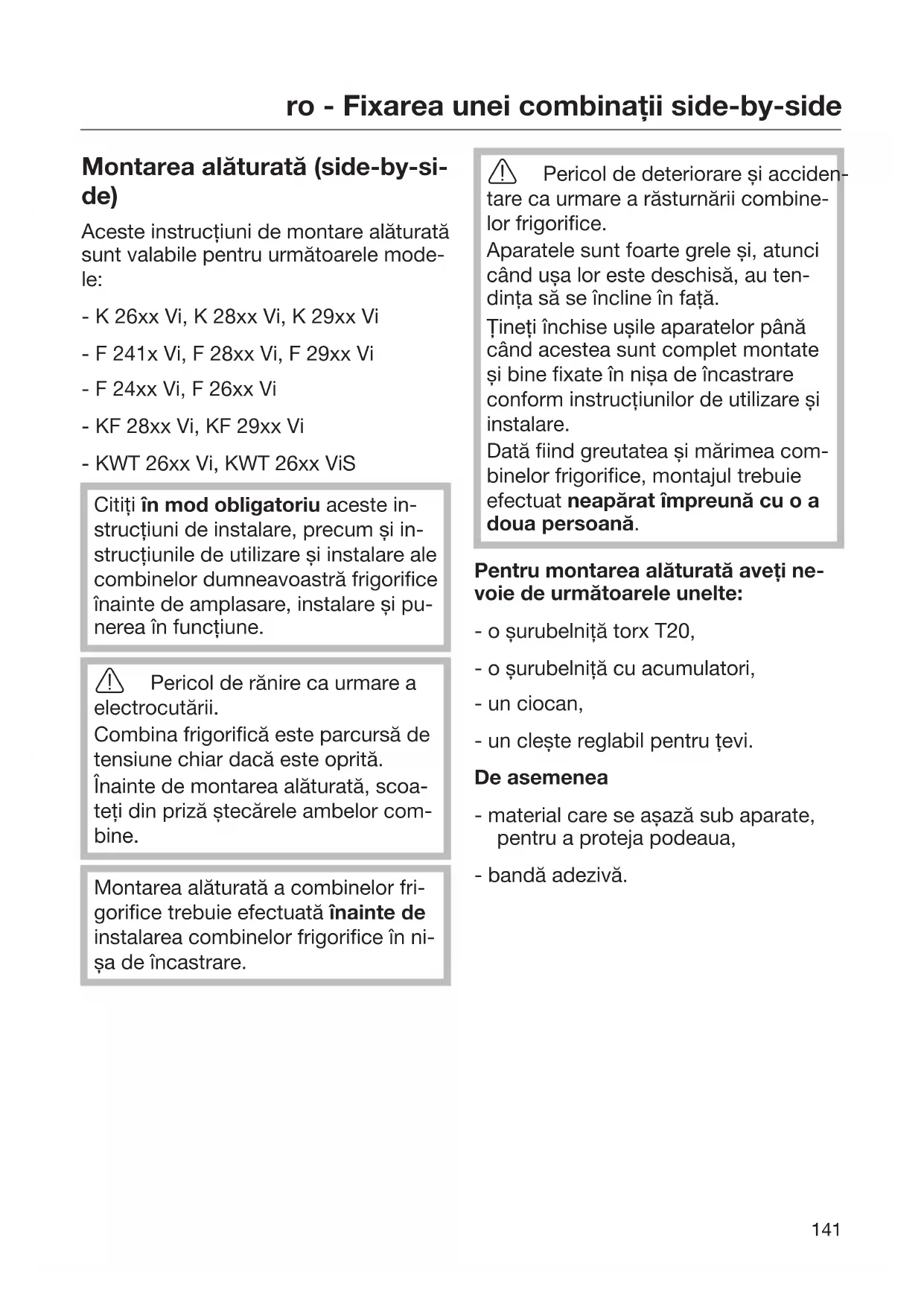 Montarea alăturată (side-by-si- de) Aceste instrucțiuni de montare alăturată sunt valabile pentru următoarele mode- le: - K 26xx Vi, K 28xx Vi, K 29xx Vi - F 241x Vi, F 28xx Vi, F 29xx Vi - F 24xx Vi, F 26xx Vi - KF 28xx Vi, KF 29xx Vi - KWT 26xx Vi, KWT 26xx ViS Citiți în mod obligatoriu aceste in- strucțiuni de instalare, precum și in- strucțiunile de utilizare și instalare ale combinelor dumneavoastră frigorifice înainte de amplasare, instalare și pu- nerea în funcțiune. Pericol de rănire ca urmare a electrocutării. Combina frigorifică este parcursă de tensiune chiar dacă este oprită. Înainte de montarea alăturată, scoa- teți din priză ștecărele ambelor com- bine. Montarea alăturată a combinelor fri- gorifice trebuie efectuată înainte de instalarea combinelor frigorifice în ni- șa de încastrare. Pericol de deteriorare și acciden- tare ca urmare a răsturnării combine- lor frigorifice. Aparatele sunt foarte grele și, atunci când ușa lor este deschisă, au ten- dința să se încline în față. Țineți închise ușile aparatelor până când acestea sunt complet montate și bine fixate în nișa de încastrare conform instrucțiunilor de utilizare și instalare. Dată fiind greutatea și mărimea com- binelor frigorifice, montajul trebuie efectuat neapărat împreună cu o a doua persoană. Pentru montarea alăturată aveți ne- voie de următoarele unelte: - o șurubelniță torx T20, - o șurubelniță cu acumulatori, - un ciocan, - un clește reglabil pentru țevi. De asemenea - material care se așază sub aparate, pentru a proteja podeaua, - bandă adezivă.ro - Fixarea unei combinații side-by-side
