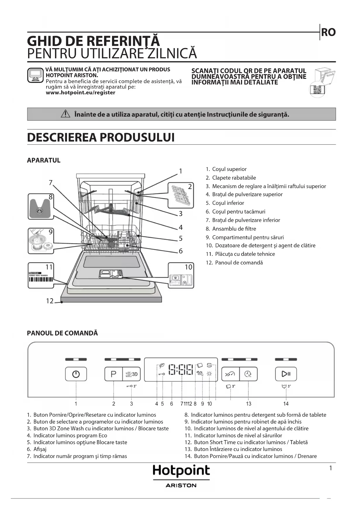 VĂ MULŢUMIM CĂ AŢI ACHIZIŢIONAT UN PRODUS HOTPOINT ARISTON.Pentru a beneficia de servicii complete de asistenţă, vă rugăm să vă înregistraţi aparatul pe: www.hotpoint.eu/register Înainte de autiliza aparatul, citiţi cu atenţie Instrucţiunile de siguranţă. SCANAŢI CODUL QR DE PE APARATUL