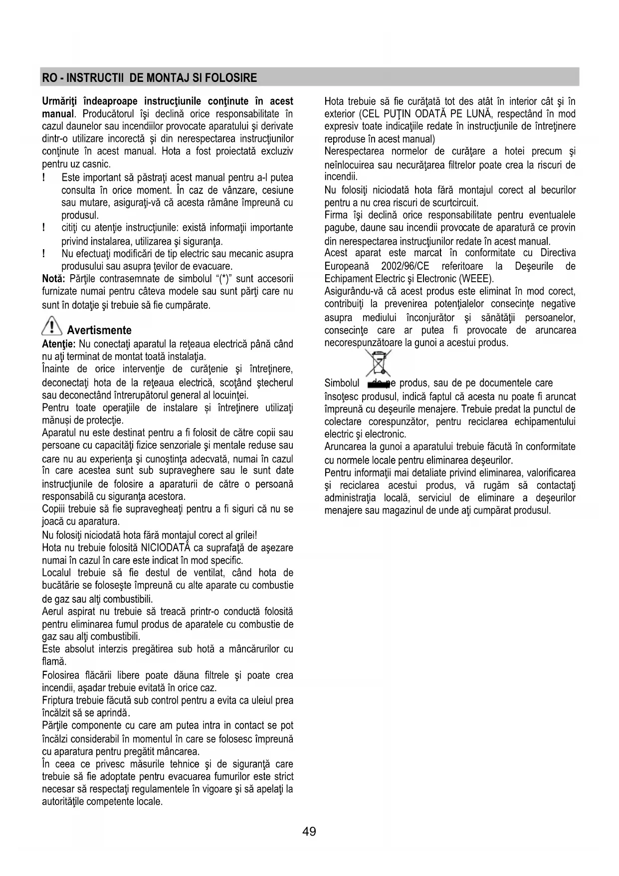 microprocesorul va începe iar să numere cele 120 de ore necesare pentru a vă da mesajul de avertisment. Întreţinerea Atenţie! Înainte de orice intervenţie de curăţenie şi întreţinere, deconectaţi hota de la reţeaua electrică, scoţând ştecherul sau deconectând întrerupătorul general al locuinţei. Curăţarea Hota trebuie curăţată frecvent (cel puţin cu aceeaşi frecvenţă cu care se curăţă filtrele anti-grăsime), fie în interior cât şi în exterior. Pentru curăţare folosiţi un material îmbibat cu detergenţi lichizi neutri. Evitaţi folosirea produselor pe bază de abrazivi NU FOLOSIŢI ALCOOL! Atenţie: Nerespectarea normelor de curăţare a hotei şi de înlocuire a filtrelor conduce la potenţiale riscuri de incendii. Vă sfătuim să respectaţi îndeaproape instrucţiunile prezente în acest manual. Producătorul îşi declină orice responsabilitate în cazul daunelor la motor sau incendiilor provocate aparatului şi derivate dintr-o utilizare sau întreţinere incorectă precum şi din nerespectarea instrucţiunilor conţinute în acest manual. Filtru anti-grăsimi Fig. 12 Captează particulele de grăsime care apar în timpul pregătirii alimentelor. Trebuie curăţat o dată pe lună cu detergenţi neabrazivi, manual sau utilizând maşina de spălat vase, la temperaturi scăzute şi folosind un program scurt. Filtrul metalic anti-grăsimi, spălat cu maşina de spălat vase se poate decolora, dar nu-şi va pierde caracteristicile de filtrare. Filtru de cărbune (numai pentru versiunea filtrantă) Fig. 13 Reţine mirosurile neplăcute, derivate în urma procesului de coacere. Saturaţia filtrului de cărbune depinde de folosirea mai mult sau mai puţin prelungită a tipului de maşina de gătit precum şi de curăţarea regulară a filtrului pentru grăsime. În orice caz, cartuşul filtrului trebuie înlocuit cel mult la fiecare patru luni. NU-l spălaţi sau refolosiţi Înlocuirea becurilor Fig. 14 Deconectaţi hota de la reţeaua electrică. Atenţie! Înainte de a atinge becurile, asiguraţi-vă că nu au o temperatură ridicată. Dacă plafoniera nu se aprinde, controlaţi dacă aţi introdus bine becurile înainte de a chema Asistenţa tehnică.52 BG - Инструкции за монтаж и употреба Придържайте се стриктно към тук посочените инструкции. Фирмата не носи отговорност за евентуални неизправности, повреди или възпламеняване на уреда, възникнали в резултат на неспазване на инструкциите в настоящото упътване. Аспираторът е предназначен само за битова употреба. ! Съветваме Ви да съхранявате настоящото упътване за да може да го използвате във всеки един момент. При продажба, отдаване под наем или преместване, упътването за употреба трябва да остане заедно с