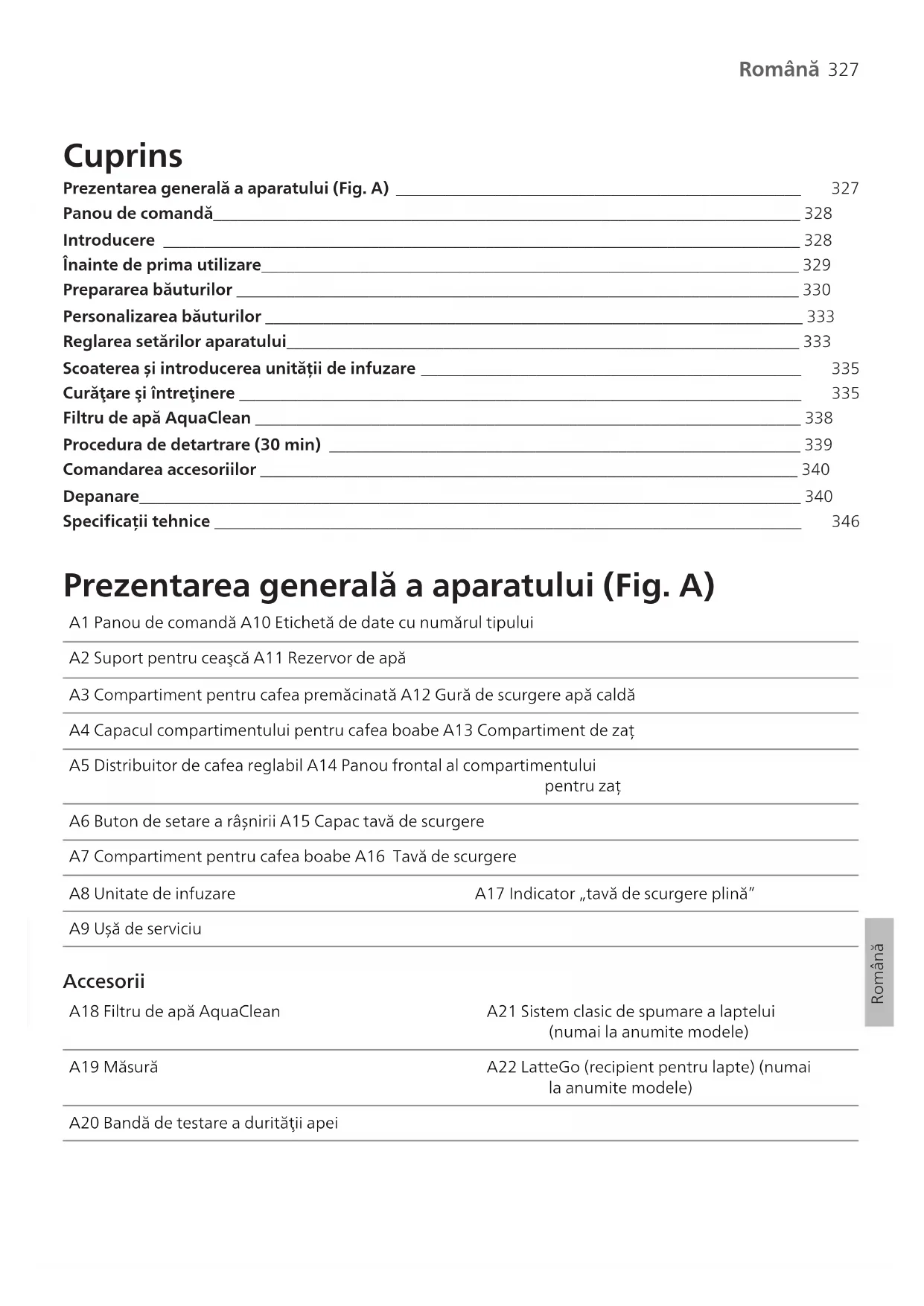 Română RomânăRomână Cuprins Prezentarea generală a aparatului (Fig. A) _________________________________________________ 327 Panou de comandă_______________________________________________________________________ 328Introducere _____________________________________________________________________________ 328Înainte de prima utilizare_________________________________________________________________ 329Prepararea băuturilor ____________________________________________________________________ 330Personalizarea băuturilor _________________________________________________________________ 333Reglarea setărilor aparatului______________________________________________________________ 333 Scoaterea și introducerea unității de infuzare ______________________________________________ 335 Curăţare şi întreţinere ____________________________________________________________________ 335 Filtru de apă AquaClean __________________________________________________________________ 338Procedura de detartrare (30 min) _________________________________________________________ 339Comandarea accesoriilor _________________________________________________________________ 340Depanare________________________________________________________________________________ 340 Specificații tehnice _______________________________________________________________________ 346 Prezentarea generală a aparatului (Fig. A) A1 Panou de comandă A10 Etichetă de date cu numărul tipuluiA2 Suport pentru ceaşcă A11 Rezervor de apăA3 Compartiment pentru cafea premăcinată A12 Gură de scurgere apă caldăA4 Capacul compartimentului pentru cafea boabe A13 Compartiment de zațA5 Distribuitor de cafea reglabil A14 Panou frontal al compartimentuluipentru zațA6 Buton de setare a râșnirii A15 Capac tavă de scurgereA7 Compartiment pentru cafea boabe A16 Tavă de scurgereA8 Unitate de infuzare A17 Indicator „tavă de scurgere plină”A9 Ușă de serviciu Accesorii A18 Filtru de apă AquaClean A21 Sistem clasic de spumare a laptelui(numai la anumite modele)A19 Măsură A22 LatteGo (recipient pentru lapte) (numaila anumite modele)A20 Bandă de testare a durităţii apei328 Română Panou de comandă Există mai multe versiuni ale acestui espressor, fiecare având panouri de comandă diferite. Fiecare versiune are propriul număr de tip. Puteți găsi numărul de tip pe eticheta de date de pe interiorul ușiței de service (Fig. A9). De asemenea, puteți găsi numărul tipului atingând pictograma Setări și selectând „Asistență”. Consultați figurile C și D pentru o prezentare generală a tuturor butoanelor și pictogramelor. Mai jos găsiți descrierea. Folosiți săgețile sus și jos pentru a desfășura ecranul și atingeți pictograma OK pentru a selecta sau a confirma alegerile. Toate tipurile (Fig. C/D/E) C1/D1/E1 Pictograme băutură cu o singură atingere C3. Pictograme de navigare (sus, jos, înapoi, ok) C6. Meniu curățare C2. Buton Start/stop C4. Afișaj C7. Profiluri personale D2/E2 Meniu cu alte băuturi C5. Setări aparat C8. Buton de pornire/oprire Numai EP4327, EP4324, EP4321 (Fig. C) C1 Pictograme băutură cu o singură atingere: Espresso, Cafea (Coffee), Americano, Caffé Crema, Ristretto, Apă fierbinte (Hot Water) și Abur (Steam) Numai EP4349, EP4346, EP4343, EP4341 (Fig. D) D1 Pictograme băutură cu o singură atingere: Espresso, Cafea (Coffee), Americano, Cappuccino, Latte Macchiato, Café au lait Numai EP5447, EP5446, EP5444, EP5443, EP5441, EP5144 (Fig.