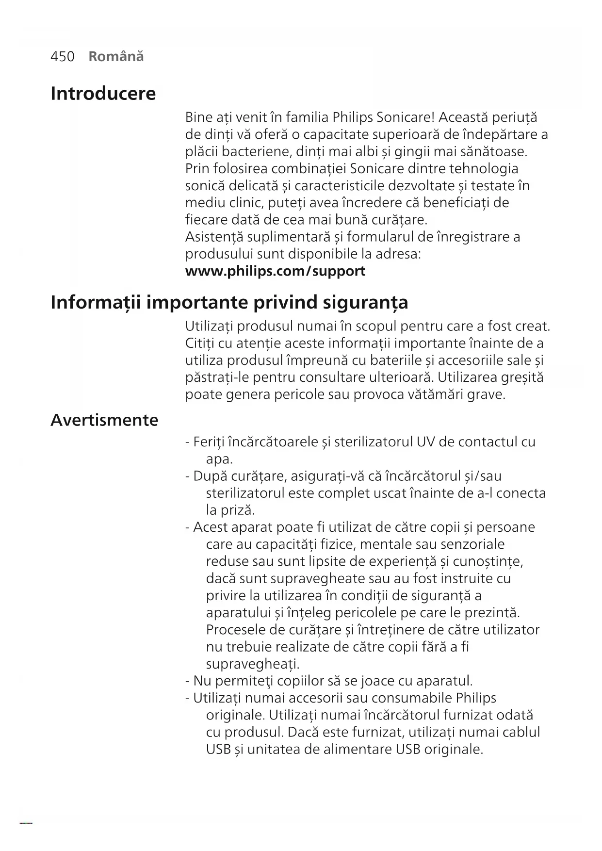 Română Introducere Bine ați venit în familia Philips Sonicare! Această periuță de dinți vă oferă o capacitate superioară de îndepărtare a plăcii bacteriene, dinți mai albi și gingii mai sănătoase. Prin folosirea combinației Sonicare dintre tehnologia sonică delicată și caracteristicile dezvoltate și testate în mediu clinic, puteți avea încredere că beneficiați de fiecare dată de cea mai bună curățare. Asistență suplimentară și formularul de înregistrare a produsului sunt disponibile la adresa: www.philips.com/support Informații importante privind siguranța Utilizați produsul numai în scopul pentru care a fost creat. Citiți cu atenție aceste informații importante înainte de a utiliza produsul împreună cu bateriile și accesoriile sale și păstrați-le pentru consultare ulterioară. Utilizarea greșită poate genera pericole sau provoca vătămări grave. Avertismente - Feriți încărcătoarele și sterilizatorul UV de contactul cu apa. - După curățare, asigurați-vă că încărcătorul și/sau sterilizatorul este complet uscat înainte de a-l conecta la priză. - Acest aparat poate fi utilizat de către copii și persoane care au capacități fizice, mentale sau senzoriale reduse sau sunt lipsite de experiență și cunoștințe, dacă sunt supravegheate sau au fost instruite cu privire la utilizarea în condiții de siguranță a aparatului și înțeleg pericolele pe care le prezintă. Procesele de curățare și întreținere de către utilizator nu trebuie realizate de către copii fără a fi supravegheați. - Nu permiteţi copiilor să se joace cu aparatul. - Utilizați numai accesorii sau consumabile Philips originale. Utilizați numai încărcătorul furnizat odată cu produsul. Dacă este furnizat, utilizați numai cablul USB și unitatea de alimentare USB originale.451 Română - Acest aparat nu conține piese care pot fi reparate de utilizator. Dacă aparatul este deteriorat, opriți utilizarea și contactați Centrul de asistență pentru clienți din țara dvs. Doar dispozitive cu cablu: Dacă cablul este deteriorat, înlocuiți încărcătorul cu sterilizator cu unul nou. - Nu utilizați încărcătorul și/sau sterilizatorul în aer liber sau în apropierea suprafețelor încălzite. - Nu spălați nicio parte componentă a produsului în mașina de spălat vase. - Acest aparat a fost conceput doar pentru curățarea dinților, gingiilor și limbii. - Nu lăsaţi niciodată sterilizatorul îndemâna copiilor. - Opriţi utilizarea sterilizatorului dacă becul cu lumină UV rămâne pornit atunci când uşa este deschisă. Lumina UV poate fi dăunătoare pentru ochi şi piele. - Utilizați sterilizatorul numai cu ecranul de protecție pe poziție. - Nu atingeți becul UV al sterilizatorului UV atunci când este fierbinte. - Întrerupeți utilizarea unui cap de periere dacă prezintă peri deformați sau îndoiți. Înlocuiți capul de periere la fiecare 3 luni sau mai des dacă apar indicii de uzură. - Evitaţi contactul direct cu produse care conţin uleiuri esenţiale sau ulei de cocos. Contactul poate conduce la dislocarea perilor. - Opriți utilizarea aparatului și consultați stomatologul/medicul dacă apar sângerări excesive după utilizare, dacă sângerarea continuă să apară după 1 săptămână de utilizare sau dacă prezentați disconfort sau durere. - Dacă ați suferit intervenții chirurgicale la gingii sau în cavitatea bucală în ultimele 2 luni, consultați medicul stomatolog înainte de a utiliza acest aparat. - Dacă aveți un stimulator cardiac sau alte dispozitive implantate, contactați medicul sau producătorul dispozitivului implantat, înainte de utilizare. - Dacă aveți probleme medicale, consultați medicul înainte de a utiliza acest aparat.452 Română - Acest aparat este un dispozitiv de îngrijire personală și nu este conceput pentru a fi utilizat de mai mulți pacienți într-un cabinet dentar sau o instituție de stomatologie. Instrucțiuni de siguranță privind bateriile - Acest aparat conține baterii care pot fi îndepărtate numai de către persoane calificate. - Utilizați produsul numai în scopul pentru care a fost creat. Citiți cu atenție aceste informații înainte de a utiliza produsul împreună cu bateriile și accesoriile sale și păstrați-le pentru consultare ulterioară. Utilizarea greșită poate genera pericole sau provoca vătămări grave. Accesoriile furnizate pot varia pentru produse diferite. - Utilizați numai accesorii și consumabile Philips originale. Utilizați numai unitatea de alimentare detașabilă TCBxxxx, HX6100, HX6110, HX6160 sau WAAxxxx. - Păstrați produsul și bateriile la distanță de foc și nu le expuneți la lumina directă a soarelui sau la temperaturi ridicate. - Dacă produsul se încălzește în mod anormal, emană un miros anormal, își schimbă culoarea sau dacă încărcarea sa durează mai mult decât de obicei, încetați utilizarea și încărcarea produsului și contactați Philips. - Nu așezați produsele și bateriile acestora în cuptoare cu microunde sau pe mașinile de gătit cu inducție. - Pentru a preveni încălzirea bateriilor sau eliberarea de substanțe toxice sau periculoase, nu deschideți, nu modificați, nu perforați, nu deteriorați și nu dezasamblați produsul sau bateria. Nu scurtcircuitați, nu supraîncărcați și nu încărcați invers bateriile. - Acest aparat conţine baterii care nu se pot înlocui. Când bateria a ajuns la sfârșitul duratei de utilizare, aparatul trebuie eliminat corespunzător, consultați secțiunea referitoare la reciclare. - Dacă bateriile sunt deteriorate sau prezintă scurgeri, evitați contactul cu pielea sau cu ochii. Dacă se întâmplă acest lucru, clătiți bine cu apă imediat și solicitați asistență medicală.453 Română - Atunci când manipulați baterii, asigurați-vă că mâinile dvs., produsul și bateriile sunt uscate. - Pentru a evita scurtcircu