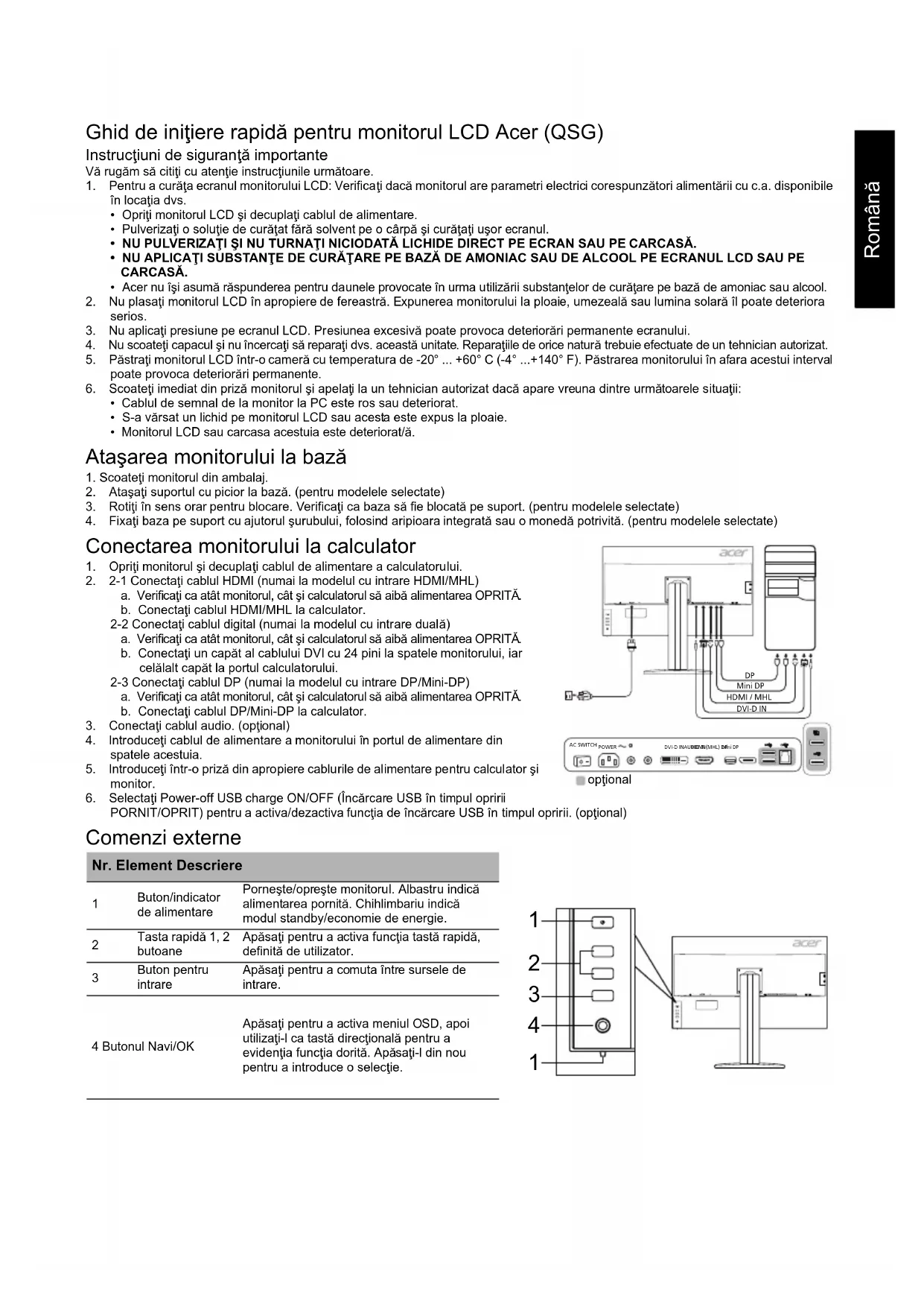 Giriş Sinyali Seçimi Otomatik Kaynak Hızlı Başlt Modu Homojenlik Şeffaflık Kısayol Atama Kayıtlı Ayar Tüm teknik özelliklerde bildirim yapılmadan değiş ikliğe gidilebilir.Română Ghid de iniţiere rapidă pentru monitorul LCD Acer (QSG) Instrucţiuni de siguranţă importante Vă rugăm să citiţi cu atenţie instrucţiunile următoare. 1. Pentru a curăţa ecranul monitorului LCD: Verificaţi dacă monitorul are parametri electrici corespunzători alimentării cu c.a. disponibile în locaţia dvs.