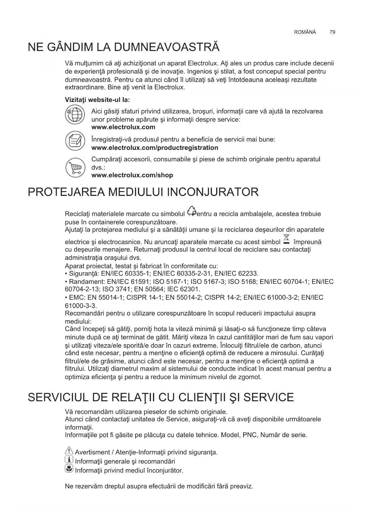 - EMC: EN 55014-1; CISPR 14-1; EN 55014-2; CISPR 14-2; EN/IEC 61000-3-2; EN/IEC 61000-3-3. Recomandări pentru o utilizare corespunzătoare în scopul reducerii impactului asupra mediului: Când începeţi să gătiţi, porniţi hota la viteză minimă şi lăsaţi-o să funcţioneze timp câteva minute după ce aţi terminat de gătit. Măriţi viteza în cazul cantităţilor mari de fum sau vapori şi utilizaţi viteza/ele sporită/e doar în cazuri extreme. Înlocuiţi filtrul/ele de carbon, atunci când este necesar, pentru a menţine o eficienţă optimă de reducere a mirosului. Curăţaţi filtrul/ele de grăsime, atunci când este necesar, pentru a menţine o eficienţă optimă a filtrului. Utilizaţi diametrul maxim al sistemului de conducte indicat în acest manual pentru a optimiza eficienţa şi pentru a reduce la minimum nivelul de zgomot. SERVICIUL DE RELAŢII CU CLIENŢII ŞI SERVICE Vă recomandăm utilizarea pieselor de schimb originale. Atunci când contactaţi unitatea de Service, asiguraţi-vă că aveţi disponibile următoarele informaţii. Informaţiile pot fi găsite pe plăcuţa cu datele tehnice. Model, PNC, Număr de serie. Avertisment / Atenţie-Informaţii privind siguranţa. Informaţii generale şi recomandări Informaţii privind mediul înconjurător. Ne rezervăm dreptul asupra efectuării de modificări fără preaviz.