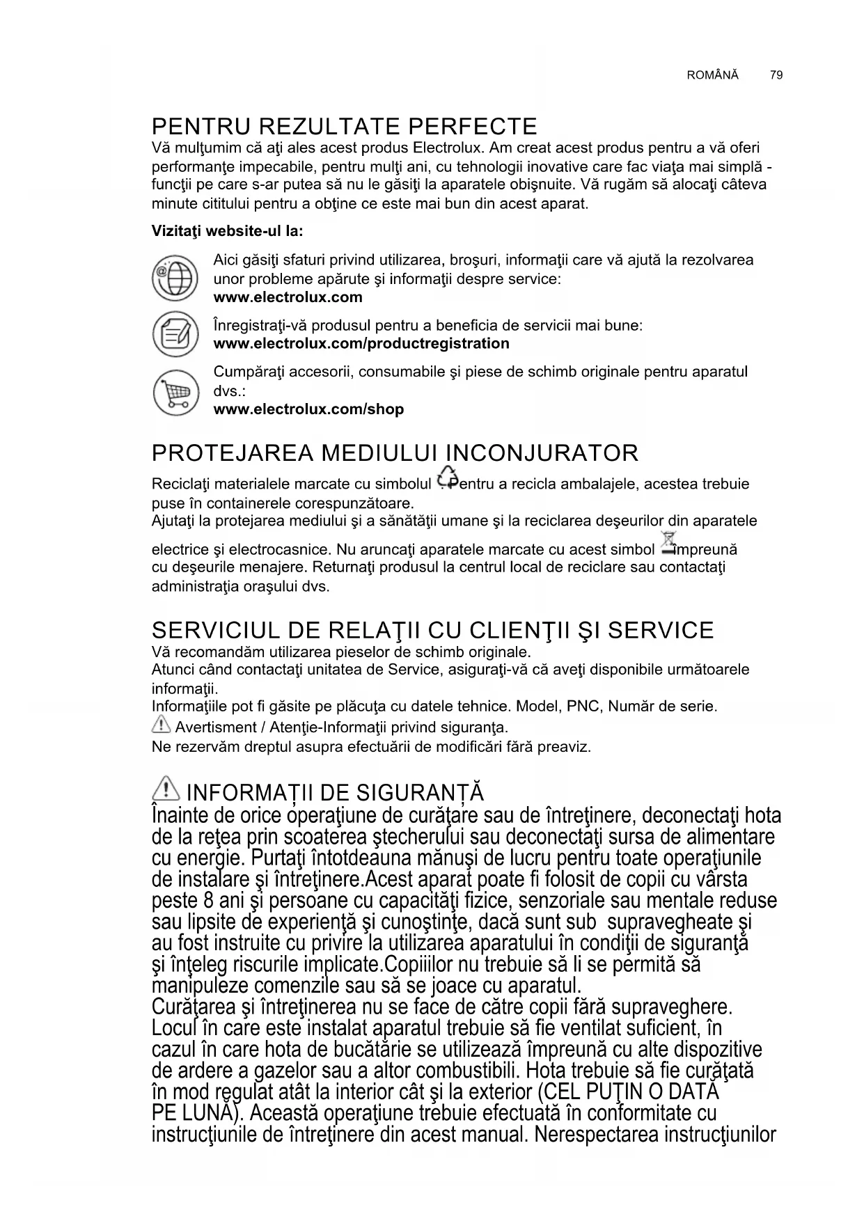 Vă mulţumim că aţi ales acest produs Electrolux. Am creat acest produs pentru a vă oferi performanţe impecabile, pentru mulţi ani, cu tehnologii inovative care fac viaţa mai simplă - funcţii pe care s-ar putea să nu le găsiţi la aparatele obişnuite. Vă rugăm să alocaţi câteva minute cititului pentru a obţine ce este mai bun din acest aparat. Vizitaţi website-ul la: Aici găsiţi sfaturi privind utilizarea, broşuri, informaţii care vă ajută la rezolvarea unor probleme apărute şi informaţii despre service: www.electrolux.com Înregistraţi-vă produsul pentru a benecia de servicii mai bune: www.electrolux.com/productregistration Cumpăraţi accesorii, consumabile şi piese de schimb originale pentru aparatul dvs: www.electrolux.com/shop
