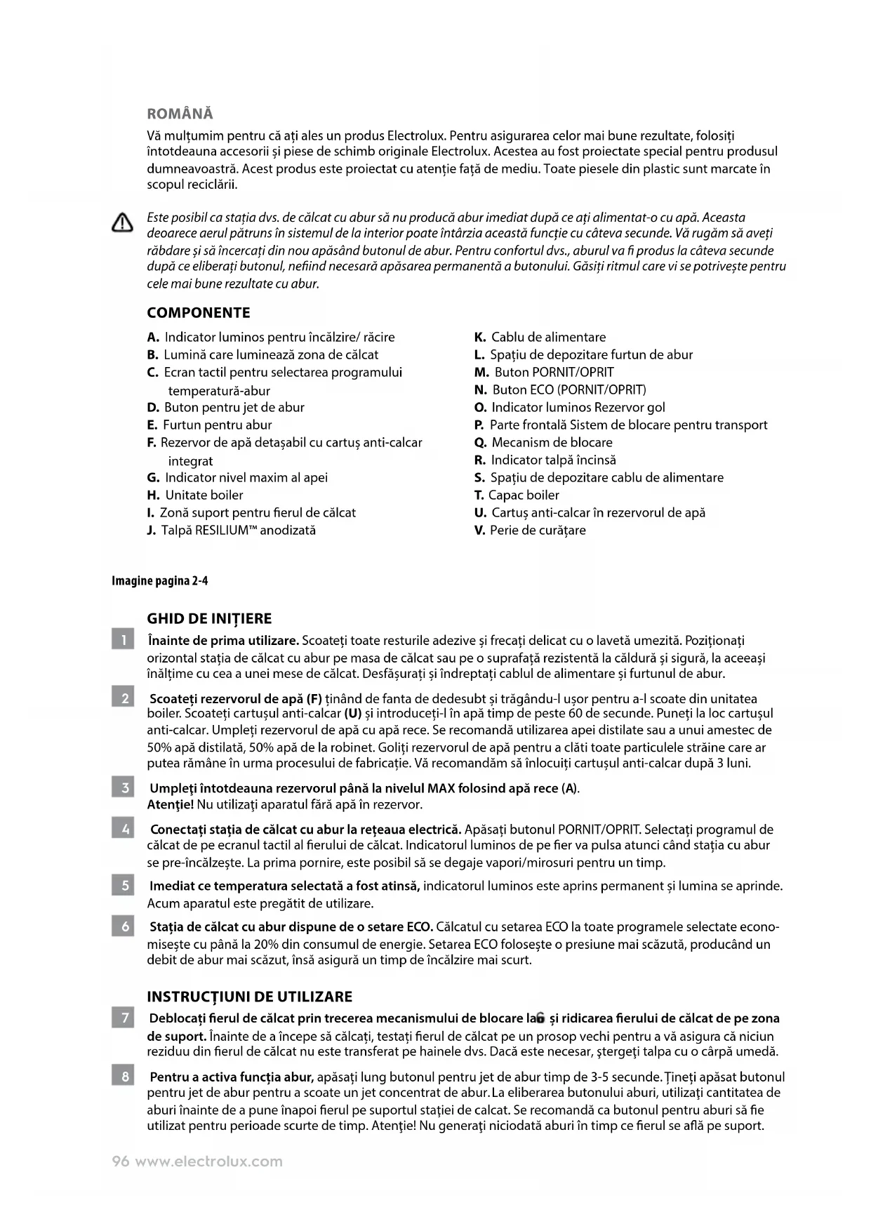 Funcția jet de abur și jet de abur vertical nu funcționează. Funcția jet de abur a fost folosită foarte frecvent pe o perioadă scurtă. Puneți erul de călcat în poziție orizontală și așteptați înainte de a folosi funcția jet de abur. Fierul de călcat nu este sucient de încins. Reglați temperatura corectă pentru călcarea cu aburi (până la „ Bumbac”). Așezați erul de călcat în poziție verticală și așteptați până când indicatorul luminos de temperatură se stinge. Apa picură din talpă pe durata călcatului. Fierul de călcat nu este sucient de erbinte. Setaţi discul termostatului la o temperatură („ Bumbac” spre maxim) adecvată pentru călcatul cu abur. Puneţi erul de călcat pe bază şi aşteptaţi să se stingă lumina înainte de a începe călcatul. Puneți erul de călcat pe bază și așteptați până când lumina se aprinde înainte de a începe călcat. Fulgi şi impurităţi ies din talpă pe durata călcatului. Aţi utilizat apă dură, care a condus la apariţia unor fulgi de calcar în rezervorul de apă. Curățați stația cu un agent de decalciere (consultați „Curățarea”, nr. 14). Ţineţi apăsat butonul pentru abur timp de aproximativ un minut pentru a obţine abur. După care mai ţineţi apăsat un minut pentru a curăţa sistemul de producere a aburului. Înainte de a începe să călcați, testat erul de călcat pe un prosop vechi pentru a vă asigura că niciun reziduu din erul de călcat nu este transferat pe hainele dvs. Apa picură din talpă pe durata răcirii erului sau după ce acesta a fost depozitat. Fierul de călcat a fost pus în poziţie orizontală deşi mai avea apă în rezervorul de apă. Goliți rezervorul de apă și opriți stația de călcat cu abur prin apăsarea butonului PORNIT/OPRIT (M) de pe boiler înainte de a depozita erul de călcat. Dungi maro ies din talpă pe durata călcatului şi pătează rufele. Ați utilizați agenți chimici de decalciere diferiți de cei recomandați. Folosiți agentul de decalciere recomandat (consultați „Curățarea”, nr. 14). Fibrele textile s-au acumulat în oriciile din talpă și se ard. Curăţaţi talpa cu o lavetă moale umedă. Este posibil ca ţesăturile să nu e clătite bine sau hainele sunt noi şi nu au fost spălate înainte de călcare. Clătiți bine țesăturile înainte de a le călca. ELIMINAREA Simbolul de pe produs indică faptul că acesta conţine o baterie care nu trebuie aruncată cu deşeurile menajere obişnuite. Acest simbol de pe produs sau de pe ambalaj indică faptul produsul nu poate aruncat împreună cu deşeurile menajere. Pentru reciclarea produsului, acesta trebuie dus la un punct de colectare sau la un centru de service Electrolux, care poate demonta şi recicla bateria şi componentele electrice într-un mod sigur şi profesional. Pentru colectarea separată a produselor electrice şi bateriilor reciclabile, urmaţi reglementările în vigoare la nivel naţional. Electrolux își rezervă dreptul de a modica produsele, informațiile și specicațiile fără noticare.101www.electrolux.com