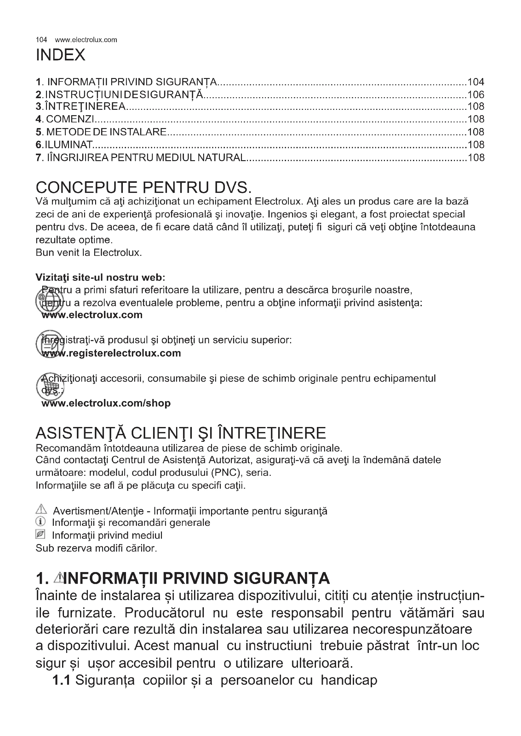 CONCEPUTE PENTRU DVS. Vă mulţumim că aţi achiziţionat un echipament Electrolux. Aţi ales un produs care are la bază zeci de ani de experienţă profesională şi inovaţie. Ingenios şi elegant, a fost proiectat special pentru dvs. De aceea, de fi ecare dată când îl utilizaţi, puteţi fi siguri că veţi obţine întotdeauna rezultate optime. Bun venit la Electrolux. Vizitaţi site-ul nostru web: Pentru a primi sfaturi referitoare la utilizare, pentru a descărca broşurile noastre, pentru a rezolva eventualele probleme, pentru a obţine informaţii privind asistenţa: www.electrolux.com Înregistraţi-vă produsul şi obţineţi un serviciu superior: www.registerelectrolux.com Achiziţionaţi accesorii, consumabile şi piese de schimb originale pentru echipamentul dvs.: www.electrolux.com/shop