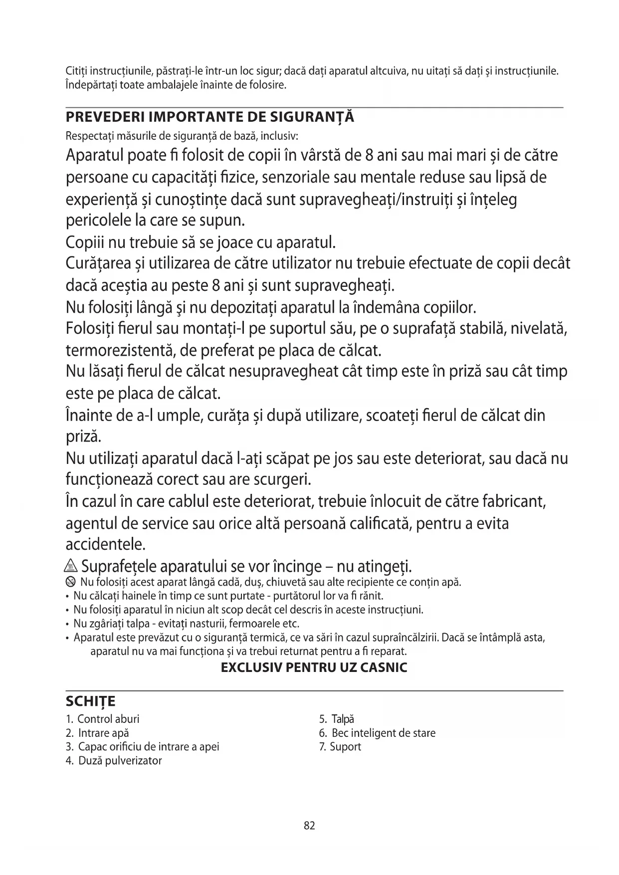Respectaţi măsurile de siguranţă de bază, inclusiv: Aparatul poate folosit de copii în vârstă de 8 ani sau mai mari și de către persoane cu capacități zice, senzoriale sau mentale reduse sau lipsă de experiență și cunoștințe dacă sunt supravegheați/instruiți și înțeleg pericolele la care se supun. Copiii nu trebuie să se joace cu aparatul. Curățarea și utilizarea de către utilizator nu trebuie efectuate de copii decât dacă aceștia au peste 8 ani și sunt supravegheați. Nu folosiţi lângă şi nu depozitaţi aparatul la îndemâna copiilor. Folosiți erul sau montați-l pe suportul său, pe o suprafață stabilă, nivelată, termorezistentă, de preferat pe placa de călcat. Nu lăsați erul de călcat nesupravegheat cât timp este în priză sau cât timp este pe placa de călcat. Înainte de a-l umple, curăța și după utilizare, scoateți erul de călcat din priză. Nu utilizați aparatul dacă l-ați scăpat pe jos sau este deteriorat, sau dacă nu funcționează corect sau are scurgeri. În cazul în care cablul este deteriorat, trebuie înlocuit de către fabricant, agentul de service sau orice altă persoană calicată, pentru a evita accidentele. h Suprafețele aparatului se vor încinge – nu atingeți. b Nu folosiţi acest aparat lângă cadă, duş, chiuvetă sau alte recipiente ce conţin apă.