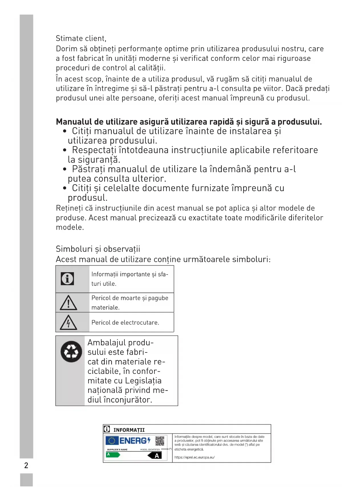 - Citiţimanualuldeutilizareînaintedeinstalareaşi utilizareaprodusului.