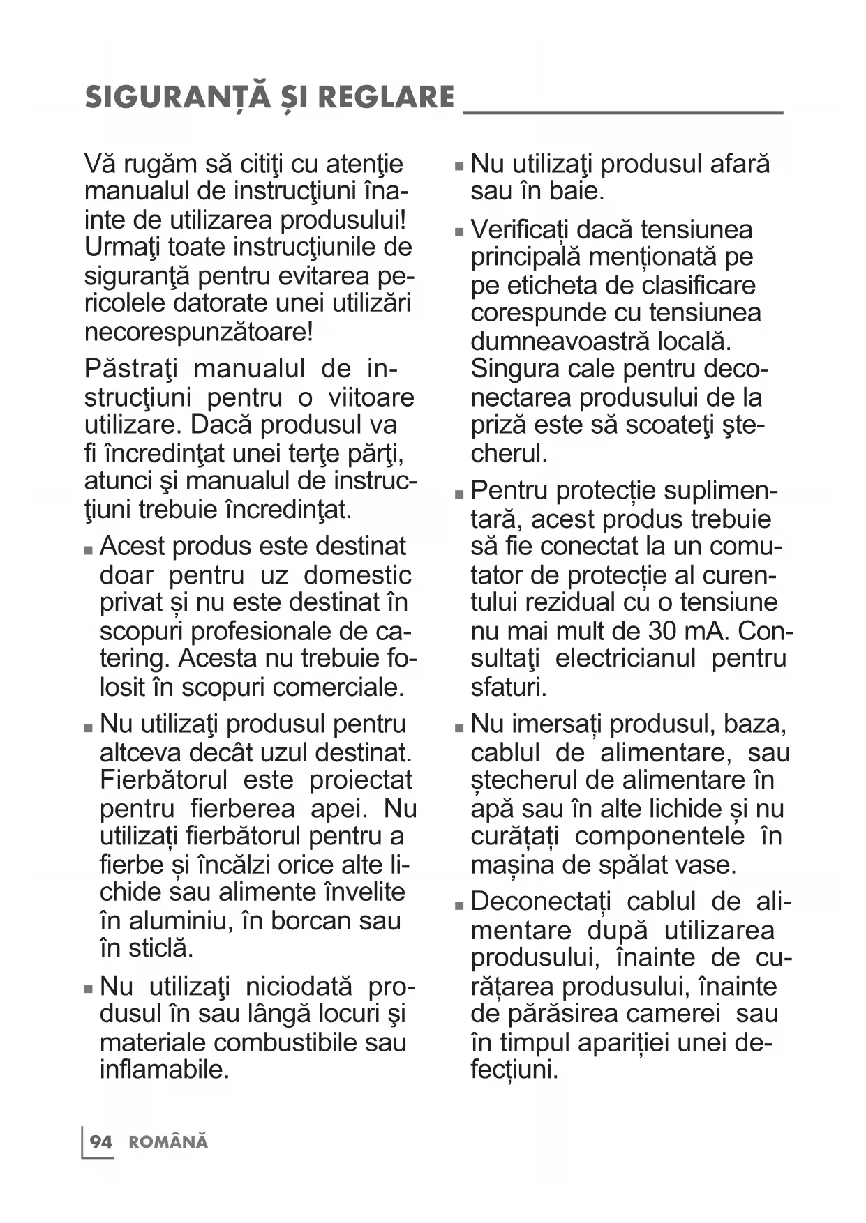 Nu utilizaţi produsul pentru altceva decât uzul destinat. Fierbătorul este proiectat pentru fierberea apei. Nu utilizați fierbătorul pentru a fierbe și încălzi orice alte li- chide sau alimente învelite în aluminiu, în borcan sau în sticlă.