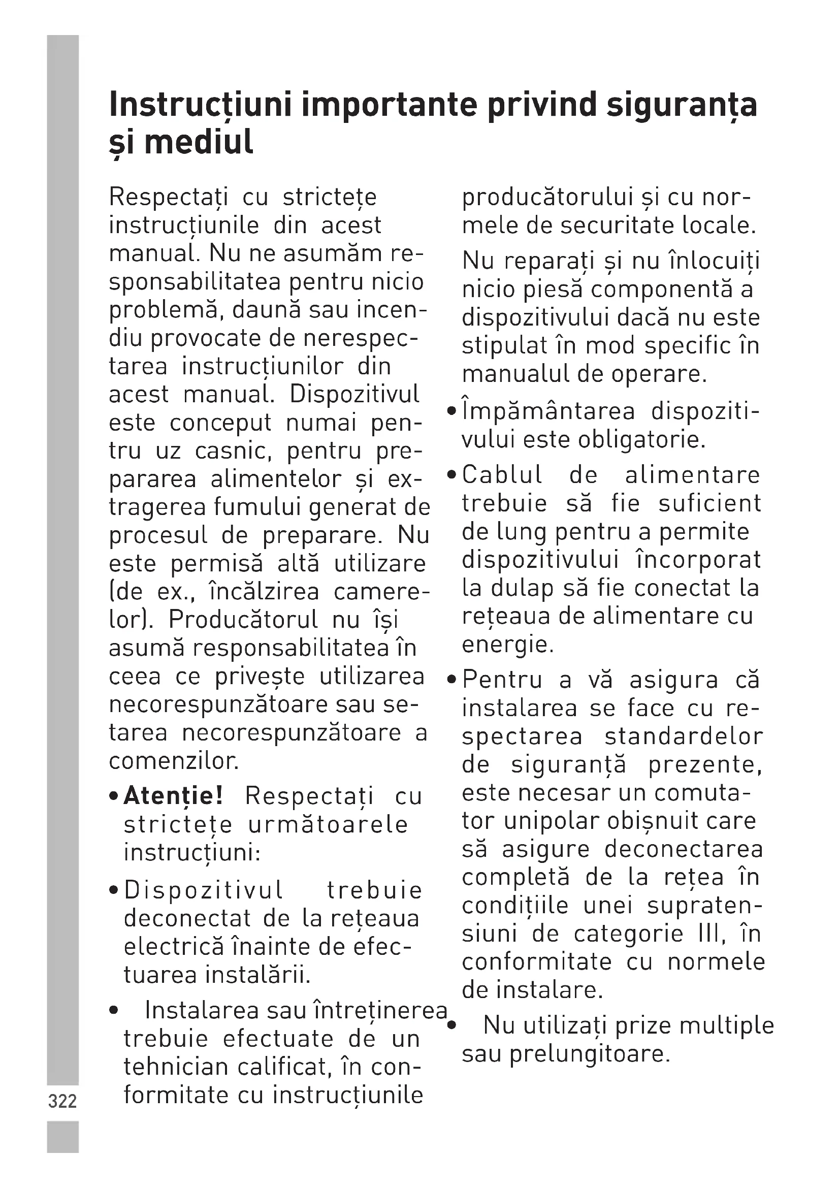 le en marche pour voir si le problème se résout de lui-même. Si le problème persiste après les contrôles ci-dessus, contactez le service client le plus proche de chez vous. Entretien322 Instrucțiuni importante privind siguranța și mediul Respectați cu strictețe instrucțiunile din acest manual. Nu ne asumăm re- sponsabilitatea pentru nicio problemă, daună sau incen- diu provocate de nerespec- tarea instrucțiunilor din acest manual. Dispozitivul este conceput numai pen- tru uz casnic, pentru pre- pararea alimentelor și ex- tragerea fumului generat de procesul de preparare. Nu este permisă altă utilizare (de ex., încălzirea camere- lor). Producătorul nu își asumă responsabilitatea în ceea ce privește utilizarea necorespunzătoare sau se- tarea necorespunzătoare a comenzilor.