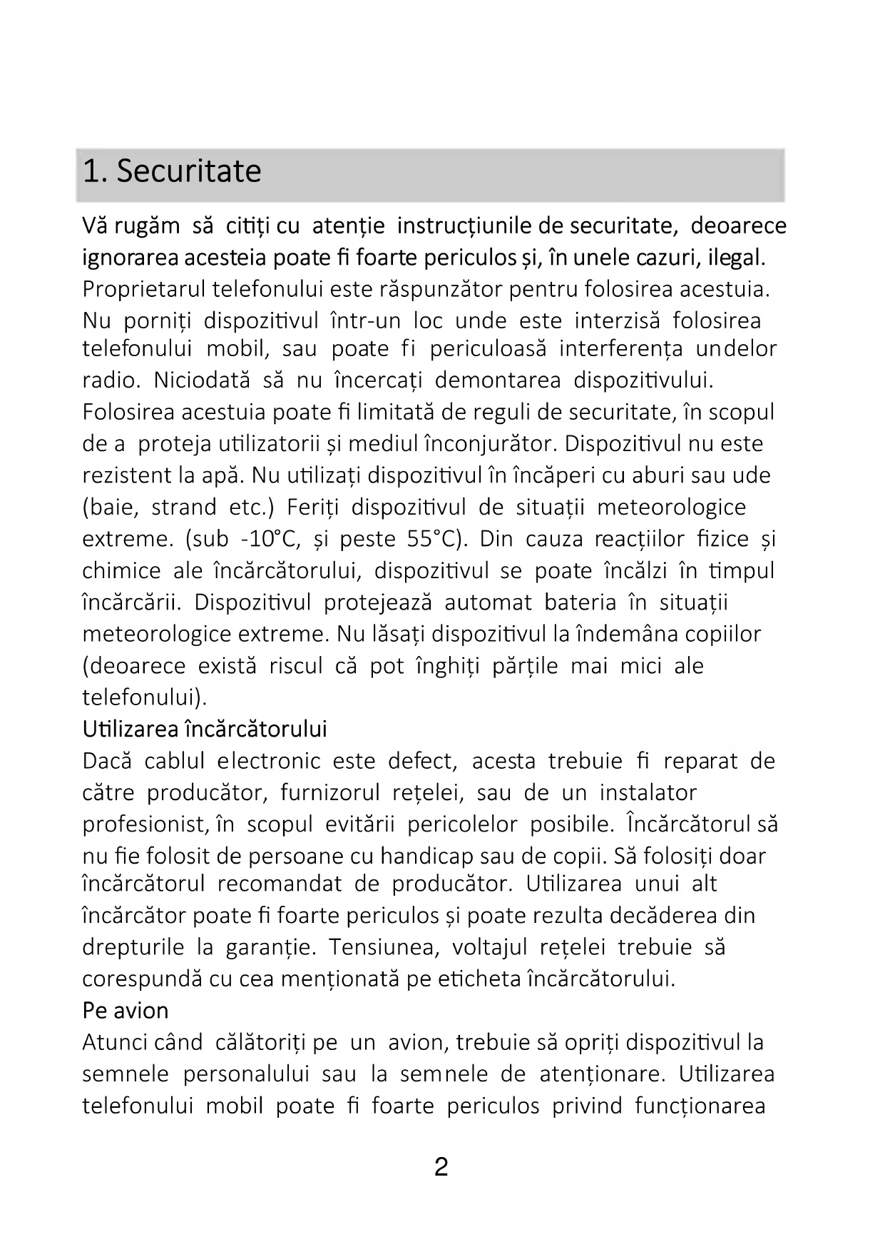 Vă rugăm să citiți cu atenție instrucțiunile de securitate, deoarece ignorarea acesteia poate fi foarte periculos și, în unele cazuri, ilegal. Proprietarul telefonului este răspunzător pentru folosirea acestuia. Nu porniți dispozitivul într-un loc unde este interzisă folosirea telefonului mobil, sau poate fi periculoasă interferența undelor radio. Niciodată să nu încercați demontarea dispozitivului. Folosirea acestuia poate fi limitată de reguli de securitate, în scopul de a proteja utilizatorii și mediul înconjurător. Dispozitivul nu este rezistent la apă. Nu utilizați dispozitivul în încăperi cu aburi sau ude (baie, strand etc.) Feriți dispozitivul de situații meteorologice extreme. (sub -10°C, și peste 55°C). Din cauza reacțiilor fizice și chimice ale încărcătorului, dispozitivul se poate încălzi în timpul încărcării. Dispozitivul protejează automat bateria în situații meteorologice extreme. Nu lăsați dispozitivul la îndemâna copiilor (deoarece există riscul că pot înghiți părțile mai mici ale telefonului). Utilizarea încărcătorului Dacă cablul electronic este defect, acesta trebuie fi reparat de către producător, furnizorul rețelei, sau de un instalator profesionist, în scopul evitării pericolelor posibile. Încărcătorul să nu fie folosit de persoane cu handicap sau de copii. Să folosiți doar încărcătorul recomandat de producător. Utilizarea unui alt încărcător poate fi foarte periculos și poate rezulta decăderea din drepturile la garanție. Tensiunea, voltajul rețelei trebuie să corespundă cu cea menționată pe eticheta încărcătorului. Pe avion Atunci când călătoriți pe un avion, trebuie să opriți dispozitivul la semnele personalului sau la semnele de atenționare. Utilizarea telefonului mobil poate fi foarte periculos privind funcționarea3 avionului, poate deranja rețeaua de comunicare. Utilizarea dispozitivului chiar și după avertizare, poate rezulta în asumarea unor consecințe juridice. Teritorii cu pericol de explozie și teritorii limitate Închideți telefonul pe teritorii cu pericol de explozie. Urmăriți instrucțiunile oficiale. Scânteia produsă în locuri de acest fel pot produce explozie sau incendiu, care au ca rezultat injurii severe sau chiar moartea. Închideți telefonul în stațiile de benzină, motorină, mai ales în apropierea pompelor. În apropierea fabricilor care produc substanțe chimice sau explozive vă rugăm să urmăriți cu atenție aceste dispoziții. Mijloace electronice În scopul evitării demagnetizației, să nu lăsați telefonul în apropierea altor mijloace electronice pentru mai mult timp. Interferența cu funcționarea aparaturii medicale Telefonul este emițător radio, ce poate deranja funcționarea dispozitivelor medicale electronice sau implanturilor, precum dispozitive auditive, pacemaker, pompe insulină, etc. Vă recomandăm să păstrați o distanță de cel puțin 15 cm între acestea, niciodată să nu țineți telefonul în buzunarul de la vestă. Urmăriți dispozițiile date de producătorul dispozitivului medical. În cazul în care folosiți unul dintre aceste dispozitive și aveți orice întrebare despre utilizarea dispozitivului mobil, vă rugăm ăs vă asresați medicului terapeut. Spital În spitale sau în alte locații sanitare pot exista unele dispozitive foarte sensibile la semnalele cu frecvență radio. Opriți telefonul, dacă semnele de avertizare vă arată acest lucru sau dacă personalul vă avertizează cu privire la acesta. Siguranță rutieră Interesați-vă de regulile locale privind utilizarea dispozitivelor mobile în timp de conducere. Nu utilizați telefonul în timp ce conduceți, utilizați căsti sau puneți pe speaker. Dacă doriți să4 primiți un apel și aveți posibilitatea, opriți-vă în partea din afara carosabilului. Semnalul radio poate deranja sistemul electronic al mașinii dvs., precum alarma. Dacă mașina dvs. are sistem de reținere suplimentară, aveți grijă ca telefonul mobil să nu stea în calea acestora, fiindcă acastă situție ar putea conduce la accidente rutiere grave. Mediu de utilizare Dispozitivul corespunde valorii recomandate de emitere a undelor radio, dacă acesta se află la minim 1,5 cm de la pământ. Dacă țineți telefonul în husă sau în alte mijloace, aveți grijă ca acestea să nu conțină metale și să vă separe dispozitivul de corpul dvs. În cazuul utilizării altor accesorii, nu se poate asigura funcționarea conform regulilor de frecvență radio. Dacă nu folosiți husă și nu țineți să în păstrați la minim 2,5 cm de la corpul dvs.
