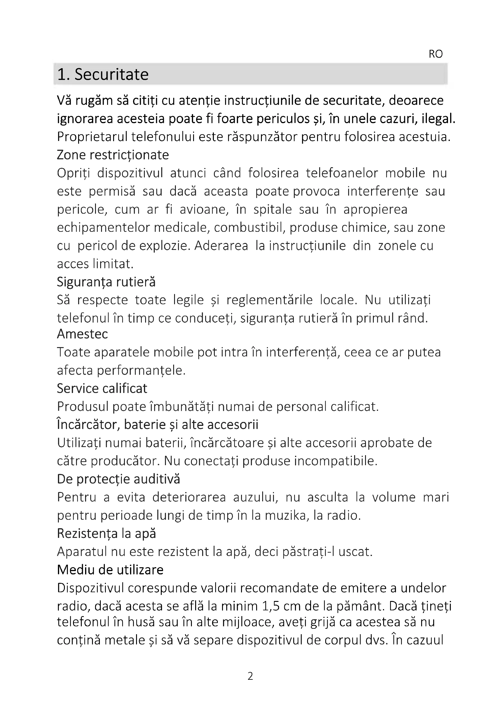 Vă rugăm să citiți cu atenție instrucțiunile de securitate, deoarece ignorarea acesteia poate fi foarte periculos și, în unele cazuri, ilegal. Proprietarul telefonului este răspunzător pentru folosirea acestuia. Zone restricționate Opriți dispozitivul atunci când folosirea telefoanelor mobile nu este permisă sau dacă aceasta poate provoca interferențe sau pericole, cum ar fi avioane, în spitale sau în apropierea echipamentelor medicale, combustibil, produse chimice, sau zone cu pericol de explozie. Aderarea la instrucțiunile din zonele cu acces limitat. Siguranța rutieră Să respecte toate legile și reglementările locale. Nu utilizați telefonul în timp ce conduceți, siguranța rutieră în primul rând. Amestec Toate aparatele mobile pot intra în interferență, ceea ce ar putea afecta performanțele. Service calificat Produsul poate îmbunătăți numai de personal calificat. Încărcător, baterie și alte accesorii Utilizați numai baterii, încărcătoare și alte accesorii aprobate de către producător. Nu conectați produse incompatibile. De protecție auditivă Pentru a evita deteriorarea auzului, nu asculta la volume mari pentru perioade lungi de timp în la muzika, la radio. Rezistența la apă Aparatul nu este rezistent la apă, deci păstrați-l uscat. Mediu de utilizare Dispozitivul corespunde valorii recomandate de emitere a undelor radio, dacă acesta se află la minim 1,5 cm de la pământ. Dacă țineți telefonul în husă sau în alte mijloace, aveți grijă ca acestea să nu conțină metale și să vă separe dispozitivul de corpul dvs. În cazuulRO