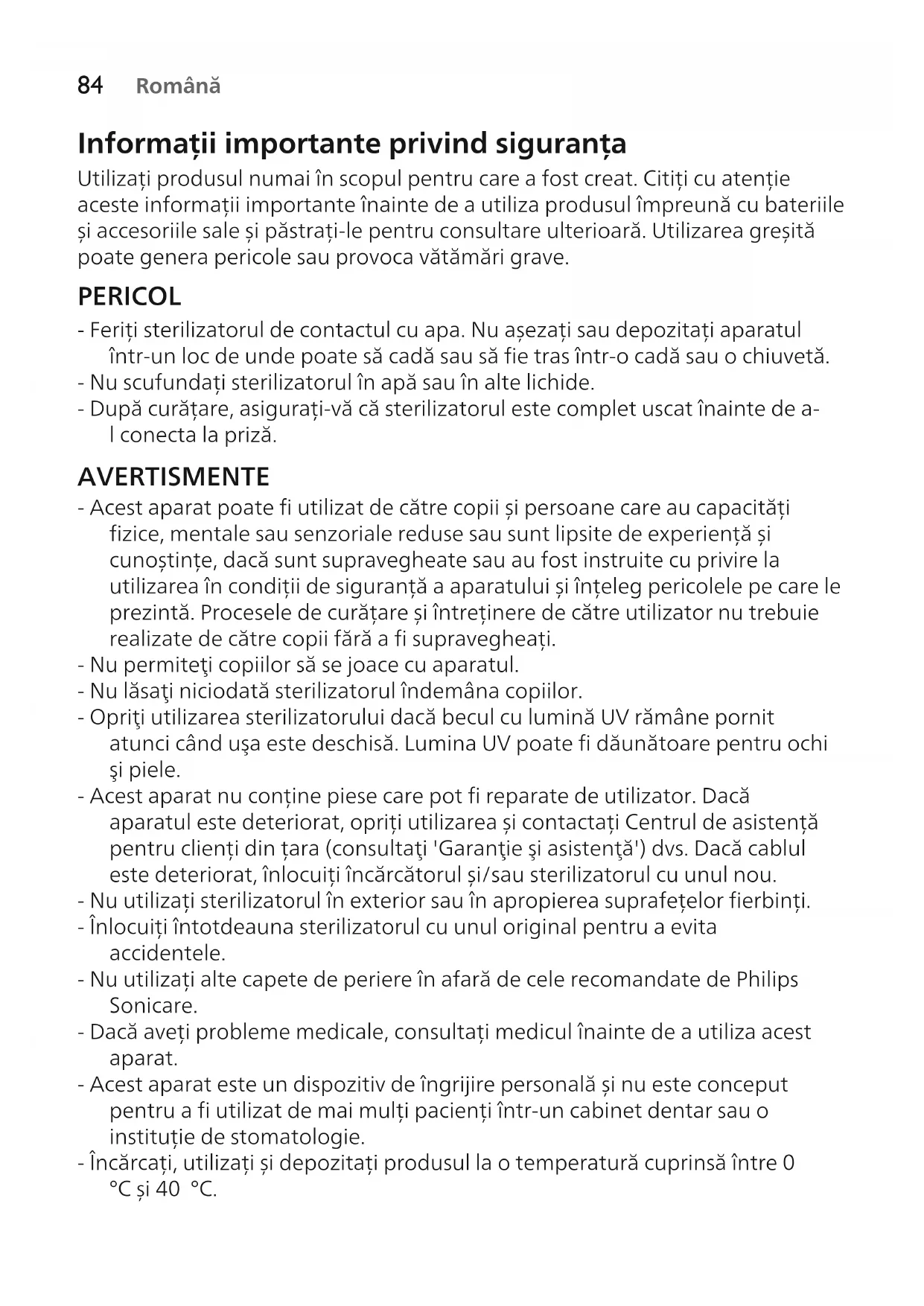 Română Informații importante privind siguranța Utilizați produsul numai în scopul pentru care a fost creat. Citiți cu atenție aceste informații importante înainte de a utiliza produsul împreună cu bateriile și accesoriile sale și păstrați-le pentru consultare ulterioară. Utilizarea greșită poate genera pericole sau provoca vătămări grave. PERICOL - Feriți sterilizatorul de contactul cu apa. Nu așezați sau depozitați aparatul într-un loc de unde poate să cadă sau să fie tras într-o cadă sau o chiuvetă. - Nu scufundați sterilizatorul în apă sau în alte lichide. - După curățare, asigurați-vă că sterilizatorul este complet uscat înainte de a- l conecta la priză. AVERTISMENTE - Acest aparat poate fi utilizat de către copii și persoane care au capacități fizice, mentale sau senzoriale reduse sau sunt lipsite de experiență și cunoștințe, dacă sunt supravegheate sau au fost instruite cu privire la utilizarea în condiții de siguranță a aparatului și înțeleg pericolele pe care le prezintă. Procesele de curățare și întreținere de către utilizator nu trebuie realizate de către copii fără a fi supravegheați. - Nu permiteţi copiilor să se joace cu aparatul. - Nu lăsaţi niciodată sterilizatorul îndemâna copiilor. - Opriţi utilizarea sterilizatorului dacă becul cu lumină UV rămâne pornit atunci când uşa este deschisă. Lumina UV poate fi dăunătoare pentru ochi şi piele. - Acest aparat nu conține piese care pot fi reparate de utilizator. Dacă aparatul este deteriorat, opriți utilizarea și contactați Centrul de asistență pentru clienți din țara (consultaţi 'Garanţie şi asistenţă') dvs. Dacă cablul este deteriorat, înlocuiți încărcătorul și/sau sterilizatorul cu unul nou. - Nu utilizați sterilizatorul în exterior sau în apropierea suprafețelor fierbinți. - Înlocuiți întotdeauna sterilizatorul cu unul original pentru a evita accidentele. - Nu utilizați alte capete de periere în afară de cele recomandate de Philips Sonicare. - Dacă aveți probleme medicale, consultați medicul înainte de a utiliza acest aparat. - Acest aparat este un dispozitiv de îngrijire personală și nu este conceput pentru a fi utilizat de mai mulți pacienți într-un cabinet dentar sau o instituție de stomatologie. - Încărcați, utilizați și depozitați produsul la o temperatură cuprinsă între 0 °C și 40 °C.85 Română ATENȚIE - Utilizați sterilizatorul numai cu ecranul de protecție pe poziție. - Becul cu lumină UV al sterilizatorului este fierbinte în timpul şi imediat după ciclul de sterilizare. Nu atingeți sterilizatorul UV atunci când becul este fierbinte. - Dacă aţi utilizat sterilizatorul în 3 cicluri de curăţare cu UV consecutive, opriţi-l timp de cel puţin 30 de minute înainte de a începe un alt ciclu de curăţare cu UV. - Nu spălați nicio parte componentă a produsului în mașina de spălat vase. Câmpuri electromagnetice (EMF) Acest aparat Philips respectă toate standardele și reglementările aplicabile privind expunerea la câmpuri electromagnetice. Introducere Felicitări pentru achiziţie şi bun venit la Philips! Pentru a beneficia pe deplin de asistenţa oferită de Philips, înregistraţi-vă produsul la www.philips.com/welcome. Descriere generală (fig. 1) 1 Buton de pornire/oprire 2 Cavitate ușă 3 Fereastră 4 Încărcător periuță de dinți electrică Sonicare 5 Cablu Sterilizarea capetelor de periere Cu sterilizatorul UV puteți curăța capul de periere după fiecare utilizare. Notă: Lumina UV poate fi dăunătoare pentru ochi şi piele.