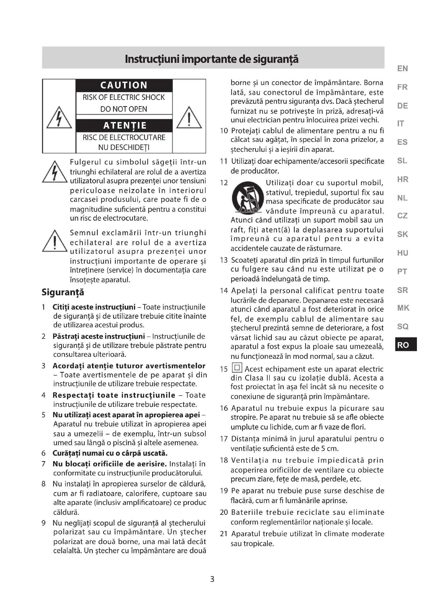 Fulgerul cu simbolul săgeții într-un triunghi echilateral are rolul de a avertiza utilizatorul asupra prezenței unor tensiuni periculoase neizolate în interiorul carcasei produsului, care poate fi de o magnitudine sucientă pentru a constitui un risc de electrocutare. Semnul exclamării într-un triunghi echilateral are rolul de a avertiza utilizatorul asupra prezenței unor instrucțiuni importante de operare și întreținere (service) în documentația care însoțește aparatul. Siguranță 1 Citiți aceste instrucțiuni – Toate instrucțiunile de siguranță și de utilizare trebuie citite înainte de utilizarea acestui produs. 2 Păstrați aceste instrucțiuni – Instrucțiunile de siguranță și de utilizare trebuie păstrate pentru consultarea ulterioară. 3 Acordați atenție tuturor avertismentelor – Toate avertismentele de pe aparat și din instrucțiunile de utilizare trebuie respectate. 4 Respectați toate instrucțiunile – Toate instrucțiunile de utilizare trebuie respectate. 5 Nu utilizați acest aparat în apropierea apei – Aparatul nu trebuie utilizat în apropierea apei sau a umezelii – de exemplu, într-un subsol umed sau lângă o piscină și altele asemenea. 6 Curățați numai cu o cârpă uscată. 7 Nu blocați orificiile de aerisire. Instalați în conformitate cu instrucțiunile producătorului. 8 Nu instalați în apropierea surselor de căldură, cum ar fi radiatoare, calorifere, cuptoare sau alte aparate (inclusiv amplicatoare) ce produc căldură. 9 Nu neglijați scopul de siguranță al ștecherului polarizat sau cu împământare. Un ștecher polarizat are două borne, una mai lată decât celalaltă. Un ștecher cu împământare are două