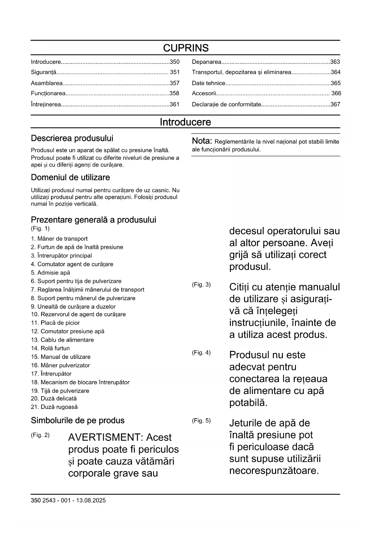 Simbolurile de pe produs (Fig. 2) AVERTISMENT: Acest produs poate fi periculos și poate cauza vătămări corporale grave sau decesul operatorului sau al altor persoane. Aveți grijă să utilizați corect produsul. (Fig. 3) Citiți cu atenție manualul de utilizare și asigurați- vă că înțelegeți instrucțiunile, înainte de a utiliza acest produs. (Fig. 4) Produsul nu este adecvat pentru conectarea la rețeaua de alimentare cu apă potabilă. (Fig. 5) Jeturile de apă de înaltă presiune pot fi periculoase dacă sunt supuse utilizării necorespunzătoare. 350 2543 - 001 - 13.08.2025Jetul nu trebuie să fie direcționat către persoane, echipamente electrice sau către produs. (Fig. 6) Marcaj privind mediului înconjurător. Nici produsul și nici ambalajul său nu sunt deșeuri menajere. Reciclați-l la o unitate de eliminare autorizată pentru echipamente electrice și electronice. (Fig. 7) Unealtă clasa II. (Fig. 8) Etichetă privind emisiile de zgomot în mediu, conform directivelor și reglementărilor din UE și Regatul Unit și legislației din New South Wales „Regulamentele privind măsurile de protecție a mediului (controlul zgomotului) din 2017”. Nivelul de putere sonoră garantat al produsului este specificat în Date tehnice la pagina 365
