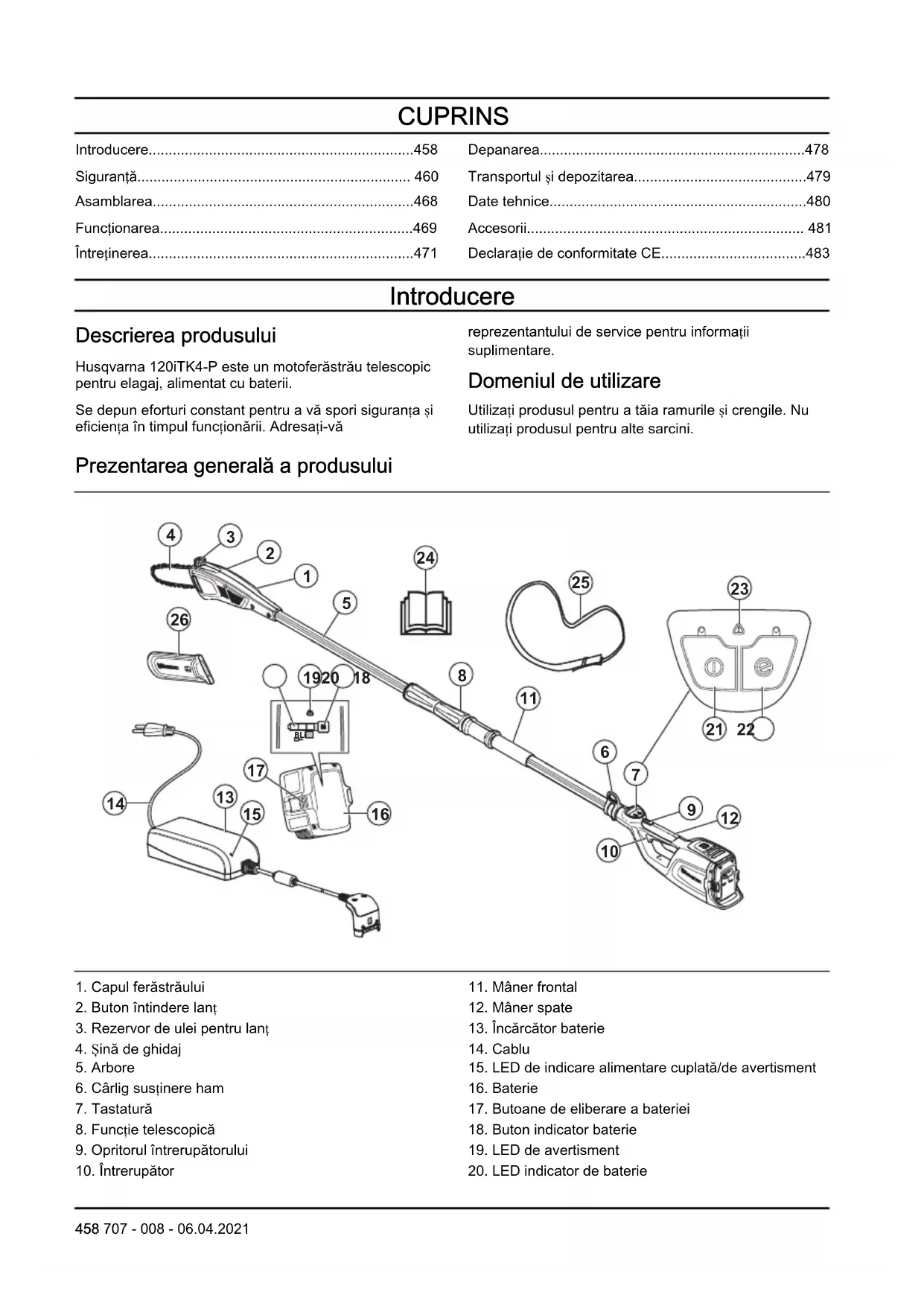 - Declarație de conformitate CE Introducere Descrierea produsului Husqvarna 120iTK4-P este un motoferăstrău telescopic pentru elagaj, alimentat cu baterii. Se depun eforturi constant pentru a vă spori siguranța și eficiența în timpul funcționării. Adresați-vă reprezentantului de service pentru informații suplimentare. Domeniul de utilizare Utilizați produsul pentru a tăia ramurile și crengile. Nu utilizați produsul pentru alte sarcini. Prezentarea generală a produsului p. 483