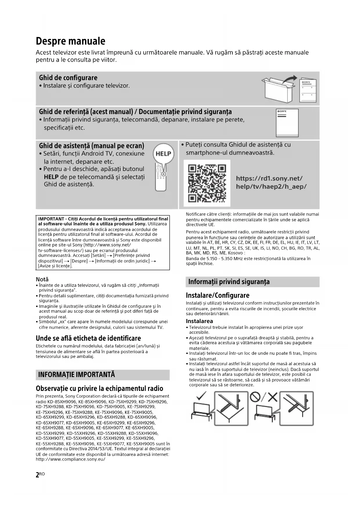Observaţie cu privire la echipamentul radio Prin prezenta, Sony Corporation declară că tipurile de echipament radio KD-85XH9096, KE-85XH9096, KD-75XH9299, KD-75XH9296, KD-75XH9288, KD-75XH9096, KD-75XH9005, KE-75XH9299, KE-75XH9296, KE-75XH9288, KE-75XH9096, KE-75XH9005, KD-65XH9299, KD-65XH9296, KD-65XH9288, KD-65XH9096, KD-65XH9077, KD-65XH9005, KE-65XH9299, KE-65XH9296, KE-65XH9288, KE-65XH9096, KE-65XH9077, KE-65XH9005, KD-55XH9299, KD-55XH9296, KD-55XH9288, KD-55XH9096, KD-55XH9077, KD-55XH9005, KE-55XH9299, KE-55XH9296, KE-55XH9288, KE-55XH9096, KE-55XH9077, KE-55XH9005 sunt în conformitate cu Directiva 2014/53/UE. Textul integral al declarației UE de conformitate este disponibil la următoarea adresă internet: http://www.compliance.sony.eu/Notificare către clienţi: informaţiile de mai jos sunt valabile numai pentru echipamentele comercializate în ţările unde se aplică directivele UE.Pentru acest echipament radio, următoarele restricţii privind punerea în funcţiune sau cerinţele de autorizare a utilizării sunt valabile în AT, BE, HR, CY, CZ, DK, EE, FI, FR, DE, EL, HU, IE, IT, LV, LT, LU, MT, NL, PL, PT, SK, SI, ES, SE, UK, IS, LI, NO, CH, BG, RO, TR, AL, BA, MK, MD, RS, ME, Kosovo :Banda de 5.150 - 5.350 MHz este restricţionată la utilizarea în spaţii închise. Informaţii privind siguranţa Instalare/Configurare Instalaţi și utilizaţi televizorul conform instrucţiunilor prezentate în continuare, pentru a evita riscurile de incendii, șocurile electrice sau deteriorări/răniri. Instalarea