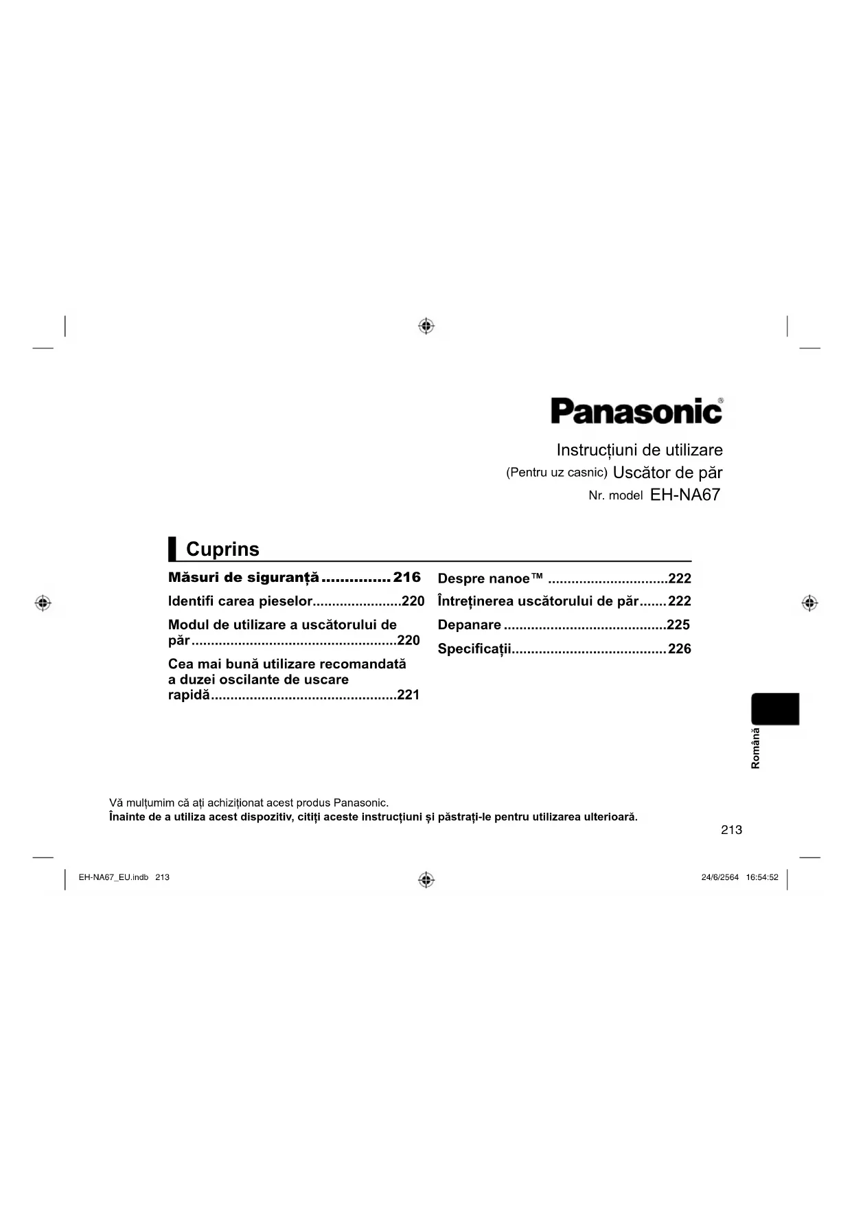 În caz contrar, poate izbucni o explozie sau un incendiu. Nu scufundaţi aparatul în apă. Nu utilizați aparatul în apropierea apei. - În caz contrar, se poate produce electrocutare sau incendiu. Nu modifi cați, dezasamblați sau reparați niciodată aparatul. - În caz contrar, se poate produce aprindere sau vătămare din cauza utilizării anormale. Contactați un centru de service autorizat pentru reparații. Nu utilizați aparatul dacă aveți mâinile umede. - În caz contrar, se poate produce electrocutare sau incendiu ca urmare a unui scurtcircuit. Acest aparat nu a fost conceput pentru utilizare comercială și nu este destinat utilizării fără întreținere adecvată. - În caz contrar, se poate produce arsură sau incendiu ca urmare a unei sarcini sau suprasarcini continue. EH-NA67_EU.indb 218EH-NA67_EU.indb 218 24/6/2564 16:54:5324/6/2564 16:54:53219 Română ATENȚIE ►Pentru a vă proteja părul A nu se utiliza cu orifi ciul de intrare a aerului deteriorat. - Părul se poate prinde în orifi ciul de intrare a aerului, fapt care poate cauza deteriorarea părului. Asigurați-vă că păstrați o distanță de cel puțin 3 cm între orifi ciul de sufl are a aerului și părul dvs. - În caz contrar, părul se poate arde. 10cm 3cm Asigurați-vă că păstrați o distanță de cel puțin 10 cm între părul dvs. și orifi ciul de intrare a aerului. - Părul se poate prinde în orifi ciul de intrare a aerului, fapt care poate cauza deteriorarea părului. ► Rețineți următoarele măsuri de precauție Nu scăpați aparatul sau nu-l supuneți unui șoc. - În caz contrar, se poate produce electrocutare sau aprindere. Utilizați aparatul numai pentru uscarea sau coafarea părului uman. (A nu se utiliza pe animalele de companie sau pentru uscarea îmbrăcămintei, încălțămintei etc.) - În caz contrar, se poate declanșa un incendiu sau o arsură. Nu utilizați pe copiii sub 6 ani. - În caz contrar, se pot produce arsuri. Nu atingeți orifi ciul de evacuare a aerului, duza concentratoare, duza oscilantă de uscare rapidă și difuzorul care vor deveni foarte fi erbinți. - În caz contrar, se pot produce arsuri. Nu priviți spre orifi ciul de sufl are a aerului în timpul utilizării. - Uscătorul de păr sufl ă aer cu praf etc., ceea ce poate avea drept rezultat o vătămare. Nu utilizați niciodată aparatul dacă fi ltrul este scos. - Părul se poate prinde în orifi ciul de intrare a aerului, fapt care poate deteriora părul. Nu spălați aparatul în apă. - În caz contrar, se poate declanșa un incendiu sau o electrocutare. ►Observații