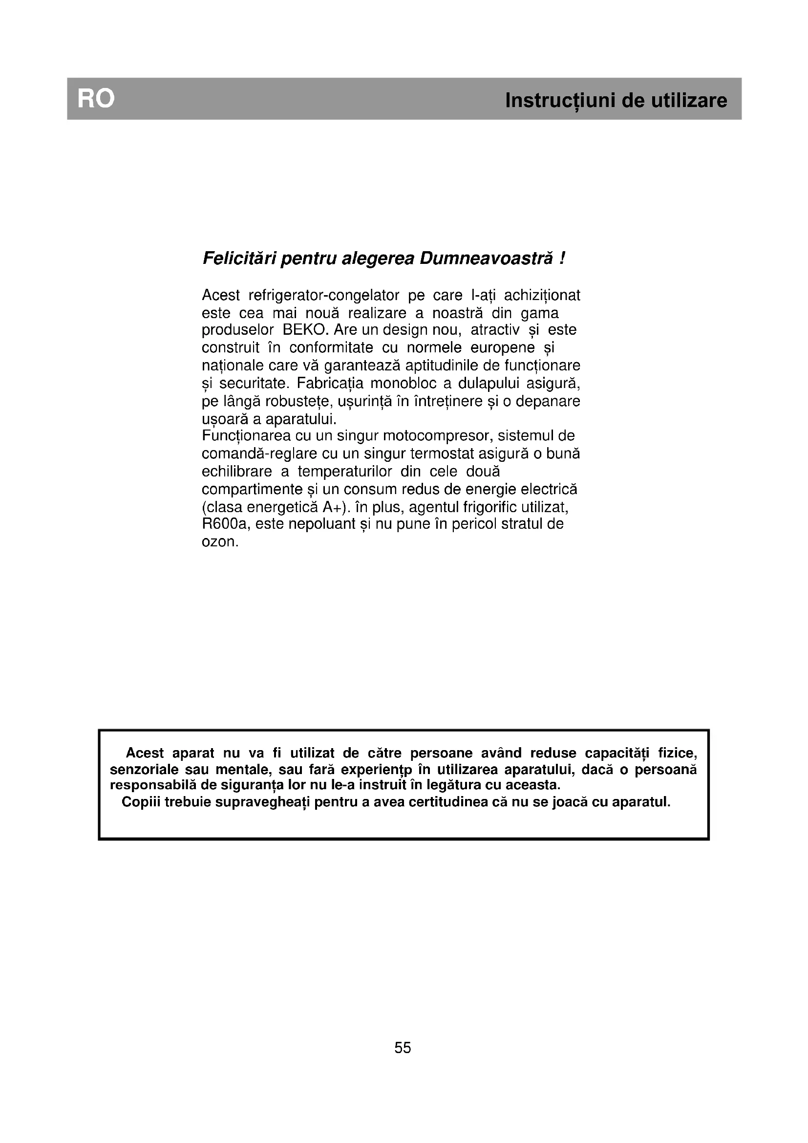 - Aparatele uzate nu sunt deșeuri fără valoare. Eliminarea lor, respectând mediul înconjurător, permite recuperarea unor materii prime importante. Faceți vechiul aparat inutilizabil: - deconectați aparatul de la priza de curent; - îndepărtați cablul de alimentare (tăiați-l); - îndepărtați eventualele încuietori de pe ușă pentru a evita blocarea în interior, din joacă, a copiilor și punerea în pericol a vieții acestora. Aparatele frigorifice conțin materiale izolatoare și agenți frigorifici care necesită o reciclare adecvată. Reciclarea ambalajului ATENȚIE! Nu permiteți copiilor să se joace cu ambalajul sau cu părți componente ale acestuia. Există riscul de a se sufoca cu bucăți de carton pliat și cu folia de plastic. Pentru a ajunge la dumneavoastră în stare bună, aparatul a fost protejat cu un ambalaj corespunzător. Toate materialele care constituie ambalajul sunt compatibile cu mediul înconjurător și reciclabile. Ajutați-ne să reciclăm ambalajul respectând mediul înconjurător ! IMPORTANT! Înainte de a pune aparatul în funcțiune, citiți cu atenție și în întregime aceste instrucțiuni. Ele conțin informații importante referitoare la instalarea, utilizarea și întreținerea aparatului. Fabricantul își declină orice responsabilitate dacă nu se respectă indicațiile din acest document. Păstrați instrucțiunile într-un loc sigur pentru a putea fi consultate cu ușurință în caz de nevoie. De asemenea, ele pot fi folositoare ulterior unui alt utilizator. ATENȚIE! Acest aparat trebuie folosit numai în scopul pentru care a fost fabricat (uz casnic), în spații corespunzătoare, ferit de ploaie, umezeală sau alți factori atmosferici.