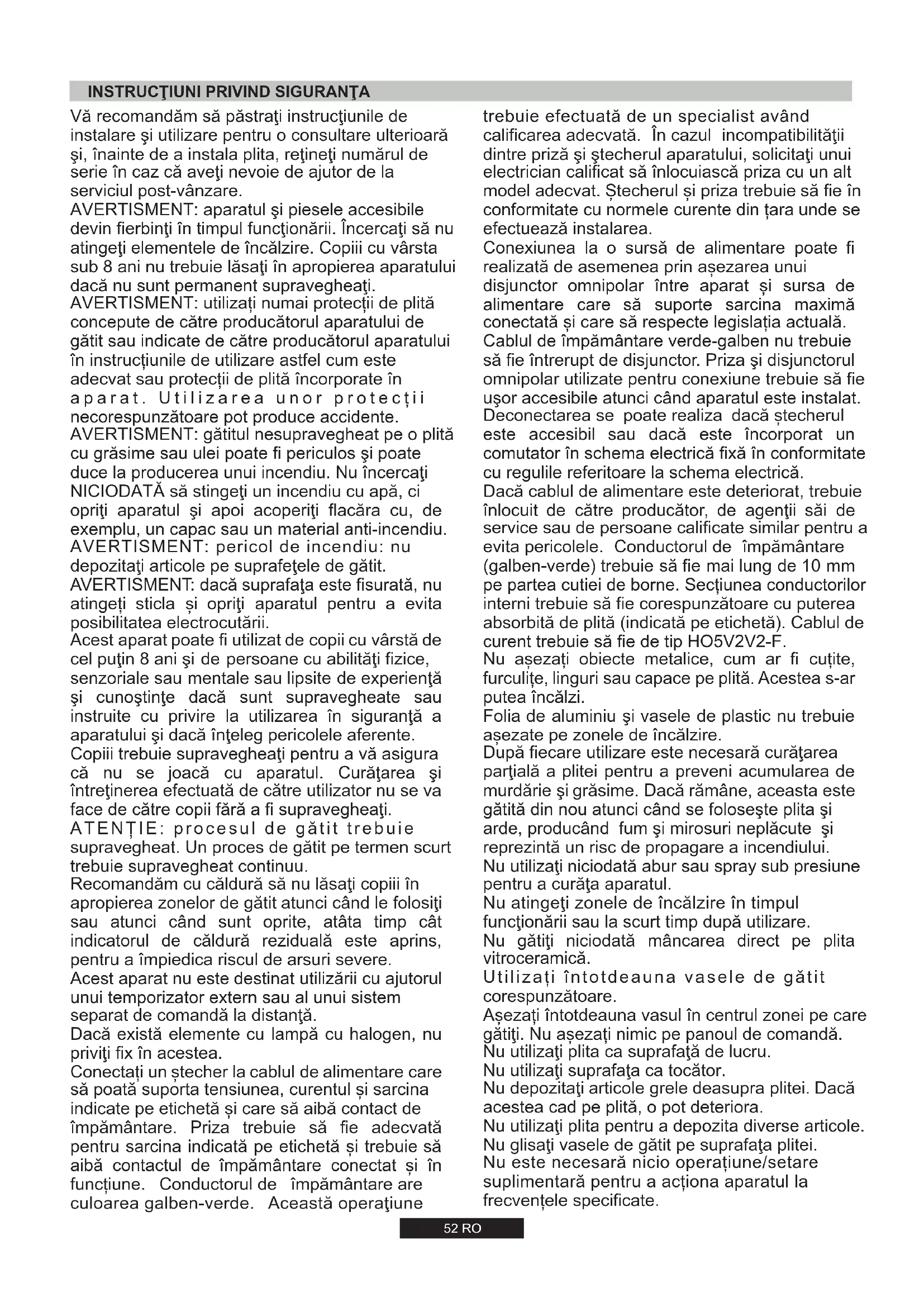 7,7 kW734 l/h560 g/h -52 RO Vă recomandăm să păstraţi instrucţiunile de instalare şi utilizare pentru o consultare ulterioară şi, înainte de a instala plita, reţineţi numărul de serie în caz că aveţi nevoie de ajutor de la serviciul post-vânzare. AVERTISMENT: aparatul şi piesele accesibile devin fierbinţi în timpul funcţionării. Încercaţi să nu atingeţi elementele de încălzire. Copiii cu vârsta sub 8 ani nu trebuie lăsaţi în apropierea aparatului dacă nu sunt permanent supravegheaţi. AVERTISMENT: utiliza¶i numai protec¶ii de plită concepute de către producătorul aparatului de gătit sau indicate de către producătorul aparatului în instruc¶iunile de utilizare astfel cum este adecvat sau protec¶ii de plită încorporate în aparat. Utilizarea unor protec¶ii necorespunzătoare pot produce accidente. AVERTISMENT: gătitul nesupravegheat pe o plită cu grăsime sau ulei poate fi periculos şi poate duce la producerea unui incendiu. Nu încercaţi NICIODATĂ să stingeţi un incendiu cu apă, ci opriţi aparatul şi apoi acoperiţi flacăra cu, de exemplu, un capac sau un material anti-incendiu. AVERTISMENT: pericol de incendiu: nu depozitaţi articole pe suprafeţele de gătit. AVERTISMENT: dacă suprafaţa este fisurată, nu atinge¶i sticla și opriţi aparatul pentru a evita posibilitatea electrocutării. Acest aparat poate fi utilizat de copii cu vârstă de cel puţin 8 ani şi de persoane cu abilităţi fizice, senzoriale sau mentale sau lipsite de experienţă şi cunoştinţe dacă sunt supravegheate sau instruite cu privire la utilizarea în siguranţă a aparatului şi dacă înţeleg pericolele aferente. Copiii trebuie supravegheaţi pentru a vă asigura că nu se joacă cu aparatul. Curăţarea şi întreţinerea efectuată de către utilizator nu se va face de către copii fără a fi supravegheaţi. ATEN¹IE: procesul de gătit trebuie supravegheat. Un proces de gătit pe termen scurt trebuie supravegheat continuu. Recomandăm cu căldură să nu lăsaţi copiii în apropierea zonelor de gătit atunci când le folosiţi sau atunci când sunt oprite, atâta timp cât indicatorul de căldură reziduală este aprins, pentru a împiedica riscul de arsuri severe. Acest aparat nu este destinat utilizării cu ajutorul unui temporizator extern sau al unui sistem separat de comandă la distanţă. Dacă există elemente cu lampă cu halogen, nu priviţi fix în acestea. Conecta¶i un ștecher la cablul de alimentare care să poată suporta tensiunea, curentul și sarcina indicate pe etichetă și care să aibă contact de împământare. Priza trebuie să fie adecvată pentru sarcina indicată pe etichetă și trebuie să aibă contactul de împământare conectat și în func¶iune. Conductorul de împământare are culoarea galben-verde. Această operaţiune