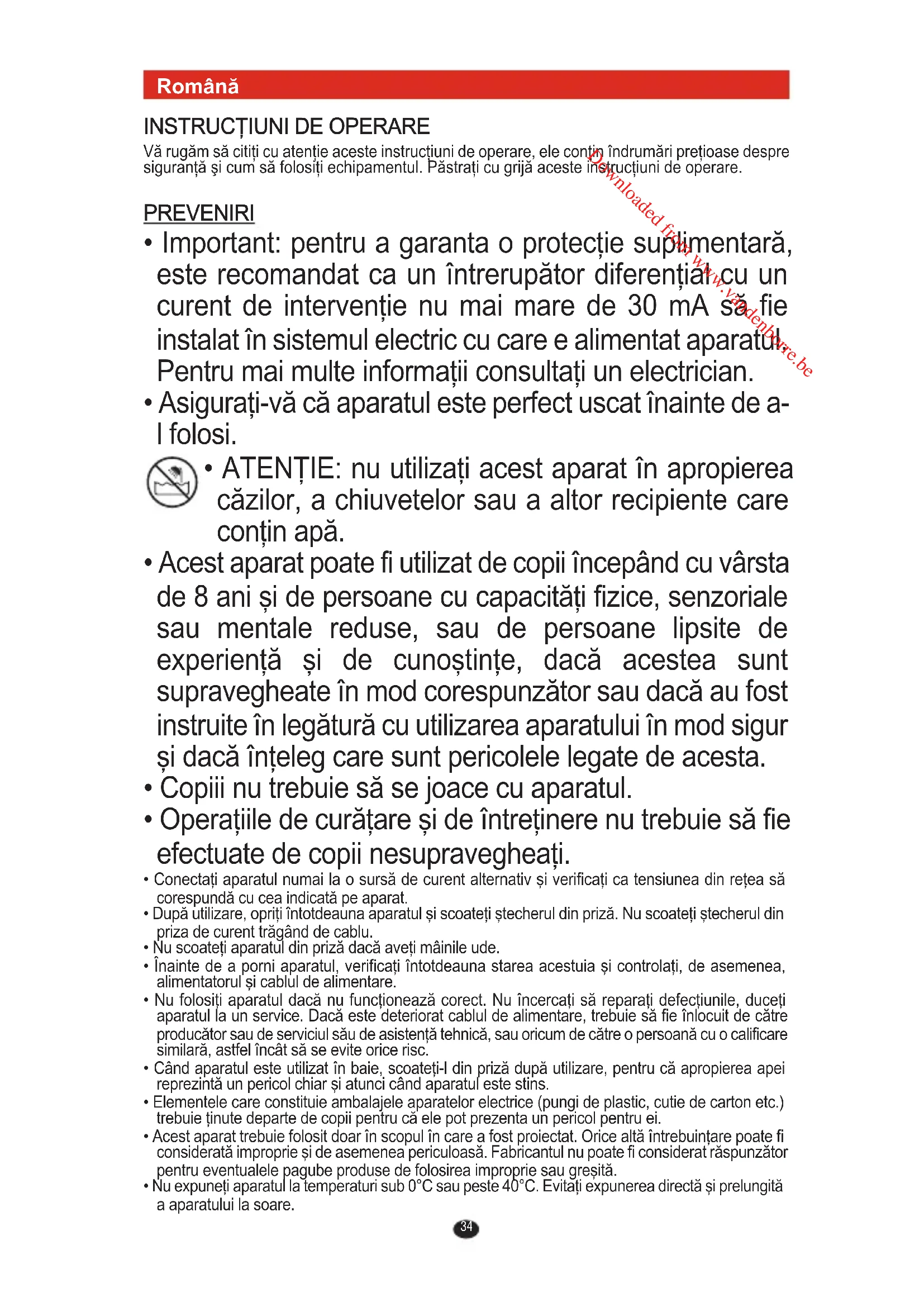 - ATENŢIE: nu utilizaţi acest aparat în apropierea căzilor, a chiuvetelor sau a altor recipiente care conţin apă.