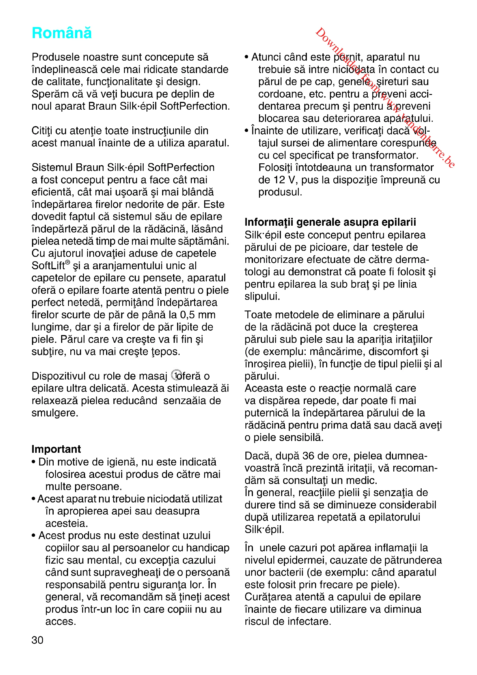 - Înainte de utilizare, verificaøi dacå vol- tajul sursei de alimentare corespunde cu cel specificat pe transformator. Folosiøi întotdeauna un transformator de 12 V, pus la dispoziøie împreunå cu produsul. Informaøii generale asupra epilarii Silk·épil este conceput pentru epilarea pårului de pe picioare, dar testele de monitorizare efectuate de cåtre derma- tologi au demonstrat cå poate fi folosit µi pentru epilarea la sub braø µi pe linia slipului. Toate metodele de eliminare a pårului de la rådåcinå pot duce la creµterea pårului sub piele sau la apariøia iritaøiilor (de exemplu: mâncårime, discomfort µi înroµirea pielii), în funcøie de tipul pielii µi al pårului. Aceasta este o reacøie normalå care va dispårea repede, dar poate fi mai puternicå la îndepårtarea pårului de la rådåcinå pentru prima datå sau dacå aveøi o piele sensibilå. Dacå, dupå 36 de ore, pielea dumnea- voastrå încå prezintå iritaøii, vå recoman- dåm så consultaøi un medic. În general, reacøiile pielii µi senzaøia de durere tind så se diminueze considerabil dupå utilizarea repetatå a epilatorului Silk·épil. În unele cazuri pot apårea inflamaøii la nivelul epidermei, cauzate de påtrunderea unor bacterii (de exemplu: când aparatul este folosit prin frecare pe piele). Curåøarea atentå a capului de epilare înainte de fiecare utilizare va diminua riscul de infectare.