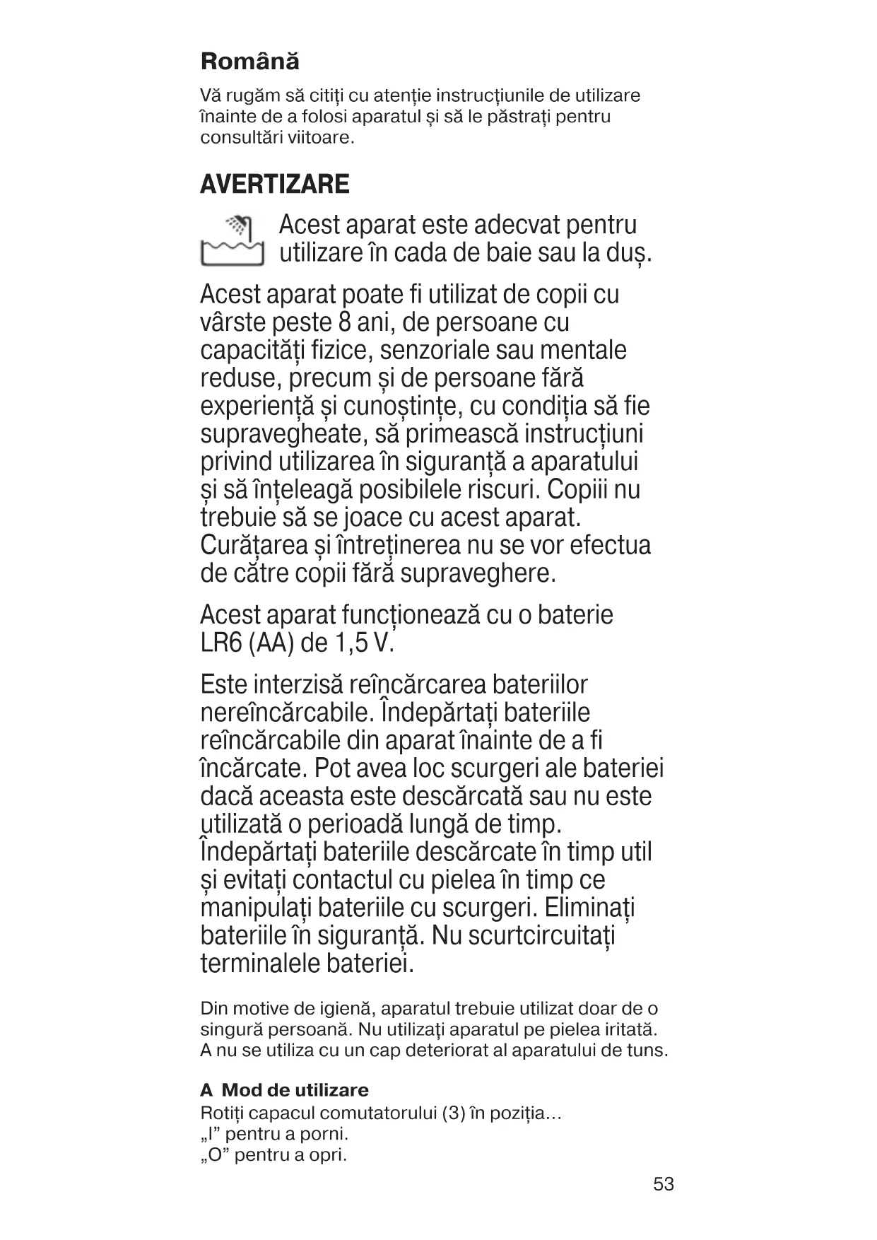 Unvan: Adres: Tel, Faks: e-posta: Kaşe ve İmza: Fatura Tarihi ve Sayısı: Teslim Yeri ve Tarihi: İthalatçı Firma: Procter & Gamble Tüketim Malları Sanayi A.Ş. Nida Kule – Kuzey, Barbaros Mahallesi Begonya Sokak No:3 34746 Ataşehir, İstanbul tarafından ithal edilmiştir. P&G Tüketici İlişkileri: 08502200911 www.pg.com.tr Braun Servis İstasyonları listemize internet sitemizden veya Tüketici Hizmetleri merkezimizi arayarak ulaşabilirsiniz. www.braun.com/tr 91050339_Body_Styler_BS_1000_EURO.indd 5291050339_Body_Styler_BS_1000_EURO.indd 52 19.02.20 13:0919.02.20 13:0953 Română Vă rugăm să citiţi cu atenţie instrucţiunile de utilizare înainte de a folosi aparatul și să le păstraţi pentru consultări viitoare. AVERTIZARE Acest aparat este adecvat pentru utilizare în cada de baie sau la duș. Acest aparat poate fi utilizat de copii cu vârste peste 8 ani, de persoane cu capacităţi fizice, senzoriale sau mentale reduse, precum și de persoane fără experienţă și cunoștinţe, cu condiţia să fie supravegheate, să primească instrucţiuni privind utilizarea în siguranţă a aparatului și să înţeleagă posibilele riscuri. Copiii nu trebuie să se joace cu acest aparat. Curăţarea și întreţinerea nu se vor efectua de către copii fără supraveghere. Acest aparat funcţionează cu o baterie LR6 (AA) de 1,5 V. Este interzisă reîncărcarea bateriilor nereîncărcabile. Îndepărtaţi bateriile reîncărcabile din aparat înainte de a fi încărcate. Pot avea loc scurgeri ale bateriei dacă aceasta este descărcată sau nu este utilizată o perioadă lungă de timp. Îndepărtaţi bateriile descărcate în timp util și evitaţi contactul cu pielea în timp ce manipulaţi bateriile cu scurgeri. Eliminaţi bateriile în siguranţă. Nu scurtcircuitaţi terminalele bateriei. Din motive de igienă, aparatul trebuie utilizat doar de o singură persoană. Nu utilizaţi aparatul pe pielea iritată. A nu se utiliza cu un cap deteriorat al aparatului de tuns. A Mod de utilizare Rotiţi capacul comutatorului (3) în poziţia... „I” pentru a porni. „O” pentru a opri. 91050339_Body_Styler_BS_1000_EURO.indd 5391050339_Body_Styler_BS_1000_EURO.indd 53 19.02.20 13:0919.02.20 13:0954 B Pentru tuns, ţineţi în poziţie verticală și deplasaţi în sensul opus direcţiei de creștere a părului. Puteţi atașa pieptenul pentru tuns (1) pentru a tăia firele de păr la lungimea de până la 4 mm. C Pentru conturare, ţineţi dispozitivul culcat. D Curăţare și întreţinere Folosiţi peria de curăţare (4) pentru a îndepărta firele de păr. Porniţi aparatul pentru a clăti capul de tuns (2) cu apă de la robinet. Pentru o clătire completă a interiorului, opriţi și deschideţi capul de tuns apăsând ferm pe dinţi. Pentru a ajuta la menţinerea performanţei superioare a aparatului, aplicaţi ulei pe aparatul de tuns după utilizarea pe piele umedă sau curăţare: Aplicaţi o picătură de ulei ușor pentru mecanisme pe aparatul de tuns, apoi porniţi-l, pentru a vă asigura că uleiul este distribuit uniform. E Înlocuirea bateriei Rotiţi capacul comutatorului (3) în poziţia ▼ și deschideţi compartimentul bateriei. Înlocuiţi bateria respectând polaritatea corectă. Închideţi capacul comutatorului conform ilustraţiei și blocaţi-l rotindu-l înapoi în poziţia „O”. Eliminare Acest produs include o baterie și/sau deșeuri electrice reciclabile. Pentru protejarea mediului, nu aruncaţi aparatul împreună cu deșeurile menajere, ci predaţi-l la punctele de colectare locale corespunzătoare. Instrucţiunile se pot modifica fără notificare prealabilă. Conform Hotãrârii nr. 482 din 1 aprilie 2004 privind stabilirea conditiilor de introducere pe piatã a aparatelor electrocasnice în functie de nivelul zgomotului transmis prin aer, valoarea de zgomot dB(A) pentru acest aparat este de 70 dB(A). Garanţie Acordăm o garanţie de 2 ani pentru acest produs, de la data livrării produsului. Durata medie de utilizare: 5 ani, cu condiţia respectării instrucţiunilor de utilizare și efectuării intervenţiilor tehnice numai de către personalul service-lui autorizat. În perioada de garanţie vom remedia gratuit neconformităţile aparatului, prin repararea sau înlocuirea produsului, după caz. In funcţie de 91050339_Body_Styler_BS_1000_EURO.indd 5491050339_Body_Styler_BS_1000_EURO.indd 54 19.02.20 13:0919.02.20 13:0955 disponibilitate, componentele de schimb pot avea o culoare diferită sau un model echivalent. Această garanţie este valabilă în orice ţara în care acest aparat este furnizat de către compania Braun sau de către distribuitorul desemnat al acesteia. Repararea sau înlocuirea produselor se va efectua în cadrul unei perioade rezonabile de timp (maxim 15 zile de la data aducerii la cunoștinţă a neconformităţii). Prezenta garanţie nu acoperă: defectele datorate utilizării necorespunzătoare, uzurii normale, precum și defectele care au un efect neglijabil asupra valorii sau funcţionării aparatului. Garanţia devine nulă dacă se efectuează reparaţii de către persoane neautorizate și dacă nu se utilizează componente originale Braun. Pentru a beneficia de service în perioada de garanţie, prezentaţi produsul împreună cu factura (bonul/chitanţa de cumpărare) la una dintre unităţile de service agreate.