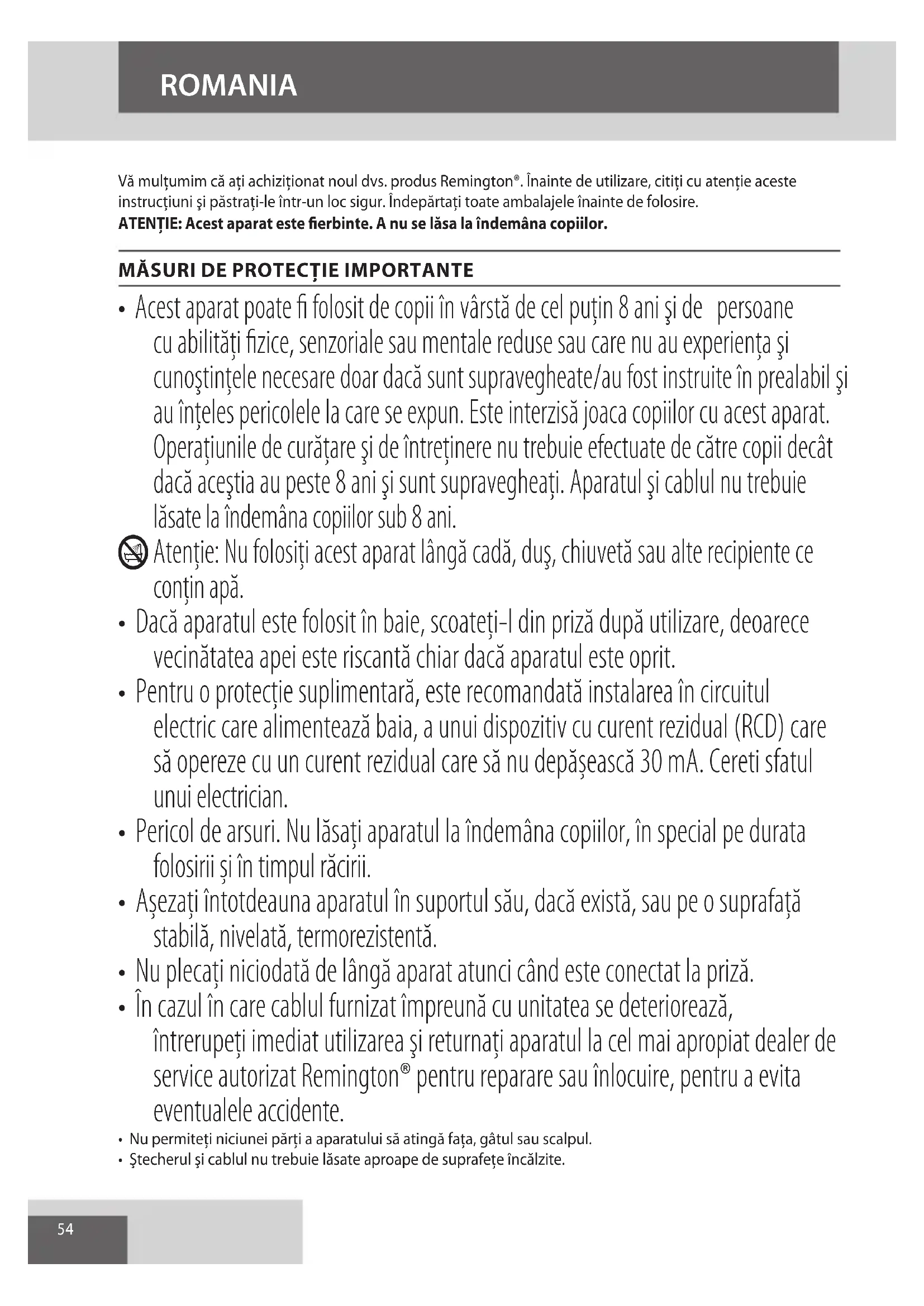 - În cazul în care cablul furnizat împreună cu unitatea se deteriorează, întrerupeţi imediat utilizarea şi returnaţi aparatul la cel mai apropiat dealer de service autorizat Remington® pentru reparare sau înlocuire, pentru a evita eventualele accidente.