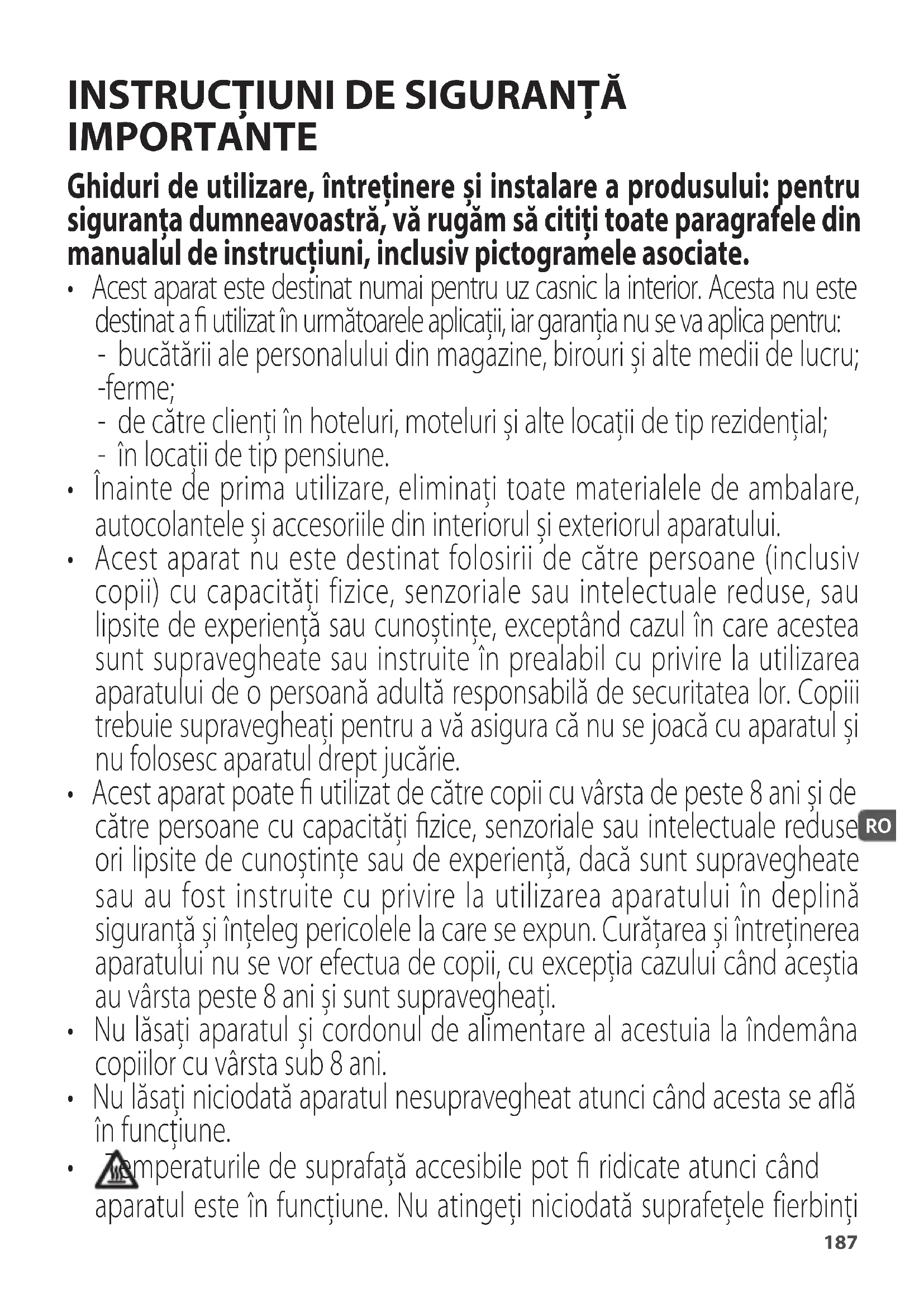 - Temperaturile de suprafață accesibile pot ridicate atunci când aparatul este în funcțiune. Nu atingeți niciodată suprafețele fierbinți RO188 ale aparatului.