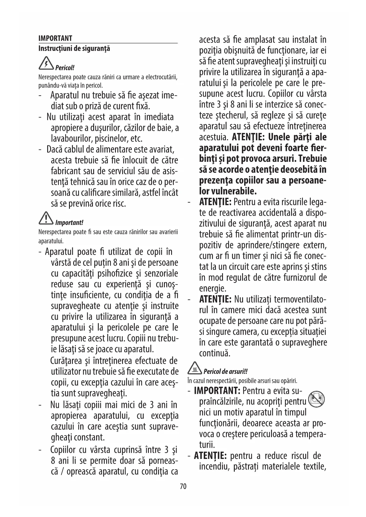 Изхвърляне на уреда Hе изхвърляйте уреда заедно с домакинските отпадъци, а го предайте в официален център за разделно събиране.70 IMPORTANT Instrucţiuni de siguranţă Pericol! Nerespectarea poate cauza răniri ca urmare a electrocutării, punându-vă viaţa în pericol. - Aparatul nu trebuie să e aşezat ime- diat sub o priză de curent xă. - Nu utilizaţi acest aparat în imediata apropiere a duşurilor, căzilor de baie, a lavabourilor, piscinelor, etc. - Dacă cablul de alimentare este avariat, acesta trebuie să e înlocuit de către fabricant sau de serviciul său de asis- tenţă tehnică sau în orice caz de o per- soană cu calicare similară, astfel încât să se prevină orice risc. Important! Nerespectarea poate sau este cauza rănirilor sau avarierii aparatului. - Aparatul poate utilizat de copii în vârstă de cel puțin 8 ani şi de persoane cu capacităţi psihozice şi senzoriale reduse sau cu experienţă şi cunoş- tinţe insuciente, cu condiţia de a supravegheate cu atenţie şi instruite cu privire la utilizarea în siguranţă a aparatului şi la pericolele pe care le presupune acest lucru. Copiii nu trebu- ie lăsaţi să se joace cu aparatul. Curăţarea şi întreţinerea efectuate de utilizator nu trebuie să e executate de copii, cu excepţia cazului în care aceş- tia sunt supravegheaţi. - Nu lăsaţi copiii mai mici de 3 ani în apropierea aparatului, cu excepţia cazului în care aceştia sunt suprave- gheaţi constant. - Copiilor cu vârsta cuprinsă între 3 şi 8 ani li se permite doar să porneas- că / oprească aparatul, cu condiţia ca acesta să e amplasat sau instalat în poziţia obişnuită de funcţionare, iar ei să e atent supravegheaţi şi instruiţi cu privire la utilizarea în siguranţă a apa- ratului şi la pericolele pe care le pre- supune acest lucru. Copiilor cu vârsta între 3 şi 8 ani li se interzice să conec- teze ştecherul, să regleze şi să cureţe aparatul sau să efectueze întreţinerea acestuia. ATENŢIE: Unele părţi ale aparatului pot deveni foarte er- binţi şi pot provoca arsuri. Trebuie să se acorde o atenţie deosebită în prezenţa copiilor sau a persoane- lor vulnerabile. - ATENŢIE: Pentru a evita riscurile lega- te de reactivarea accidentală a dispo- zitivului de siguranţă, acest aparat nu trebuie să e alimentat printr-un dis- pozitiv de aprindere/stingere extern, cum ar un timer şi nici să e conec- tat la un circuit care este aprins şi stins în mod regulat de către furnizorul de energie. - ATENȚIE: Nu utilizați termoventilato- rul în camere mici dacă acestea sunt ocupate de persoane care nu pot pără- si singure camera, cu excepția situației în care este garantată o supraveghere continuă. Pericol de arsuri!! În cazul nerespectării, posibile arsuri sau opăriri. - IMPORTANT: Pentru a evita su- praîncălzirile, nu acopriţi pentru nici un motiv aparatul în timpul funcţionării, deoarece aceasta ar pro- voca o creştere periculoasă a tempera- turii. - ATENȚIE: pentru a reduce riscul de incendiu, păstrați materialele textile,71 draperiile sau alte materiale inama- bile la o distanță de minimum 1 m de grătarul de ieşire a aerului. Funcţiuni de siguranţă - Dispozitiv de siguranţă: aparatul este dotat cu un dispozitiv de siguran- ţă care va întrerupe funcţionarea ter- moventilatorului în cazul unei supraîn- călziri accidentale (de ex. astuparea grilelor de intrare şi de ieşire a aerului, motorul care nu se roteşte sau se ro- teşte încet). Pentru repunerea în func- ţionare, este necesar să se scoată şte- cherul din priză pentru câteva minute, să se elimine cauza supraîncălzirii, iar apoi să se reintroducă ştecherul. Dacă aparatul continuă să nu funcționeze, contactați cel mai apropiat Centru de asistență De’Longhi. - Dispozitiv de siguranţă antirăs- turnare: Anumite modele sunt dota- te cu un dispozitiv antirăsturnare care stinge aparatul în cazul căderii acestu- ia. Pentru a pune din nou în funcţiune aparatul, este sucient să îl reaşezaţi în poziţia verticală. Notă: Acest simbol semnalează recomandări şi informaţii impor- tante pentru utilizator. - Utilizați aparatul pe o suprafață ori- zontală şi stabilă. - Utilizaţi aparatul întotdeauna şi doar în poziţie verticală. - Nu utilizați aparatul dacă acesta a căzut. - Nu utilizați aparatul dacă prezintă semne vizibile de deteriorare. - Nu se recomandă folosirea prelun- gitoarelor. În cazul în care folosirea lor este absolut necesară, urmaţi cu atenţie instrucţiunile anexate prelun- gitorului, făcând atenţie să nu se de- păşească limita de putere înscrisă pe acesta. - Nu puneţi aparatul să funcţioneze lân- gă pereţi mobile, perdele, etc. - Nu utilizaţi acest aparat într-o încăpe- re a cărei suprafaţă să e mai mică de 4m². - Înainte de a pune de o parte aparatul, controlaţi dacă este stins complet şi dacă ştecherul este scos din priză. Nu-l depozitaţi în medii care conţin praf. - Nu aşezaţi nimic deasupra aparatului. - Aparatul nu trebuie să e agățat în ni- ciun fel. - Anumite modele sunt prevăzute cu un dispozitiv care întârzie stingerea venti- latorului cu câteva secunde. - Nu folosiţi aparatul pentru a usca ru- fele. Nu blocați zona de intrare şi de ieşire a aerului (pericol de supraîncăl- zire). - Numai pentru aparatele destinate us- cării rufelor: acest aparat este destinat exclusiv uscării țesăturilor spălate în apă. Important!