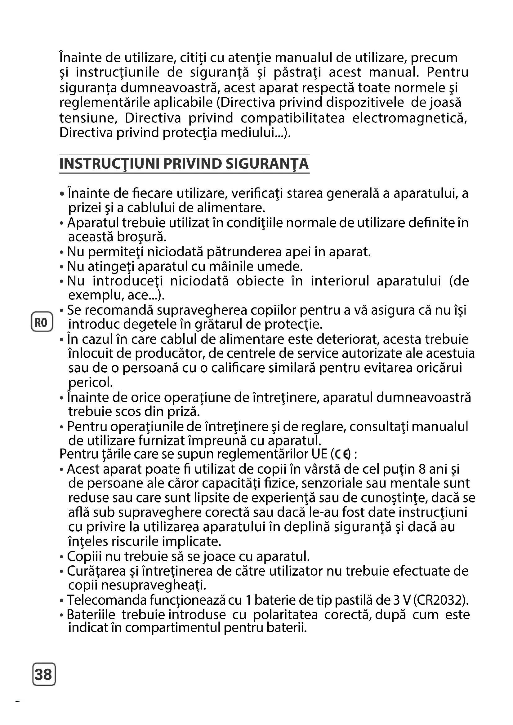 - Pentru a înlocui bateria telecomenzii, scoateți-o din compartiment, apoi instalați una nouă asigurându-vă că este instalată cu polaritățile negativă și pozitivă în direcția corectă, conform indicațiilor din compartimentul pentru baterii. La prima utilizare, există posibilitatea ca aparatul să degajeze, la scurte intervale de timp, fum şi un miros slab (fenomene obişnuite pentru toate aparatele noi: acestea vor dispărea după câteva minute). IMPORTANT: Dacă nu utilizaţi aparatul, vă recomandăm să îl opriţi şi să îl scoateţi din priză. Pentru a regla înălțimea aparatului, apăsați butonul de siguranță cu o mână în timp ce țineți piciorul aparatului cu cealaltă mână.RO