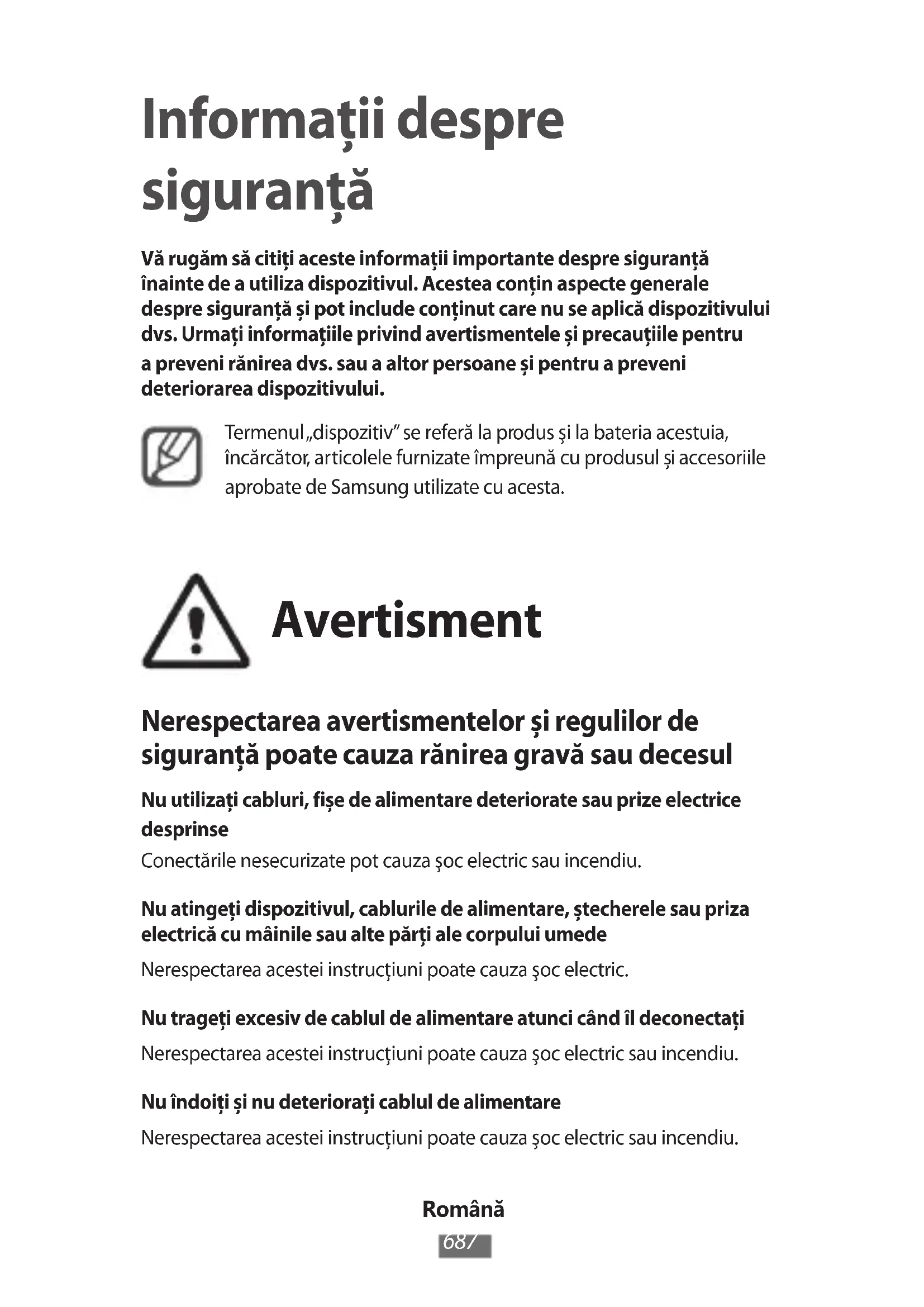Informaţii despre siguranţă Vă rugăm să citiţi aceste informaţii importante despre siguranţă înainte de a utiliza dispozitivul. Acestea conţin aspecte generale despre siguranţă şi pot include conţinut care nu se aplică dispozitivului dvs. Urmaţi informaţiile privind avertismentele şi precauţiile pentru a preveni rănirea dvs. sau a altor persoane şi pentru a preveni deteriorarea dispozitivului. Termenul „dispozitiv” se referă la produs și la bateria acestuia, încărcător, articolele furnizate împreună cu produsul și accesoriile aprobate de Samsung utilizate cu acesta. Avertisment Nerespectarea avertismentelor şi regulilor de siguranţă poate cauza rănirea gravă sau decesul Nu utilizaţi cabluri, fişe de alimentare deteriorate sau prize electrice desprinse Conectările nesecurizate pot cauza șoc electric sau incendiu. Nu atingeți dispozitivul, cablurile de alimentare, ştecherele sau priza electrică cu mâinile sau alte părți ale corpului umedeNerespectarea acestei instrucţiuni poate cauza șoc electric.Nu trageţi excesiv de cablul de alimentare atunci când îl deconectaţi Nerespectarea acestei instrucţiuni poate cauza șoc electric sau incendiu. Nu îndoiţi şi nu deterioraţi cablul de alimentare Nerespectarea acestei instrucţiuni poate cauza șoc electric sau incendiu.Română