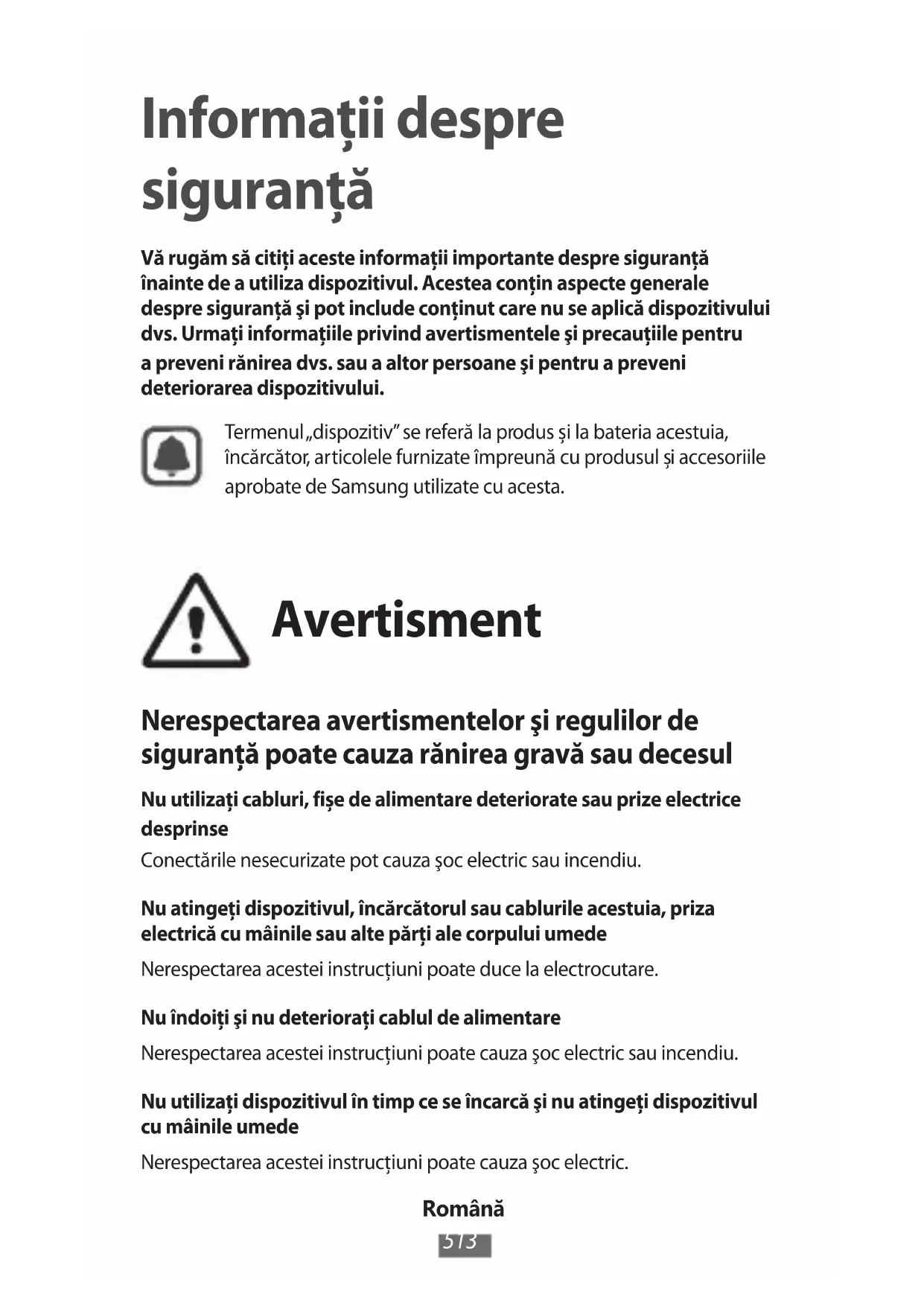 Informaţii despre siguranţă Vă rugăm să citiţi aceste informaţii importante despre siguranţă înainte de a utiliza dispozitivul. Acestea conţin aspecte generale despre siguranţă şi pot include conţinut care nu se aplică dispozitivului dvs. Urmaţi informaţiile privind avertismentele şi precauţiile pentru a preveni rănirea dvs. sau a altor persoane şi pentru a preveni deteriorarea dispozitivului. Termenul „dispozitiv” se referă la produs și la bateria acestuia, încărcător, articolele furnizate împreună cu produsul și accesoriile aprobate de Samsung utilizate cu acesta. Avertisment Nerespectarea avertismentelor şi regulilor de siguranţă poate cauza rănirea gravă sau decesul Nu utilizaţi cabluri, fișe de alimentare deteriorate sau prize electrice desprinse Conectările nesecurizate pot cauza şoc electric sau incendiu. Nu atingeți dispozitivul, încărcătorul sau cablurile acestuia, priza electrică cu mâinile sau alte părți ale corpului umedeNerespectarea acestei instrucţiuni poate duce la electrocutare.Nu îndoiţi şi nu deterioraţi cablul de alimentare Nerespectarea acestei instrucţiuni poate cauza şoc electric sau incendiu. Nu utilizaţi dispozitivul în timp ce se încarcă şi nu atingeţi dispozitivul cu mâinile umedeNerespectarea acestei instrucţiuni poate cauza şoc electric.Română