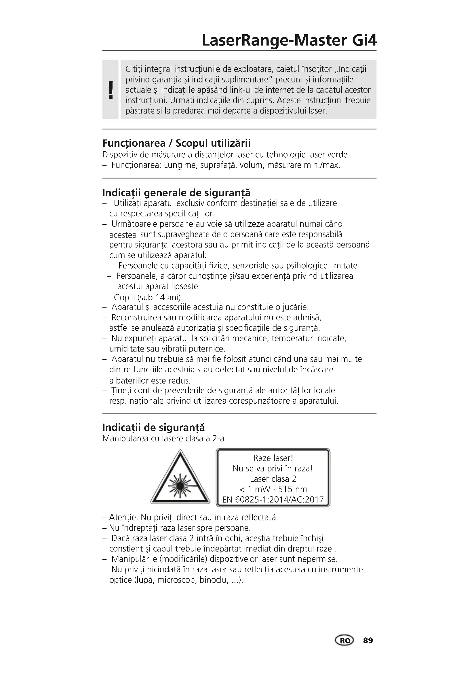 Funcţionarea / Scopul utilizării Indicaţii generale de siguranţă – Utilizaţi aparatul exclusiv conform destinaţiei sale de utilizare cu respectarea specicaţiilor. – Următoarele persoane au voie să utilizeze aparatul numai când acestea sunt supravegheate de o persoană care este responsabilă pentru siguranța acestora sau au primit indicații de la această persoană cum se utilizează aparatul: – Persoanele cu capacități zice, senzoriale sau psihologice limitate – Persoanele, a căror cunoștințe și/sau experiență privind utilizarea acestui aparat lipsește – Copiii (sub 14 ani). – Aparatul și accesoriile acestuia nu constituie o jucărie. – Reconstruirea sau modicarea aparatului nu este admisă, astfel se anulează autorizaţia şi specicaţiile de siguranţă. – Nu expuneţi aparatul la solicitări mecanice, temperaturi ridicate, umiditate sau vibraţii puternice. – Aparatul nu trebuie să mai e folosit atunci când una sau mai multe dintre funcțiile acestuia s-au defectat sau nivelul de încărcare a bateriilor este redus. – Ţineţi cont de prevederile de siguranţă ale autorităţilor locale resp. naţionale privind utilizarea corespunzătoare a aparatului. – Atenţie: Nu priviţi direct sau în raza reectată. – Nu îndreptaţi raza laser spre persoane. – Dacă raza laser clasa 2 intră în ochi, aceştia trebuie închişi conştient şi capul trebuie îndepărtat imediat din dreptul razei. – Manipulările (modicările) dispozitivelor laser sunt nepermise. – Nu priviți niciodată în raza laser sau reecția acesteia cu instrumente optice (lupă, microscop, binoclu, ...). Indicaţii de siguranţă Manipularea cu lasere clasa a 2-a Raze laser! Nu se va privi în raza! Laser clasa 2 < 1 mW · 515 nm EN 60825-1:2014/AC:2017 Dispozitiv de măsurare a distanțelor laser cu tehnologie laser verde – Funcţionarea: Lungime, suprafaţă, volum, măsurare min./max. Citiți integral instrucțiunile de exploatare, caietul însoțitor „Indicații privind garanția și indicații suplimentare“ precum și informațiile actuale și indicațiile apăsând link-ul de internet de la capătul acestor instrucțiuni. Urmați indicațiile din cuprins. Aceste instrucţiuni trebuie păstrate şi la predarea mai departe a dispozitivului laser.