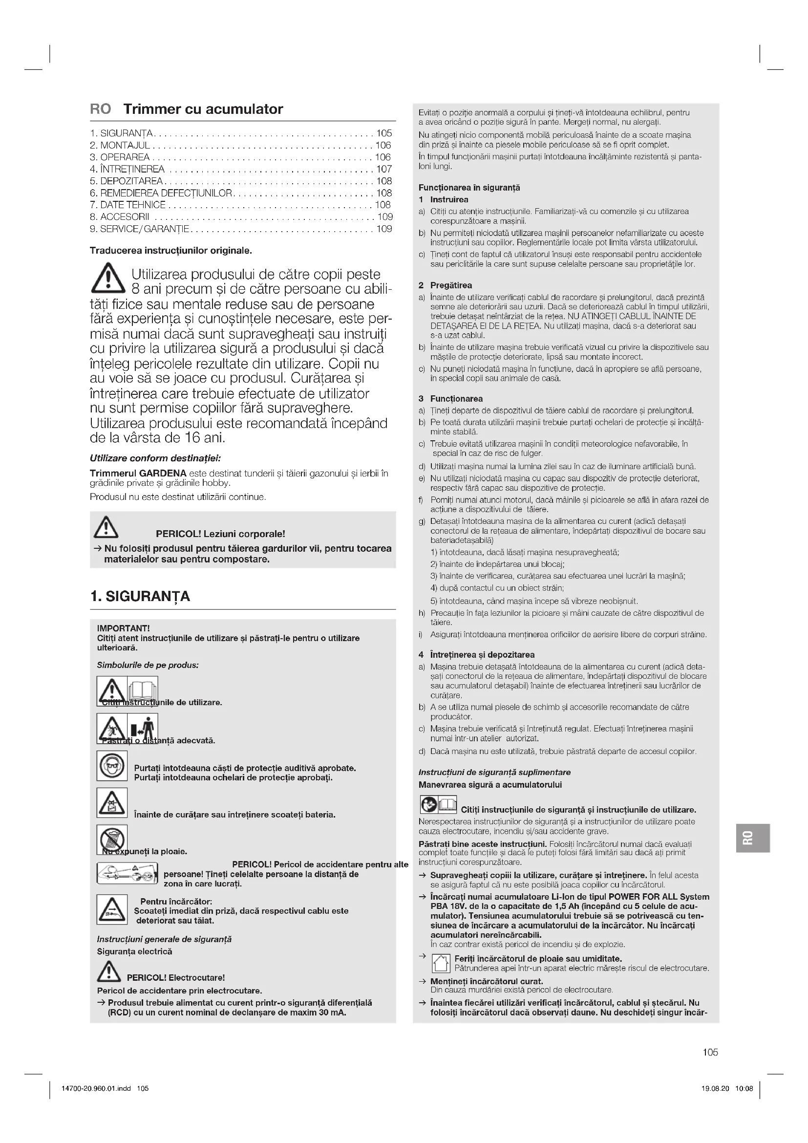 cătorul şi solicitați repararea acestuia numai de către personal de specialitate calificat şi numai cu piese de schimb originale. Încărcătoarele, cablurile și ștecărele deteriorate cresc riscul electrocutării. v Nu operați încărcătorul pe o bază uşor inflamabilă (de ex. hârtie, mate- riale textile etc.) resp. într-un mediu inflamabil. Există pericol de incendiu din cauza încălzirii încărcătorului la încărcare. v Dacă este nevoie de înlocuirea cablului de alimentare, aceasta trebuie efec- tuată de către GARDENA sau de un service autorizat pentru scule electrice GARDENA, pentru a evita potenialele ameninări la adresa siguranei. v Nu operați produsul pe durata încărcării acestuia. v Aceste instrucțiuni de siguranță sunt valabile numai pentru acumu- latorii Li-Ion ai POWER FOR ALL Systems PBA 18V. v Folosiți acumulatorul numai pentru produsele producătorului de sistem POWER FOR ALL. Numai în felul acesta este protejat acumulatorul contra suprasolicitării periculoase. v Încărcați acumulatorii folosiți numai cu încărcătoare recomandate de producător. Încărcătorul, potrivit pentru un anumit tip de acumulator, con- stituie pericol de incendiu dacă se folosește cu alte tipuri de acumulatori. v Acumulatorul este încărcat parțial la livrare. Pentru asigurarea capacităii complete a acumulatorului, încărcai complet acumulatorul în încărcător înaintea primei utilizări. v Păstrați acumulatorii într-un loc neaccesibil copiilor. v Nu deschideți acumulatorul. Există pericol de scurtcircuitare. v La deteriorare sau utilizare neconformă a acumulatorului pot rezulta vapori. Acumulatorul poate să ardă sau poate exploda. Alimentai cu aer proaspăt și consultai un medic în caz de afeciuni. Vaporii pot irita căile respiratorii. v În cazul unei utilizări necorespunzătoare sau dacă acumulatorul este deteriorat se poate scurge lichid inflamabil din acumulator. Evitați contactul cu acest lichid. În cazul unui contact accidental spălați suprafața atinsă cu apă. Dacă lichidul ajunge în ochi solicitați în plus ajutor medical. Lichidele scăpate din acumulator pot cauza iritarea pielii sau arsuri. v Dacă acumulatorul este defect, se poate scurge lichid şi se pot uda obiectele învecinate. Verificați piesele afectate. Curăai-le sau înlocuii-le, dacă este cazul. v Nu scurtcircuitați acumulatorul. Feriți acumulatorul neutilizat de agra- fe, monede, chei, cuie, şuruburi sau alte piese metalice mici, care pot cauza scurtcircuitarea contactelor. Scurtcircuitarea contactelor acumulatorului poate cauza arsuri sau incendii. v Este posibilă deteriorarea acumulatorului din cauza obiectelor ascuți- te, ca de ex. cuie sau şurubelnițe sau prin forțe externe. Se poate produce un scurtcircuit intern, iar acumulatorul poate să ardă, să scoată fum, să explodeze sau să se supraîncălzească. v Nu efectuați niciodată lucrări de întreținere asupra acumulatorilor deteriorați. Toate lucrările de întreinere ale acumulatorilor trebuie să se realizeze numai de către producător sau prin unităile de service autorizate.