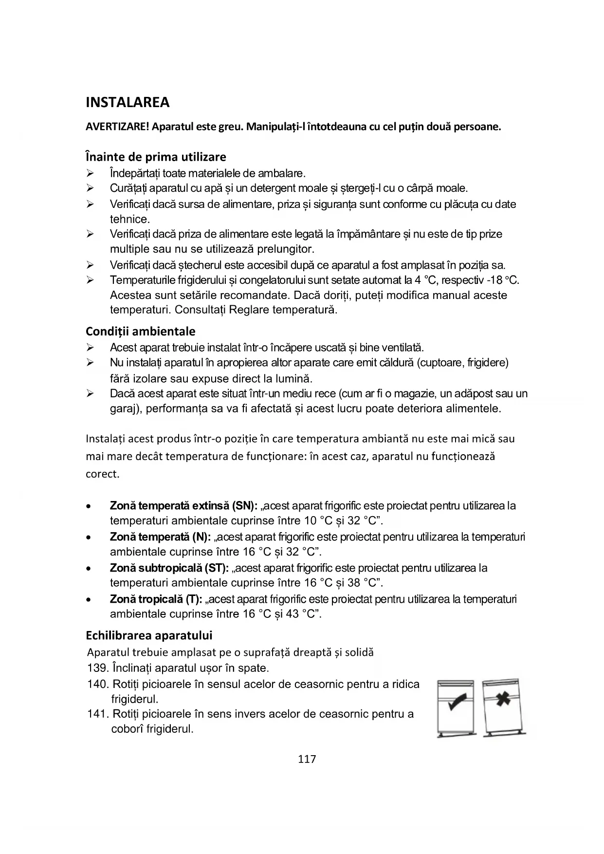 - Zonă tropicală (T): „acest aparat frigorific este proiectat pentru utilizarea la temperaturi ambientale cuprinse între 16 °C și 43 °C”. Echilibrarea aparatului Aparatul trebuie amplasat pe o suprafață dreaptă și solidă