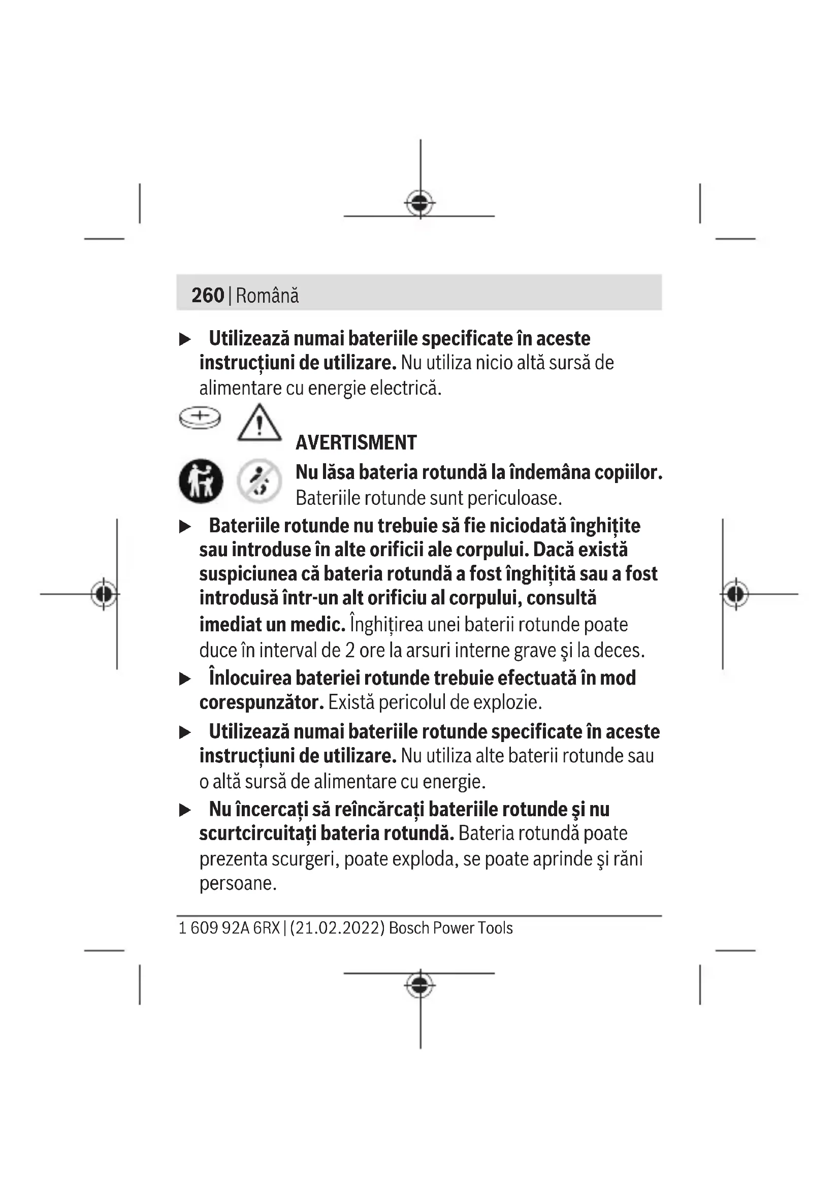 Қате жолмен кәдеге жаратылған ескі электрлік және электрондық құрылғылар қауіпті заттардың болу мүмкіндігіне байланысты қоршаған ортаға және адам денсаулығына зиянды әсер тигізуі мүмкін. Română Instrucţiuni de siguranţă Citeşte şi respectă toate instrucţiunile pentru a putea lucra în condiţii de maximă siguranţă cuGCY42. Păstrează în condiţii optime aceste instrucţiuni şi predă-le împreună cuGCY42 următorului posesor al acestuia. Bosch Power Tools 1 609 92A 6RX | (21.02.2022)260 | Română u Utilizează numai bateriile specificate în aceste instrucţiuni de utilizare. Nu utiliza nicio altă sursă de alimentare cu energie electrică. AVERTISMENT Nu lăsa bateria rotundă la îndemâna copiilor. Bateriile rotunde sunt periculoase. u Bateriile rotunde nu trebuie să fie niciodată înghiţite sau introduse în alte orificii ale corpului. Dacă există suspiciunea că bateria rotundă a fost înghiţită sau a fost introdusă într-un alt orificiu al corpului, consultă imediat un medic. Înghiţirea unei baterii rotunde poate duce în interval de 2 ore la arsuri interne grave şi la deces. u Înlocuirea bateriei rotunde trebuie efectuată în mod corespunzător. Există pericolul de explozie. u Utilizează numai bateriile rotunde specificate în aceste instrucţiuni de utilizare. Nu utiliza alte baterii rotunde sau o altă sursă de alimentare cu energie. u Nu încercaţi să reîncărcaţi bateriile rotunde şi nu scurtcircuitaţi bateria rotundă. Bateria rotundă poate prezenta scurgeri, poate exploda, se poate aprinde şi răni persoane. 1 609 92A 6RX | (21.02.2022) Bosch Power ToolsRomână | 261 u Scoateţi şi eliminaţi în mod corespunzător bateriile rotunde descărcate. Bateriile rotunde descărcate pot prezenta scurgeri şi pot cauza defectarea produsului sau pot răni persoane. u Nu supraîncălziţi bateria rotundă şi nu o aruncaţi în foc. Bateria rotundă poate prezenta scurgeri, poate exploda, se poate aprinde şi răni persoane. u Nu deterioraţi bateria rotundă şi nu o dezasamblaţi. Bateria rotundă poate prezenta scurgeri, poate exploda, se poate aprinde şi răni persoane. u Nu aduceţi o baterie rotundă defectă în contact cu apa. În combinație cu apa, litiul scurs din aceasta poate produce hidrogen şi provoca prin aceasta o explozie sau rănirea persoanelor. Marca verbală Bluetooth®, precum şi siglele sunt mărci înregistrate şi proprietatea Bluetooth SIG, Inc. Orice utilizare a acestei mărci verbale/acestor sigle de către Robert Bosch Power Tools GmbH se realizează sub licenţă. u Nu mai continuaţi să folosiţi modulul Bluetooth®, în cazul în care capacul nu se mai închide, scoateţi bateria rotundă din acesta şi daţi-l la reparat. Bosch Power Tools 1 609 92A 6RX | (21.02.2022)262 | Română Descrierea produsului şi a performanţelor sale Utilizare conform destinaţiei Bluetooth® Low Energy Module GCY42 permite atât personalizarea şi verificarea stării sculei electrice, cât şi transmiterea setărilor şi datelor pe baza tehnologiei fără fir Bluetooth®. Transferul datelor trebuie acceptat de utilizator. În aplicaţia Bosch Toolbox şi în instrucţiunile de utilizare a sculei electrice utilizate sunt disponibile informaţii privind funcţiile de conectivitate oferite. Componentele ilustrate Numerotarea componentelor ilustrate se referă la schiţele de la paginile grafice. (1) Baterii rotunde (2) Bluetooth® Low Energy Module GCY 42 (3) Suport de înlocuire