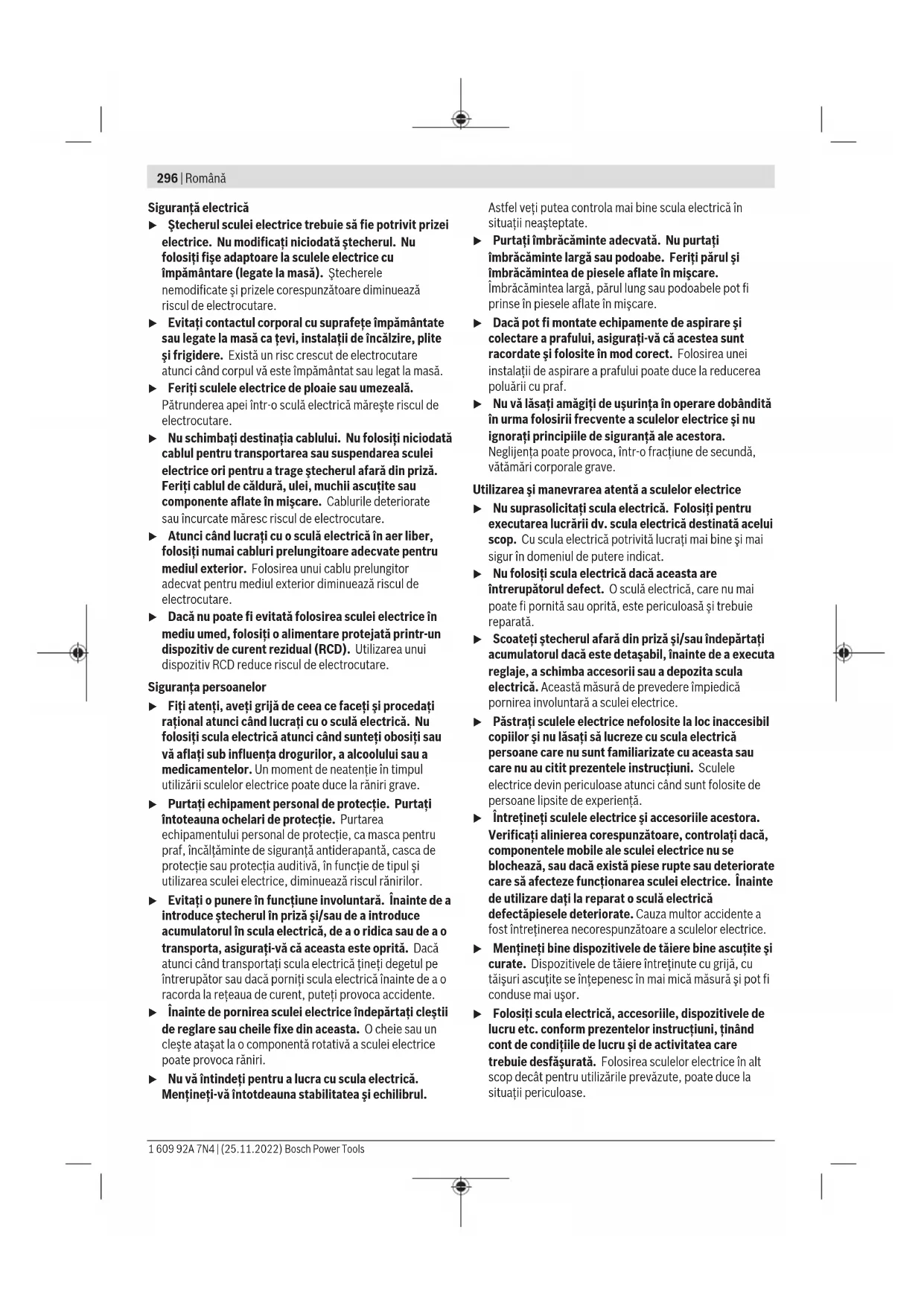 – электр құралына артық жүктеме түскеннен орын алған ақаулар. (Құралға артық жүктеме түсудің шартсыз белгілеріне мыналар жатады: құбылу түсінің пайда болуы немесе электр құралы бөліктері мен түйіндерінің деформациясы немесе қорытылуы, жоғары температура әсерінен электр қозғалтқышындағы сымдар оқшаулағышының қараюы немесе көмірленуі.) Кәдеге жарату Электр құралдар, жабдықтар және бумаларын айналаны қорғайтын кәдеге жаратуға апару қажет. Электр құралдарды үй қоқысына тастамаңыз! Тек қана ЕО елдері үшін: Электр және электрондық ескі құралдар бойынша Еуропа 2012/19/EU ережесі және ұлттық заңдарға сайкес пайдалануға жарамсыз электр құралдары бөлек жиналып, кәдеге жаратылуы қажет. Қате жолмен кәдеге жаратылған ескі электрлік және электрондық құрылғылар қауіпті заттардың болу мүмкіндігіне байланысты қоршаған ортаға және адам денсаулығына зиянды әсер тигізуі мүмкін. Română Instrucţiuni de siguranţă Indicaţii generale de avertizare pentru scule electrice AVERTIS- MENT Citiţi toate avertizările, instrucţiunile, ilustraţiile şi specificaţiile puse la dispoziţie împreună cu această sculă electrică. Nerespectarea instrucţiunilor menţionate mai jos poate duce la electrocutare, incendiu şi/sau vătămări corporale grave. Păstraţi toate indicaţiile de avertizare şi instrucţiunile în vederea utilizărilor viitoare. Termenul "sculă electrică" folosit în indicaţiile de avertizare se referă la sculele electrice alimentate de la reţea (cu cablu de alimentare) sau la sculele electrice cu acumulator (fără cablu de alimentare). Siguranţa la locul de muncă u Menţineţi‑vă sectorul de lucru curat şi bine iluminat. Dezordinea sau sectoarele de lucru neluminate pot duce la accidente. u Nu lucraţi cu sculele electrice în mediu cu pericol de explozie, în care există lichide, gaze sau pulberi inflamabile. Sculele electrice generează scântei care pot aprinde praful sau vaporii. u Nu permiteţi accesul copiilor şi al spectatorilor în timpul utilizării sculei electrice. Dacă vă este distrasă atenţia puteţi pierde controlul. Bosch Power Tools 1 609 92A 7N4 | (25.11.2022)296 | Română Siguranţă electrică u Ştecherul sculei electrice trebuie să fie potrivit prizei electrice. Nu modificaţi niciodată ştecherul. Nu folosiţi fişe adaptoare la sculele electrice cu împământare (legate la masă). Ştecherele nemodificate şi prizele corespunzătoare diminuează riscul de electrocutare. u Evitaţi contactul corporal cu suprafeţe împământate sau legate la masă ca ţevi, instalaţii de încălzire, plite şi frigidere. Există un risc crescut de electrocutare atunci când corpul vă este împământat sau legat la masă. u Feriţi sculele electrice de ploaie sau umezeală. Pătrunderea apei într‑o sculă electrică măreşte riscul de electrocutare. u Nu schimbaţi destinaţia cablului. Nu folosiţi niciodată cablul pentru transportarea sau suspendarea sculei electrice ori pentru a trage ştecherul afară din priză. Feriţi cablul de căldură, ulei, muchii ascuţite sau componente aflate în mişcare. Cablurile deteriorate sau încurcate măresc riscul de electrocutare. u Atunci când lucraţi cu o sculă electrică în aer liber, folosiţi numai cabluri prelungitoare adecvate pentru mediul exterior. Folosirea unui cablu prelungitor adecvat pentru mediul exterior diminuează riscul de electrocutare. u Dacă nu poate fi evitată folosirea sculei electrice în mediu umed, folosiţi o alimentare protejată printr-un dispozitiv de curent rezidual (RCD). Utilizarea unui dispozitiv RCD reduce riscul de electrocutare. Siguranţa persoanelor u Fiţi atenţi, aveţi grijă de ceea ce faceţi şi procedaţi raţional atunci când lucraţi cu o sculă electrică. Nu folosiţi scula electrică atunci când sunteţi obosiţi sau vă aflaţi sub influenţa drogurilor, a alcoolului sau a medicamentelor. Un moment de neatenţie în timpul utilizării sculelor electrice poate duce la răniri grave. u Purtaţi echipament personal de protecţie. Purtaţi întoteauna ochelari de protecţie. Purtarea echipamentului personal de protecţie, ca masca pentru praf, încălţăminte de siguranţă antiderapantă, casca de protecţie sau protecţia auditivă, în funcţie de tipul şi utilizarea sculei electrice, diminuează riscul rănirilor. u Evitaţi o punere în funcţiune involuntară. Înainte de a introduce ştecherul în priză şi/sau de a introduce acumulatorul în scula electrică, de a o ridica sau de a o transporta, asiguraţi‑vă că aceasta este oprită. Dacă atunci când transportaţi scula electrică ţineţi degetul pe întrerupător sau dacă porniţi scula electrică înainte de a o racorda la reţeaua de curent, puteţi provoca accidente. u Înainte de pornirea sculei electrice îndepărtaţi cleştii de reglare sau cheile fixe din aceasta. O cheie sau un cleşte ataşat la o componentă rotativă a sculei electrice poate provoca răniri. u Nu vă întindeţi pentru a lucra cu scula electrică. Menţineţi-vă întotdeauna stabilitatea şi echilibrul. Astfel veţi putea controla mai bine scula electrică în situaţii neaşteptate. u Purtaţi îmbrăcăminte adecvată. Nu purtaţi îmbrăcăminte largă sau podoabe. Feriţi păru