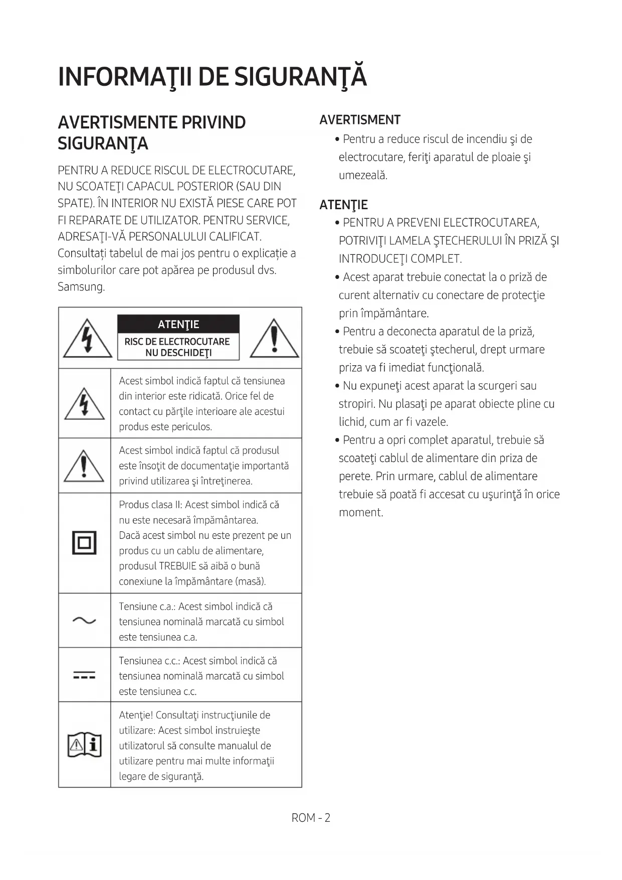 AVERTISMENTE PRIVIND SIGURANŢA PENTRU A REDUCE RISCUL DE ELECTROCUTARE, NU SCOATEŢI CAPACUL POSTERIOR (SAU DIN SPATE). ÎN INTERIOR NU EXISTĂ PIESE CARE POT FI REPARATE DE UTILIZATOR. PENTRU SERVICE, ADRESAŢI-VĂ PERSONALULUI CALIFICAT. Consultați tabelul de mai jos pentru o explicație a simbolurilor care pot apărea pe produsul dvs. Samsung. ATENŢIE RISC DE ELECTROCUTARE NU DESCHIDEŢIAcest simbol indică faptul că tensiunea din interior este ridicată. Orice fel de contact cu părţile interioare ale acestui produs este periculos.Acest simbol indică faptul că produsul este însoţit de documentaţie importantă privind utilizarea şi întreţinerea.Produs clasa II: Acest simbol indică că nu este necesară împământarea. Dacă acest simbol nu este prezent pe un produs cu un cablu de alimentare, produsul TREBUIE să aibă o bună conexiune la împământare (masă). Tensiune c.a.: Acest simbol indică că tensiunea nominală marcată cu simbol este tensiunea c.a.Tensiunea c.c.: Acest simbol indică că tensiunea nominală marcată cu simbol este tensiunea c.c.Atenţie! Consultaţi instrucţiunile de utilizare: Acest simbol instruieşte utilizatorul să consulte manualul de utilizare pentru mai multe informaţii legare de siguranţă. AVERTISMENT