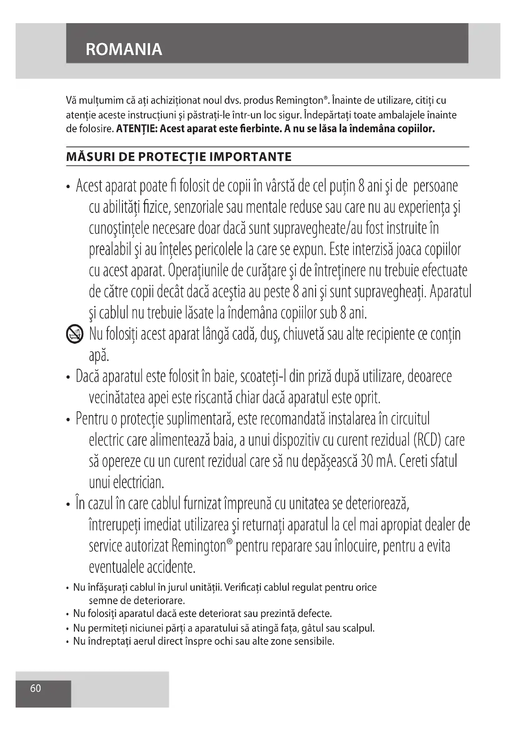 - În cazul în care cablul furnizat împreună cu unitatea se deteriorează, întrerupeţi imediat utilizarea şi returnaţi aparatul la cel mai apropiat dealer de service autorizat Remington® pentru reparare sau înlocuire, pentru a evita eventualele accidente.