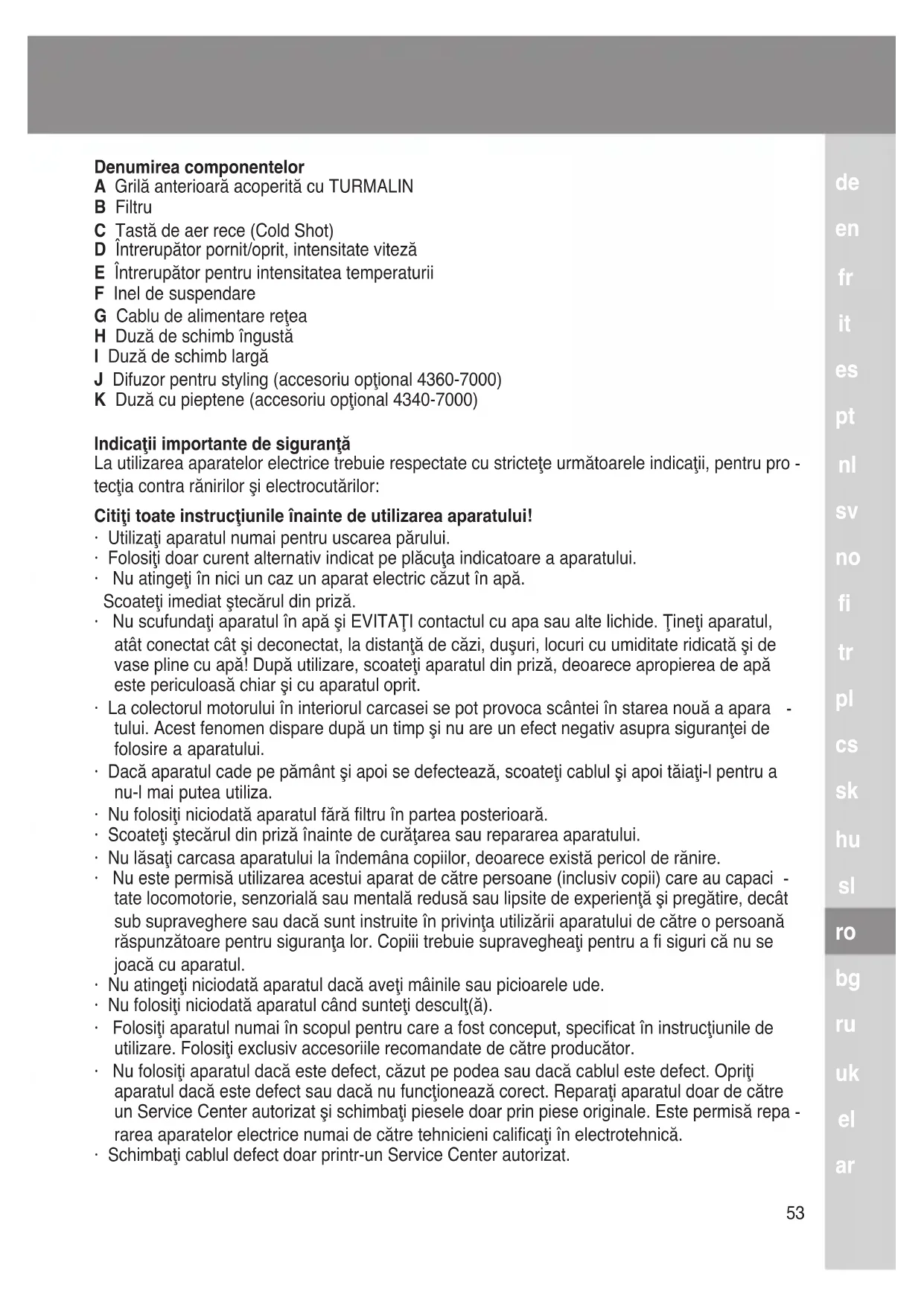 Denumirea componentelor A Grilă anterioară acoperită cu TURMALIN B Filtru C Tastă de aer rece (Cold Shot) D Întrerupător pornit/oprit, intensitate viteză E Întrerupător pentru intensitatea temperaturii F Inel de suspendare G Cablu de alimentare reţea H Duză de schimb îngustă I Duză de schimb largă J Difuzor pentru styling (accesoriu opţional 4360-7000) K Duză cu pieptene (accesoriu opţional 4340-7000) Indicaţii importante de siguranţă La utilizarea aparatelor electrice trebuie respectate cu stricteţe următoarele indicaţii, pentru pro