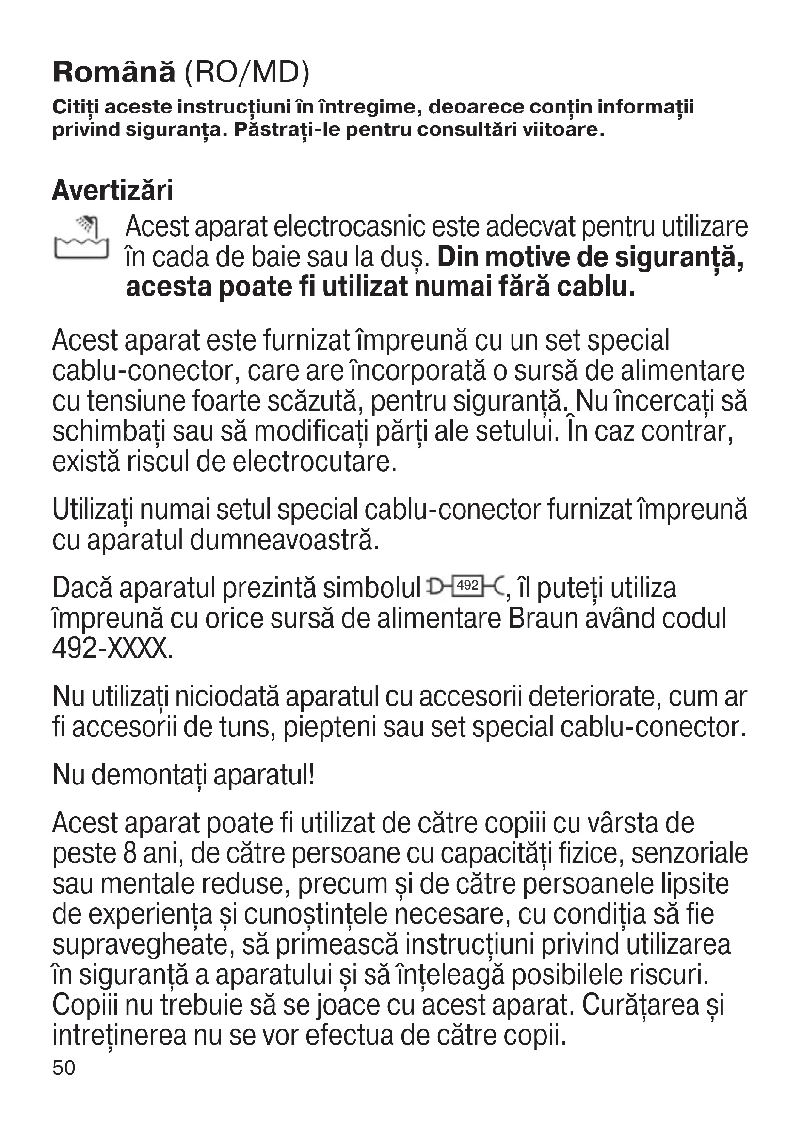 Unvan: Adres: Tel, Faks: e-posta: Kaşe ve İmza: Fatura Tarihi ve Sayısı: Teslim Yeri ve Tarihi: İthalatçı Firma: Procter & Gamble Tüketim Malları Sanayi A.Ş. Nida Kule – Kuzey, Barbaros Mahallesi Begonya Sokak No:3 34746 Ataşehir, İstanbul tarafından ithal edilmiştir. P&G Tüketici İlişkileri: 08502200911 www.pg.com.tr Braun Servis İstasyonları listemize internet sitemizden veya Tüketici Hizmetleri merkezimizi arayarak ulaşabilirsiniz. www.braun.com/tr 90618559_MGK7221_7220_7920_MGK5280_CEEMEA.indd 4990618559_MGK7221_7220_7920_MGK5280_CEEMEA.indd 49 21.05.19 10:2921.05.19 10:29 Business Use - P&G AUTHORIZED POA-00133196 Rev 001 Effective Date 2019-05-24 Printed 2022-03-31 Page 49 of 8050 Română (RO/MD) Citiți aceste instrucțiuni în întregime, deoarece conțin informații privind siguranța. Păstrați-le pentru consultări viitoare. Avertizări Acest aparat electrocasnic este adecvat pentru utilizare în cada de baie sau la duș. Din motive de siguranță, acesta poate fi utilizat numai fără cablu. Acest aparat este furnizat împreună cu un set special cablu-conector, care are încorporată o sursă de alimentare cu tensiune foarte scăzută, pentru siguranţă. Nu încercaţi să schimbaţi sau să modificaţi părţi ale setului. În caz contrar, există riscul de electrocutare. Utilizaţi numai setul special cablu-conector furnizat împreună cu aparatul dumneavoastră. Dacă aparatul prezintă simbolul