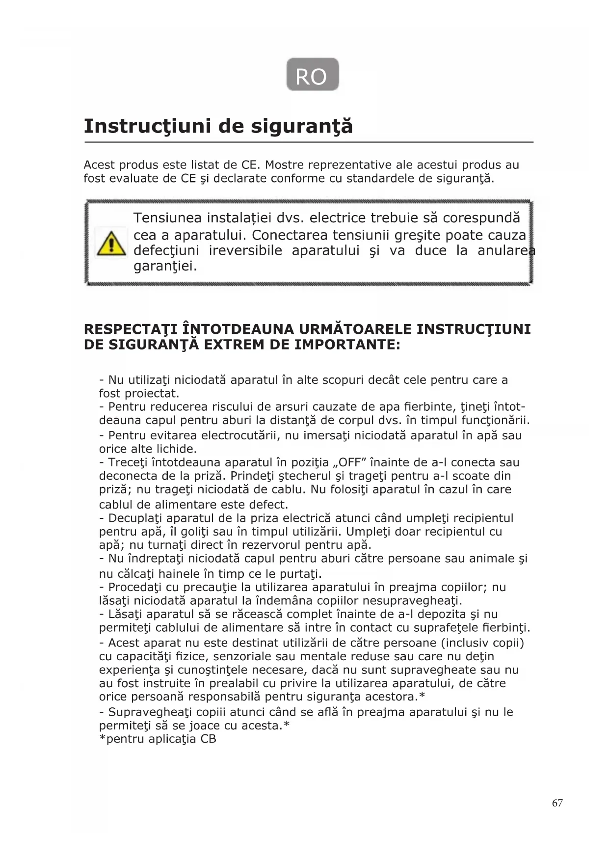 Instrucţiuni de siguranţă RESPECTAŢI ÎNTOTDEAUNA URMĂTOARELE INSTRUCŢIUNI DE SIGURANŢĂ EXTREM DE IMPORTANTE: Acest produs este listat de CE. Mostre reprezentative ale acestui produs au fost evaluate de CE şi declarate conforme cu standardele de siguranţă. - Nu utilizaţi niciodată aparatul în alte scopuri decât cele pentru care a fost proiectat. - Pentru reducerea riscului de arsuri cauzate de apa erbinte, ţineţi întot- deauna capul pentru aburi la distanţă de corpul dvs. în timpul funcţionării. - Pentru evitarea electrocutării, nu imersaţi niciodată aparatul în apă sau orice alte lichide. - Treceţi întotdeauna aparatul în poziţia „OFF” înainte de a-l conecta sau deconecta de la priză. Prindeţi ştecherul şi trageţi pentru a-l scoate din priză; nu trageţi niciodată de cablu. Nu folosiţi aparatul în cazul în care cablul de alimentare este defect. - Decuplaţi aparatul de la priza electrică atunci când umpleţi recipientul pentru apă, îl goliţi sau în timpul utilizării. Umpleţi doar recipientul cu apă; nu turnaţi direct în rezervorul pentru apă. - Nu îndreptaţi niciodată capul pentru aburi către persoane sau animale şi nu călcaţi hainele în timp ce le purtaţi. - Procedaţi cu precauţie la utilizarea aparatului în preajma copiilor; nu lăsaţi niciodată aparatul la îndemâna copiilor nesupravegheaţi. - Lăsaţi aparatul să se răcească complet înainte de a-l depozita şi nu permiteţi cablului de alimentare să intre în contact cu suprafeţele erbinţi. - Acest aparat nu este destinat utilizării de către persoane (inclusiv copii) cu capacităţi zice, senzoriale sau mentale reduse sau care nu deţin experienţa şi cunoştinţele necesare, dacă nu sunt supravegheate sau nu au fost instruite în prealabil cu privire la utilizarea aparatului, de către orice persoană responsabilă pentru siguranţa acestora.* - Supravegheaţi copiii atunci când se aă în preajma aparatului şi nu le permiteţi să se joace cu acesta.* *pentru aplicaţia CB Tensiunea instalației dvs. electrice trebuie să corespundă cea a aparatului. Conectarea tensiunii greşite poate cauza defecţiuni ireversibile aparatului şi va duce la anularea garanţiei.68 - Acest aparat poate utilizat de copii cu vârsta de cel puţin 14 ani şi persoane cu capacităţi zice, senzoriale sau mentale reduse sau care nu deţin experienţa sau cunoştinţele necesare doar dacă sunt supravegheate sau beneciază de instrucţiuni cu privire la utilizarea în siguranţă a aparatului şi înţeleg pericolele specice. - Nu permiteţi copiilor să se joace cu aparatul. - Operaţiunile de curăţare şi cele de întreţinere care revin utilizatorului nu trebuie să e efectu- ate de copii nesupravegheaţi. - Pentru utilizarea în condiţii optime a aparatu- lui, consultaţi secţiunile „Întreţinere” şi „umplere” din ghidul de pornire rapidă. - În cazul în care cablul de alimentare este deteriorat, acesta trebuie să e înlocuit de către producător, reprezentantul de service al acestuia sau de către persoane cu calicare similară, pentru evitarea pericolelor. - Procedaţi cu atenţie atunci când utilizaţi aparatul, din pricina emisiilor de aburi. - Decuplaţi aparatul de la priza electrică atunci când umpleţi recipientul pentru apă, îl curăţaţi, goliţi sau atunci când acesta nu este în uz. RO69
